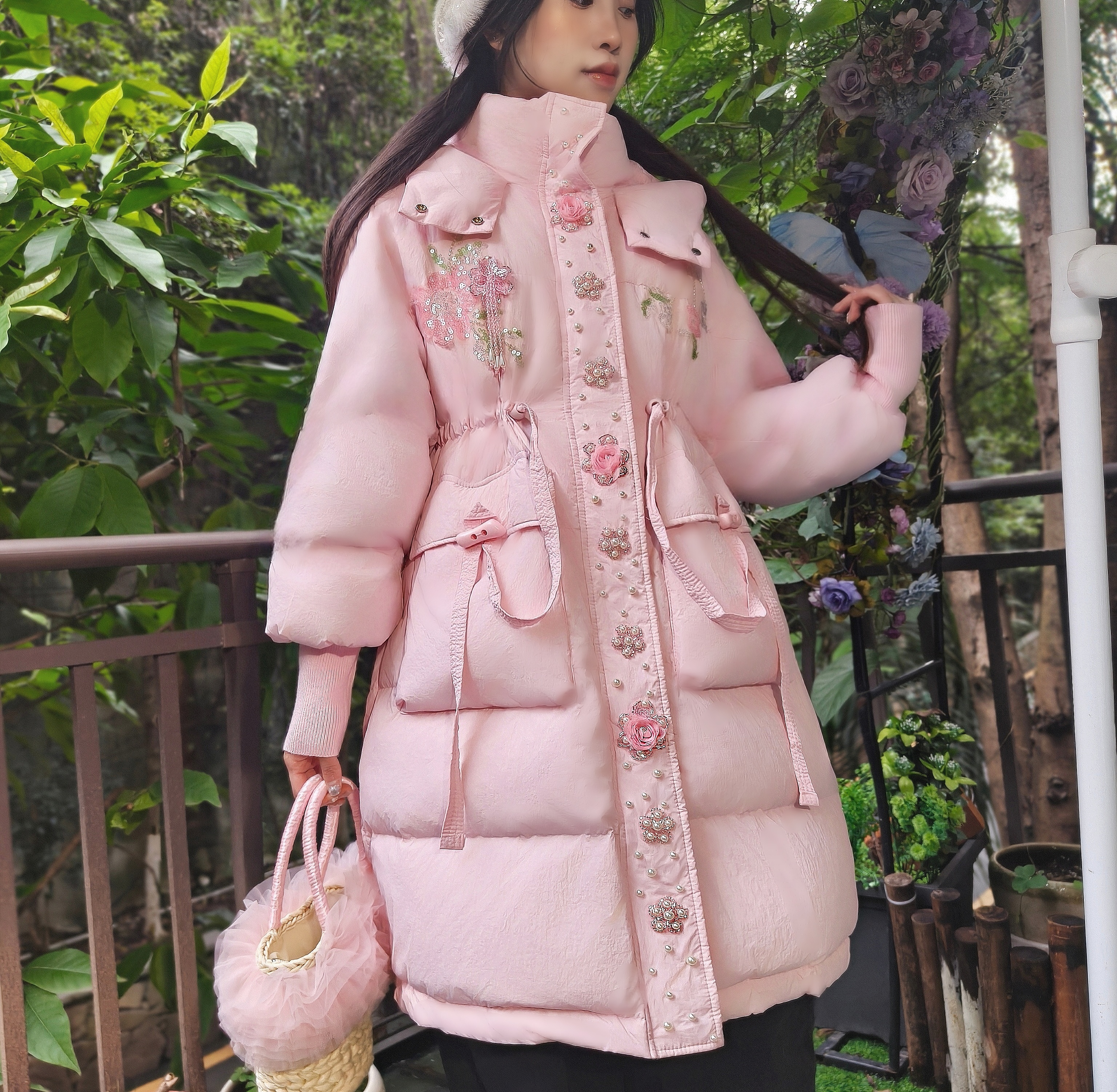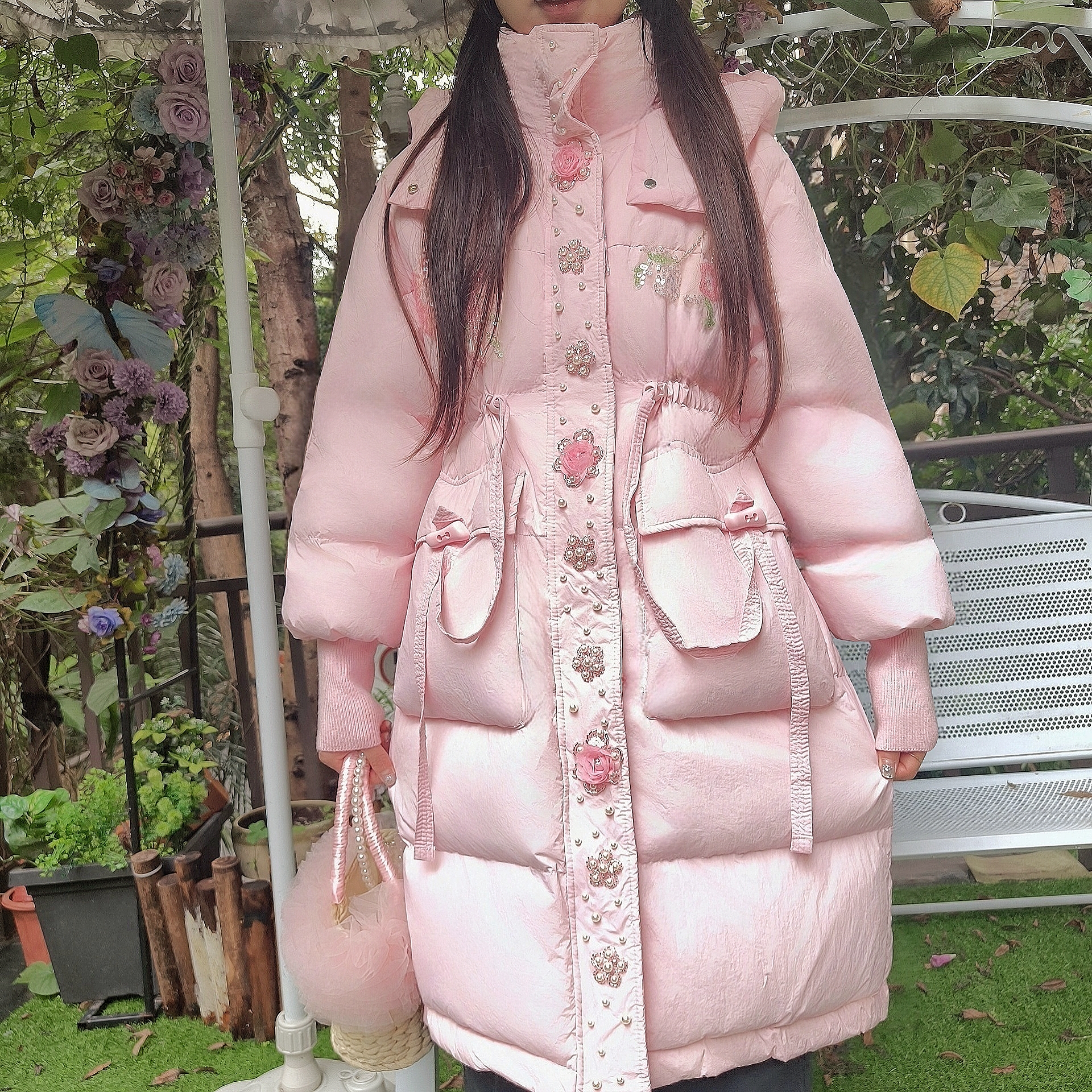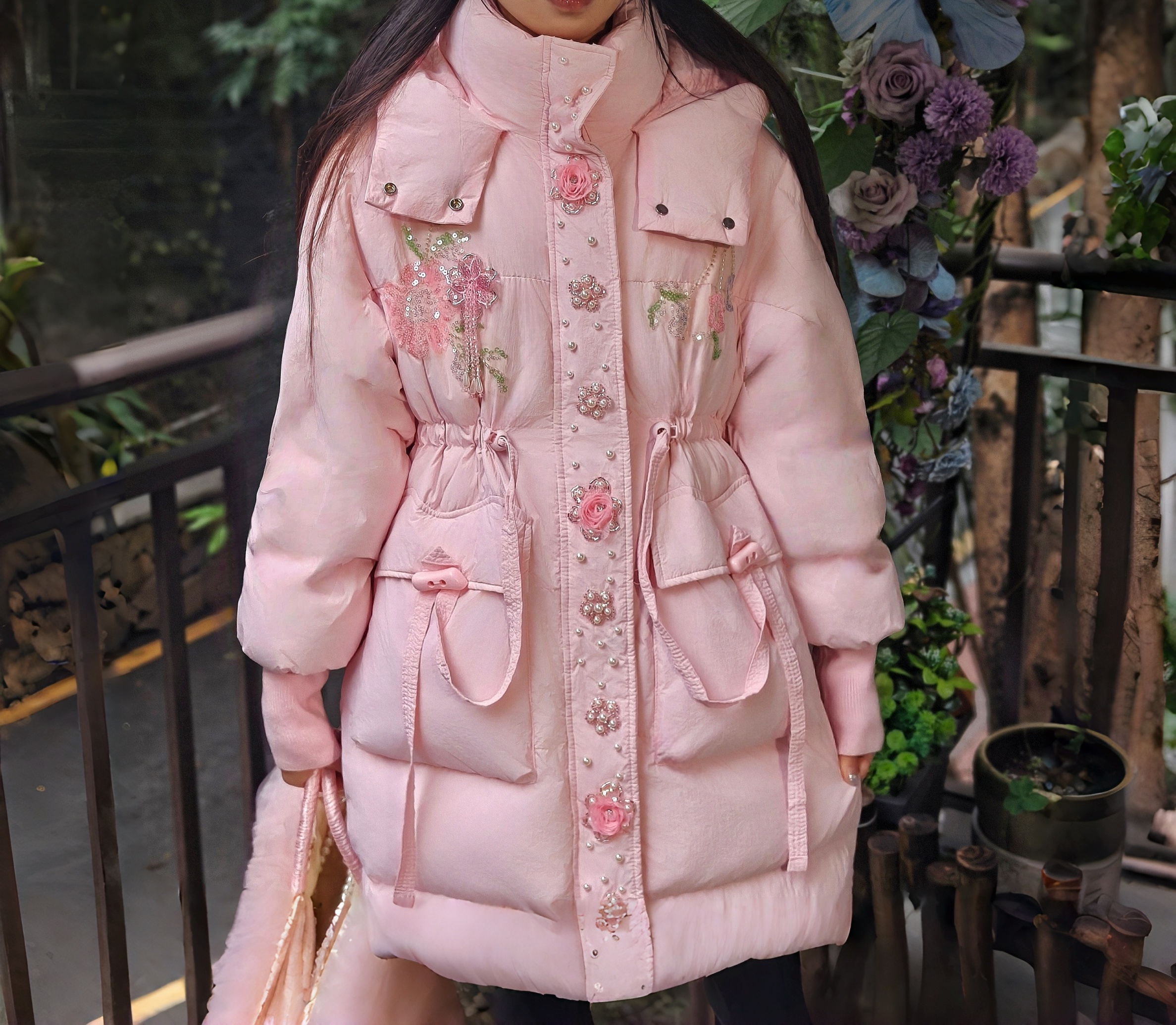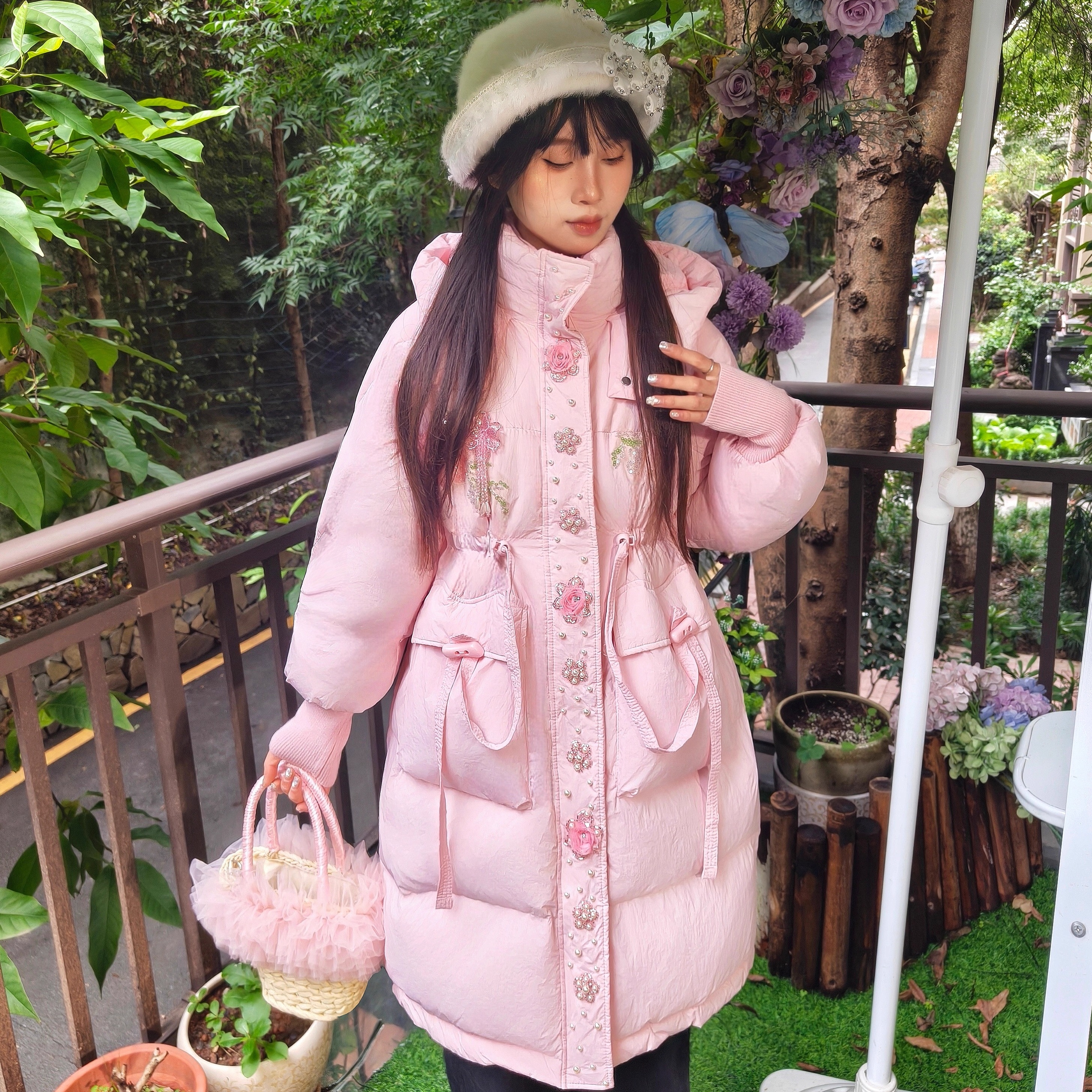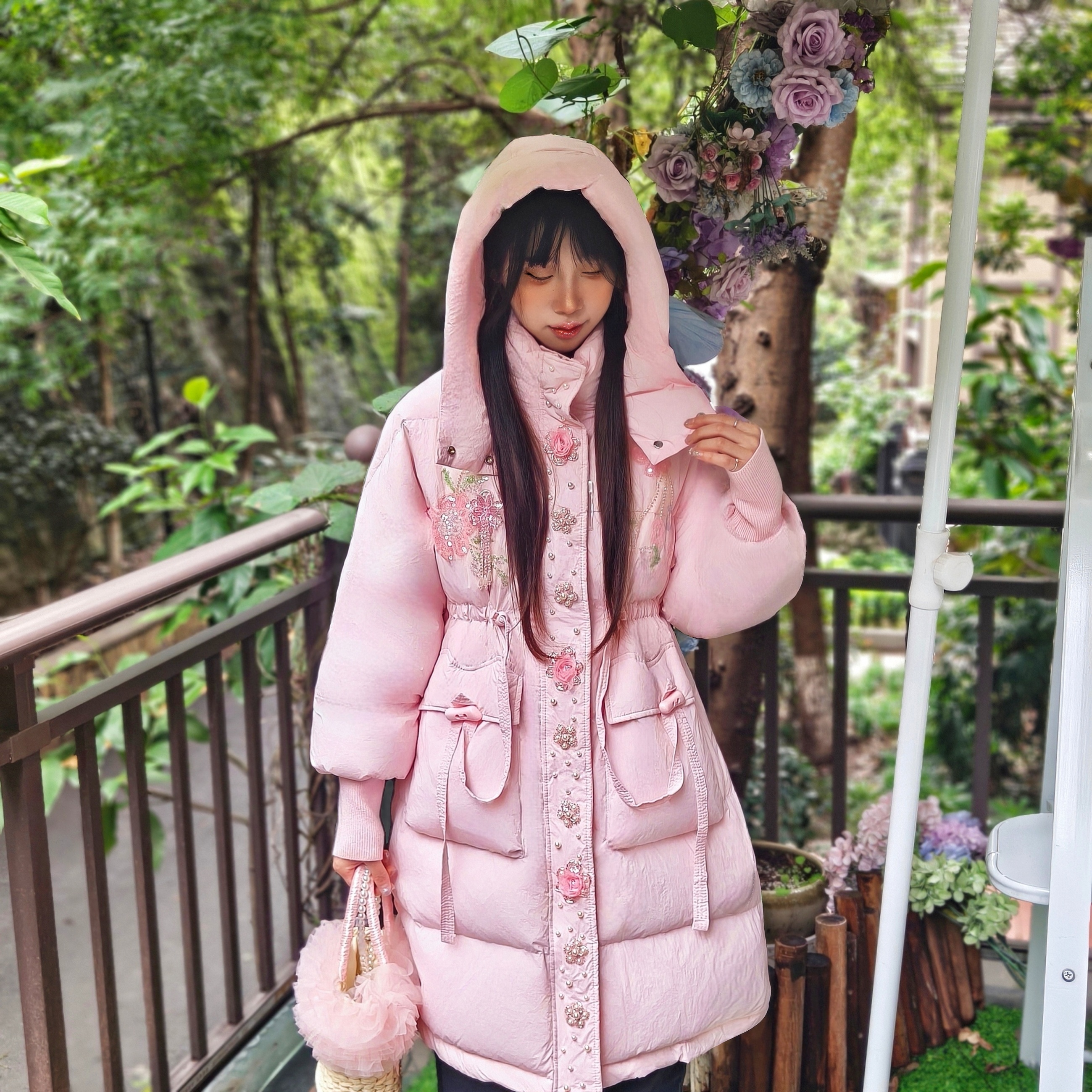 高級 不撞衣 手工粉嫩亮片串珠立體花朵加厚加厚白鴨絨外套羽絨服