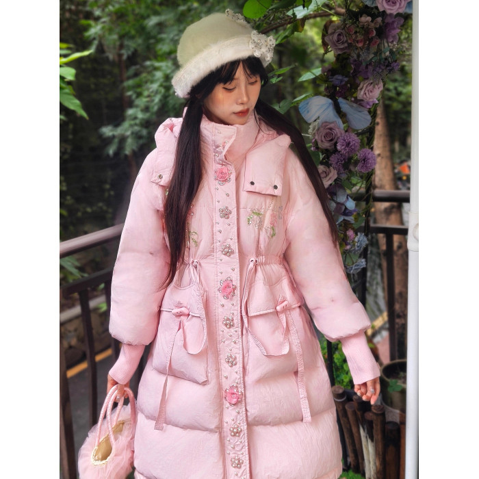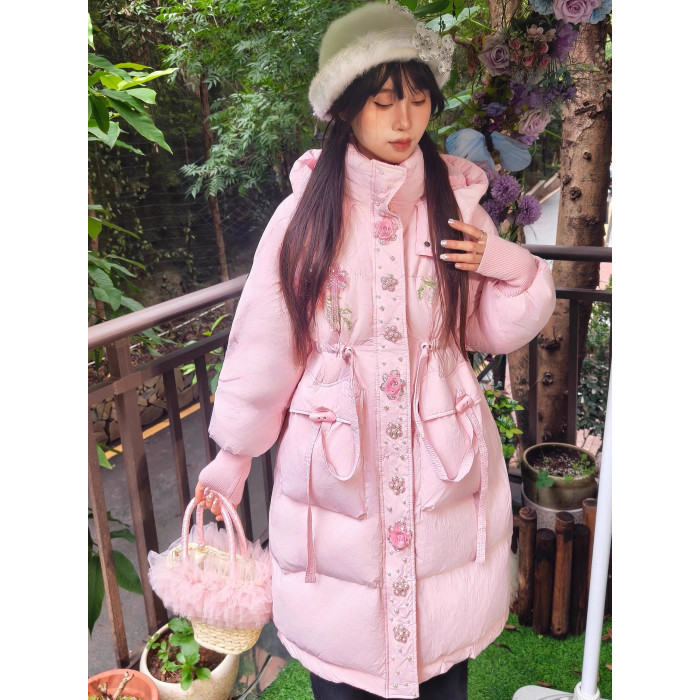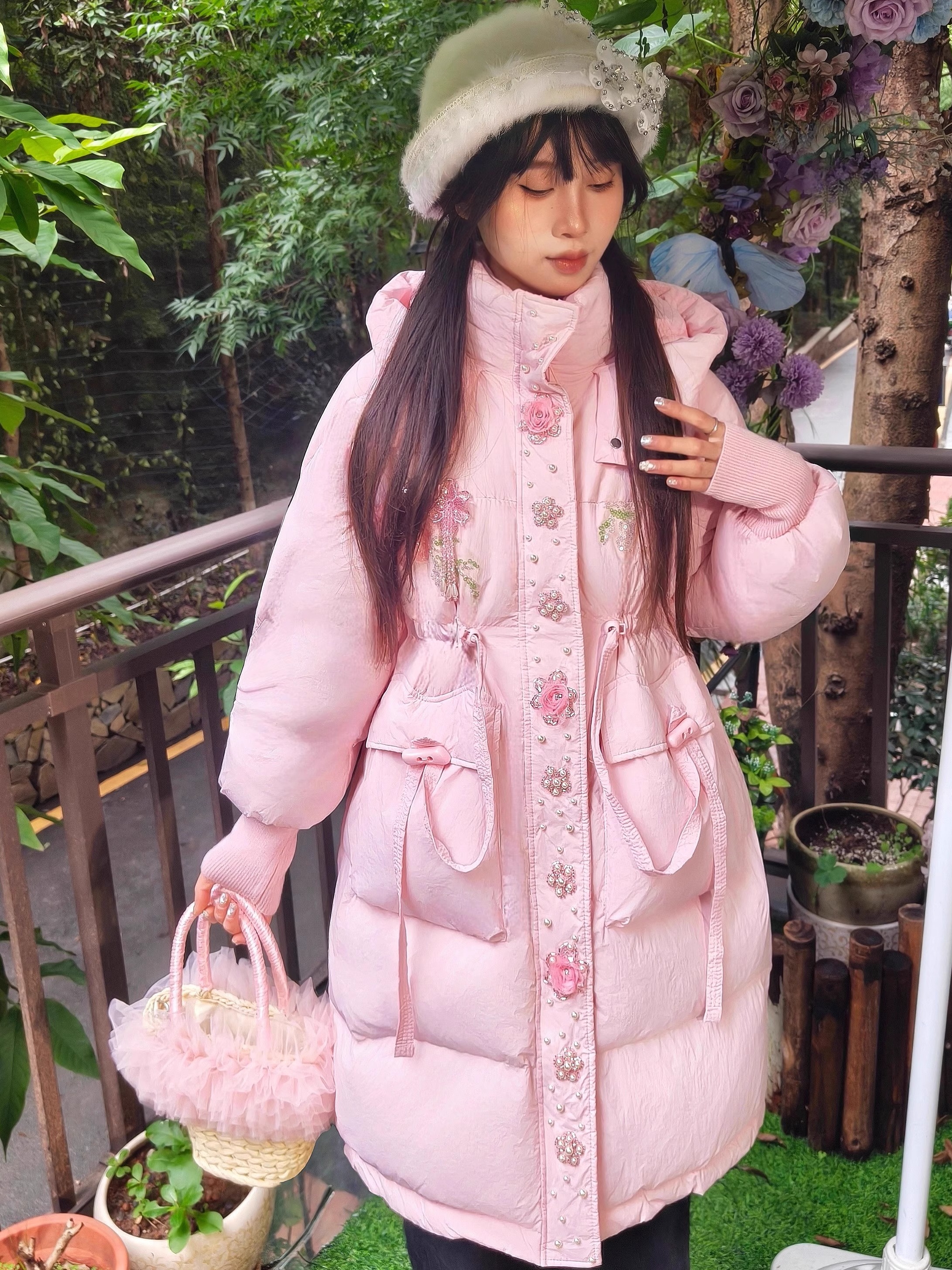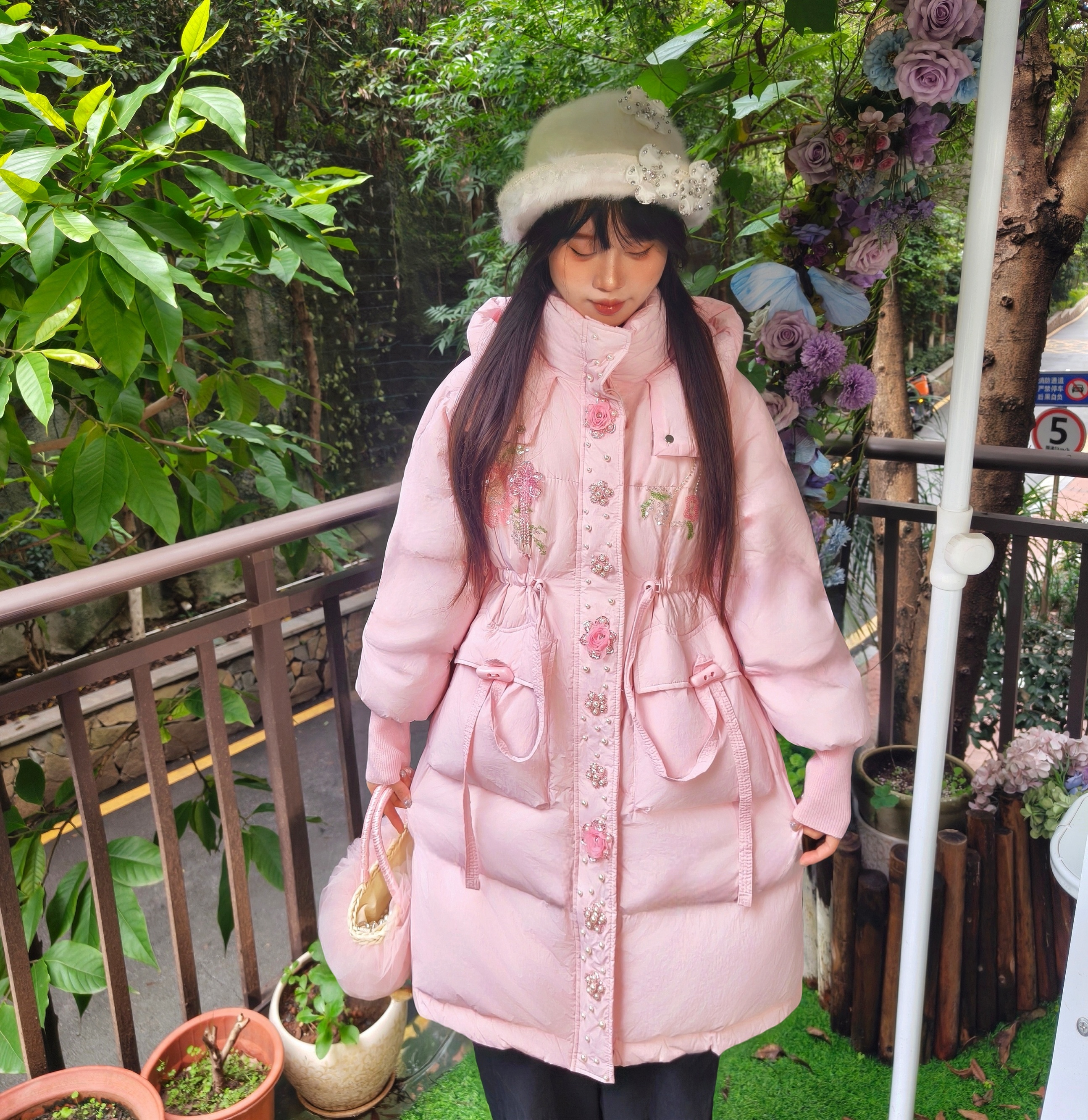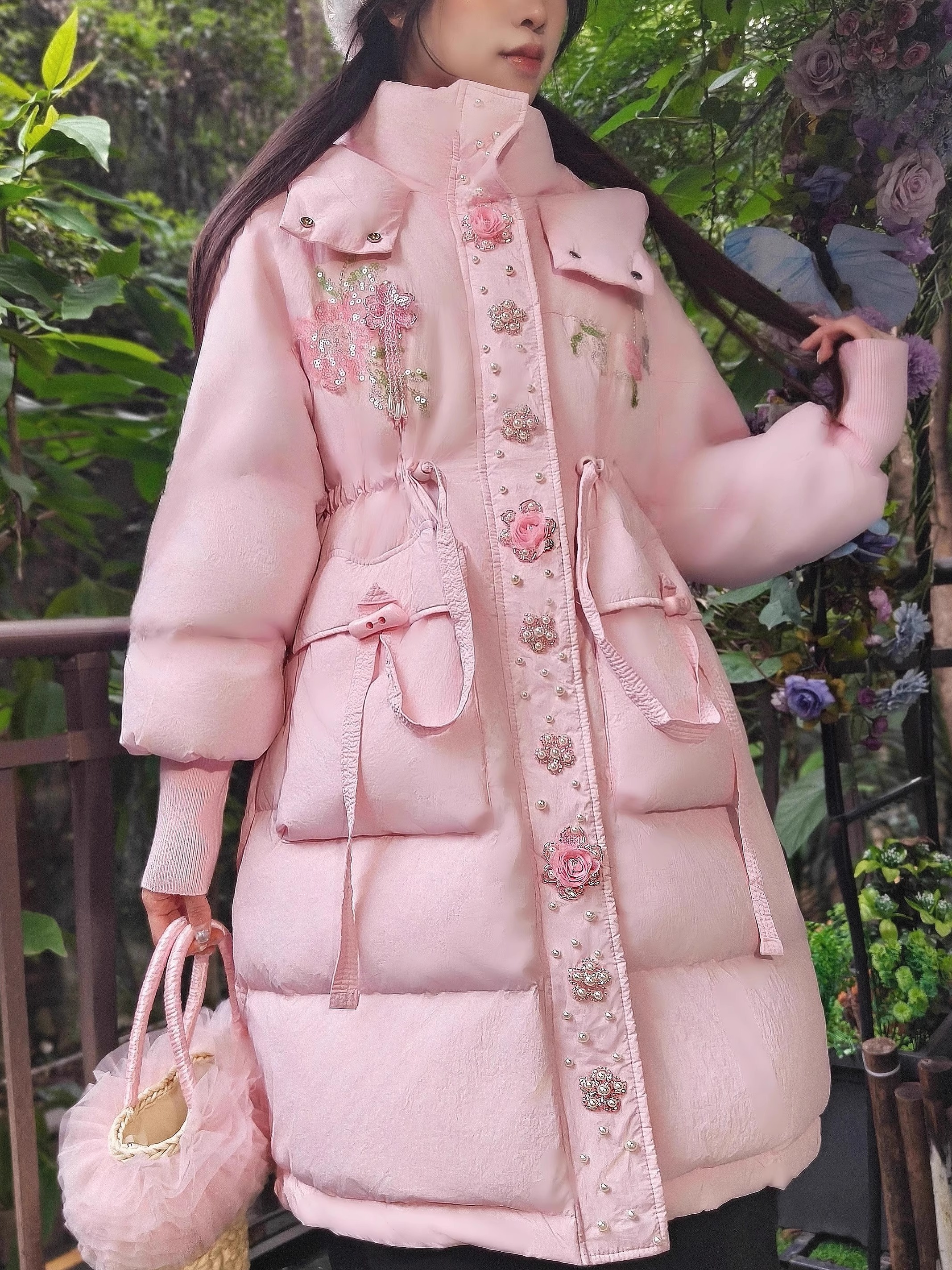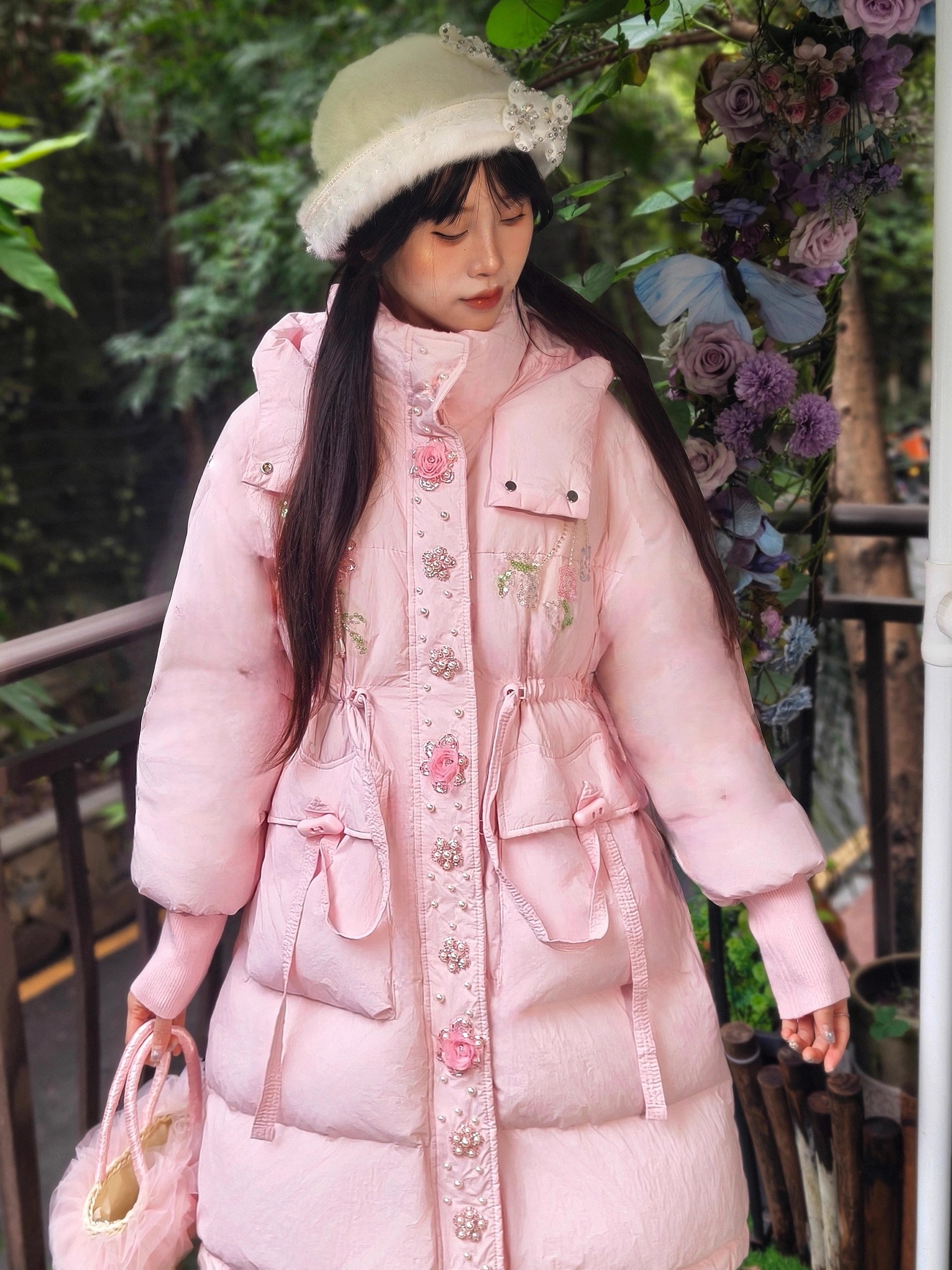 高級 不撞衣 手工粉嫩亮片串珠立體花朵加厚加厚白鴨絨外套羽絨服