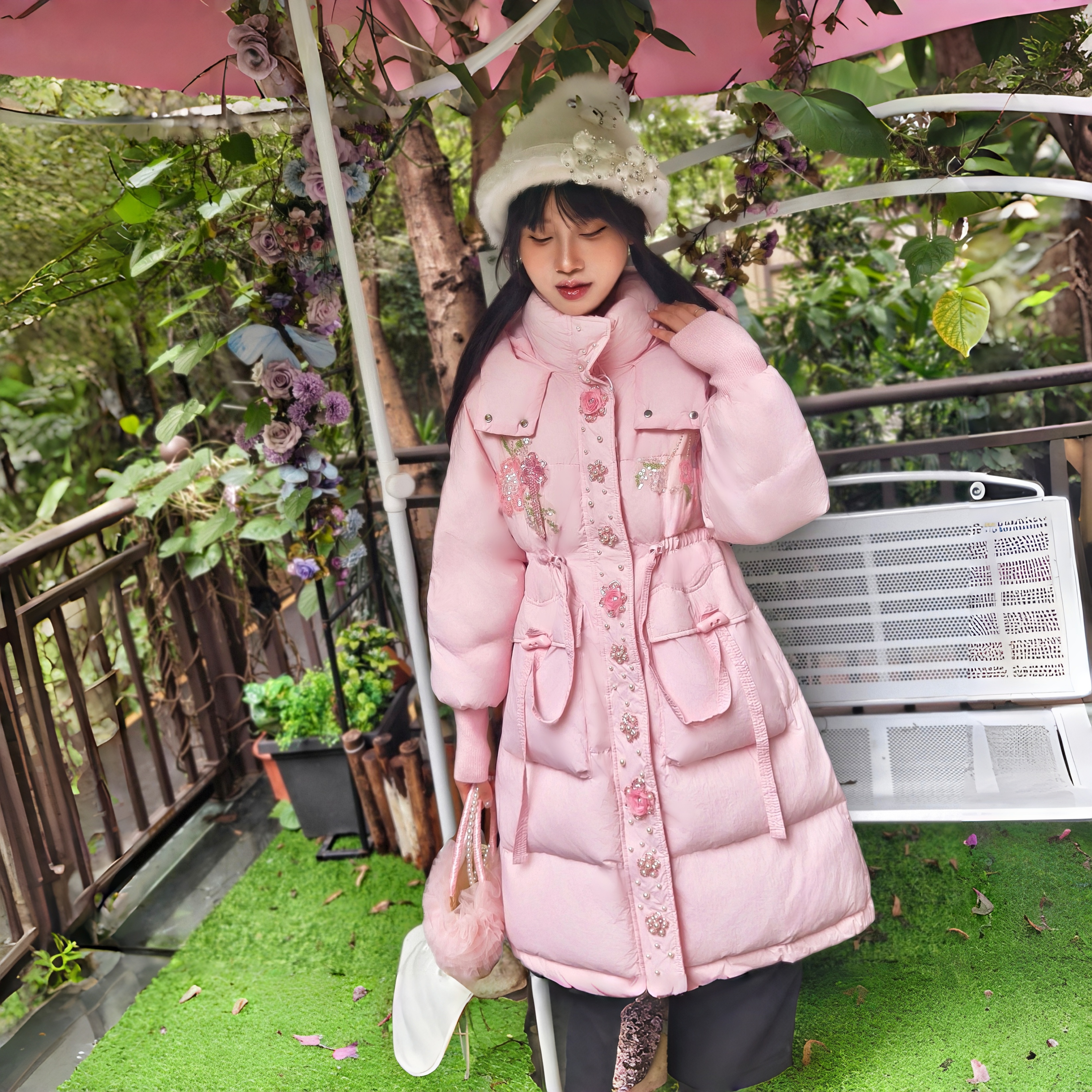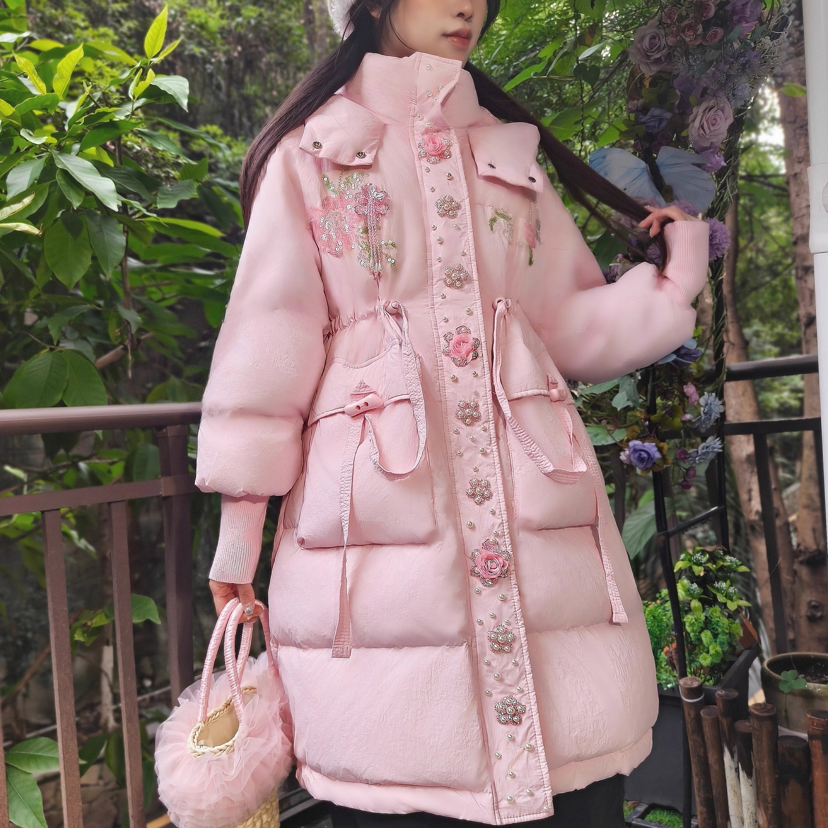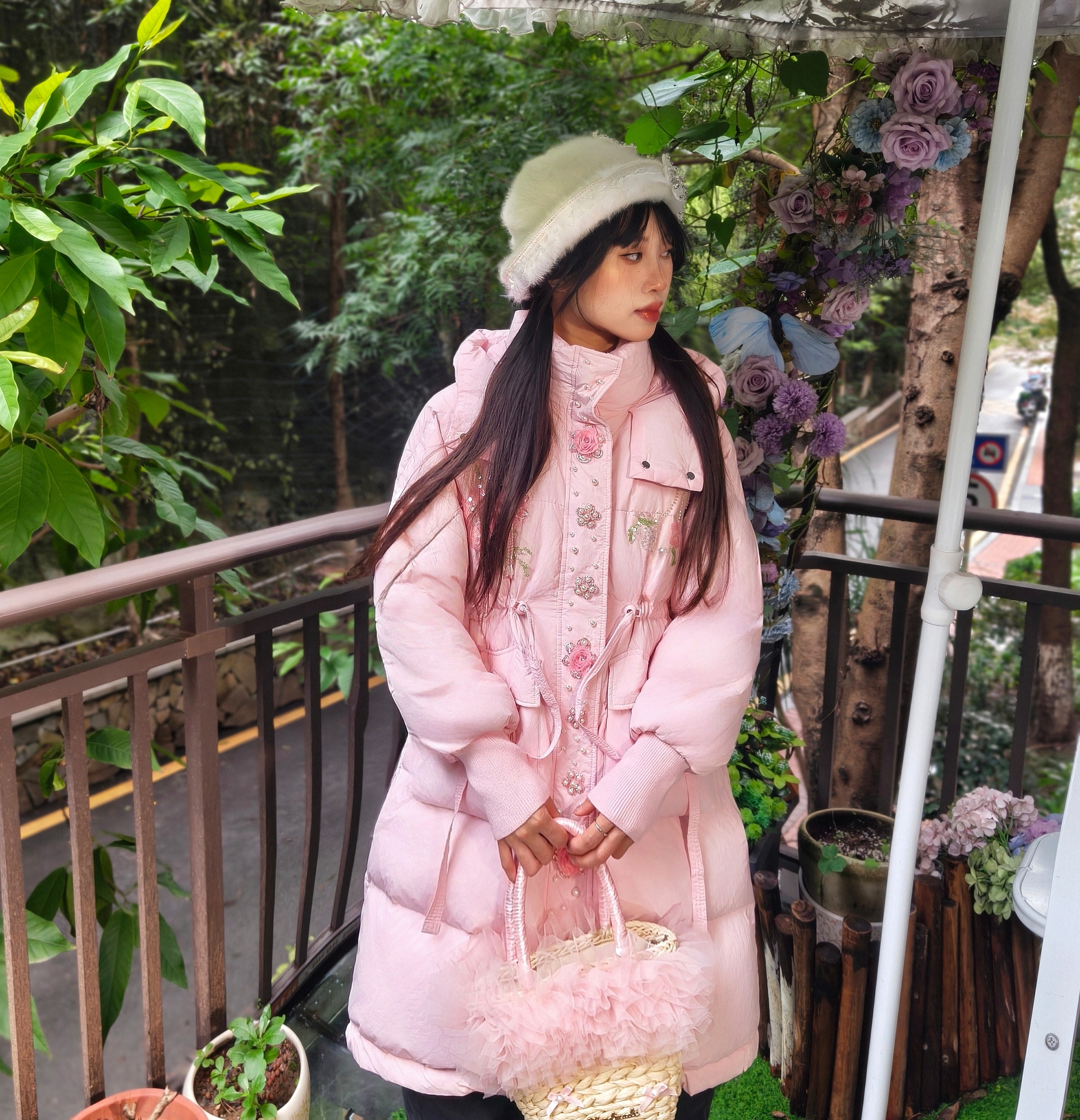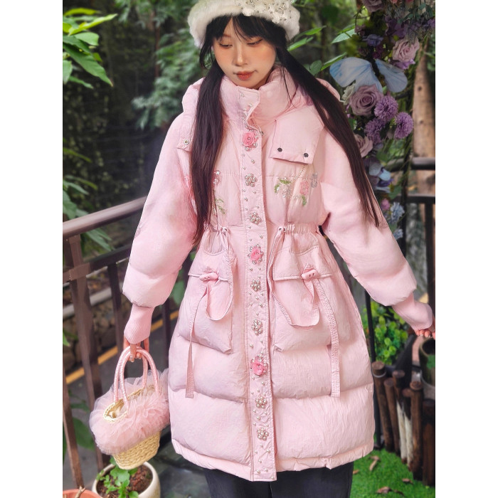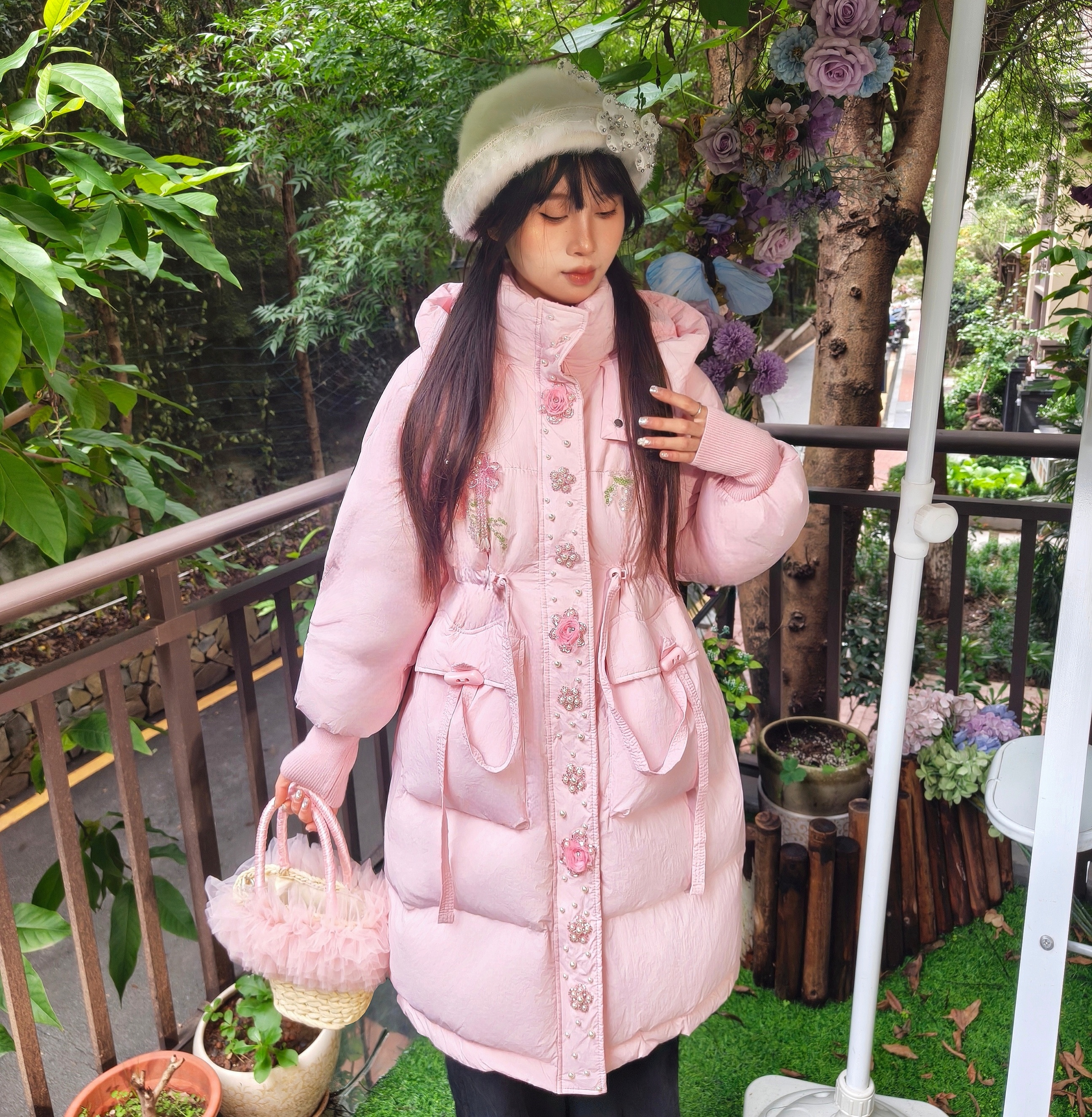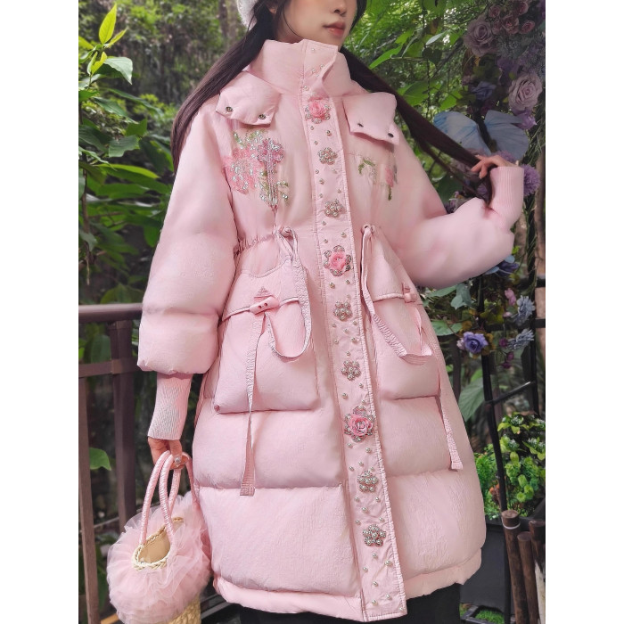 高級 不撞衣 手工粉嫩亮片串珠立體花朵加厚加厚白鴨絨外套羽絨服