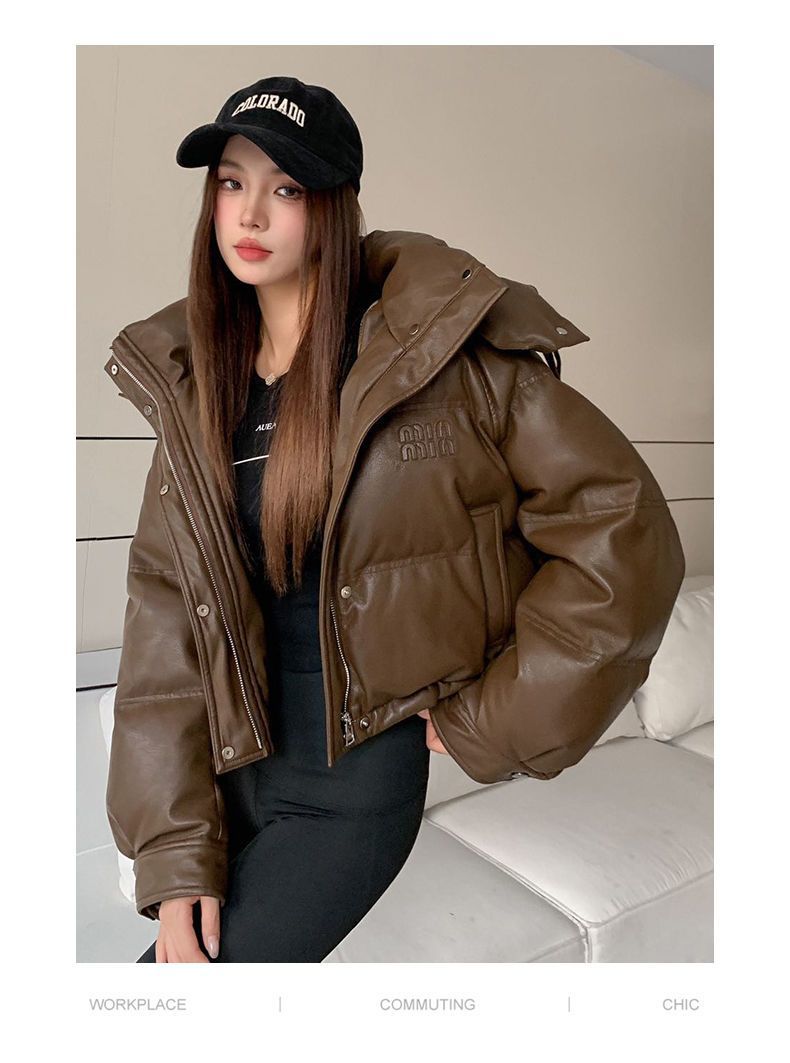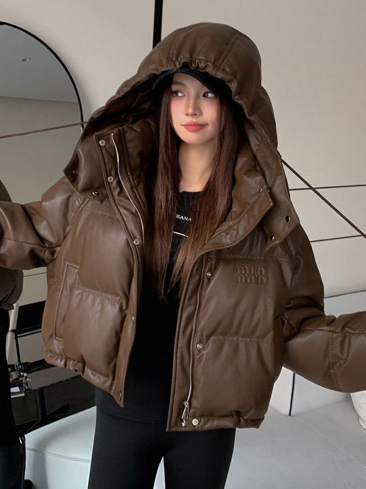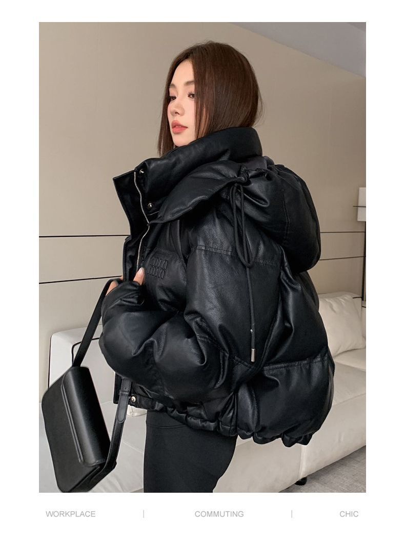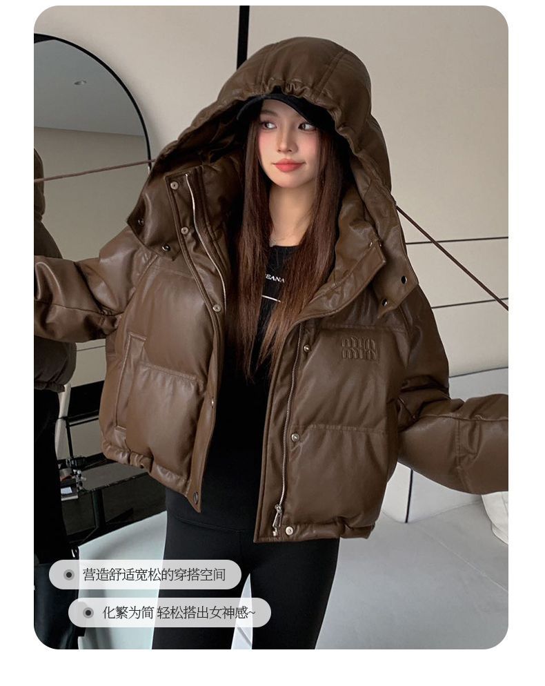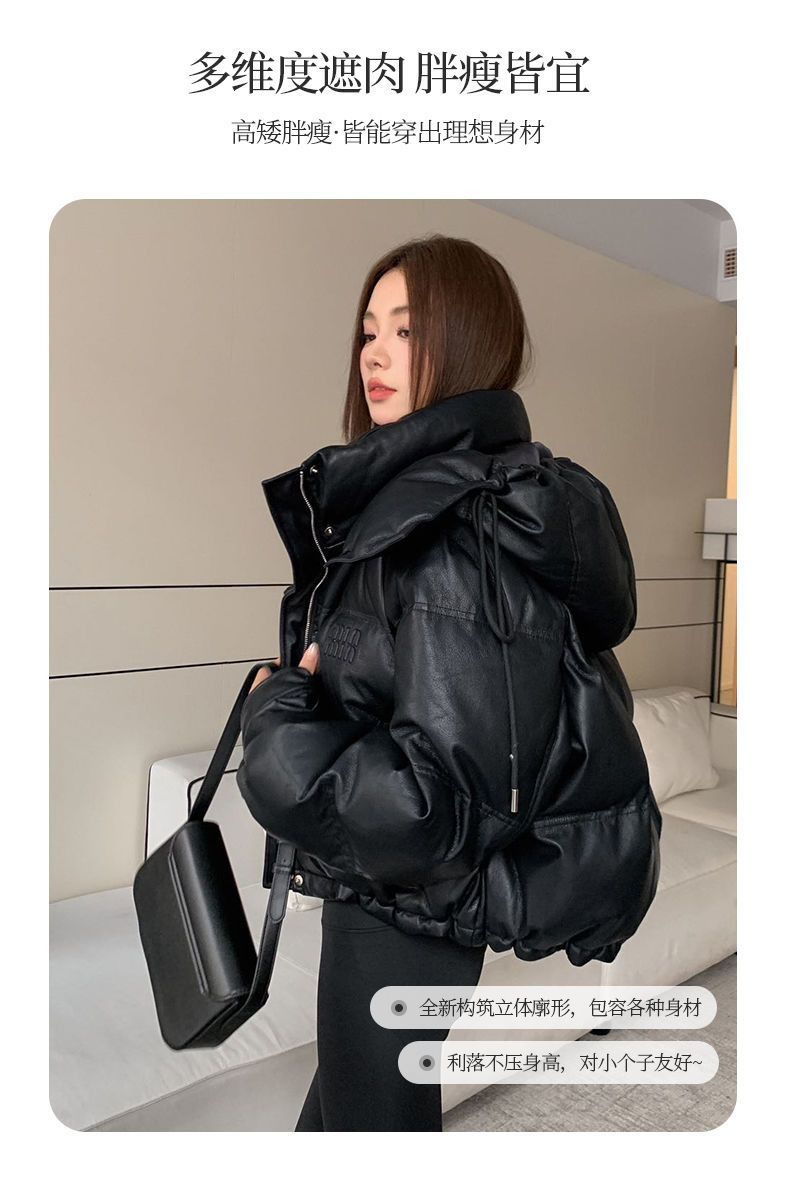 PU皮冬季短款女免洗連帽棉衣棉服2024寬松新款時尚麵包美拉德外套
