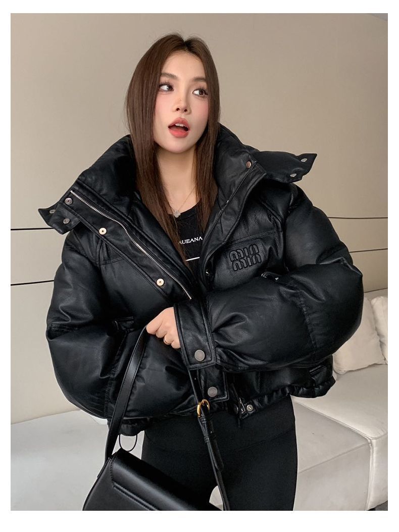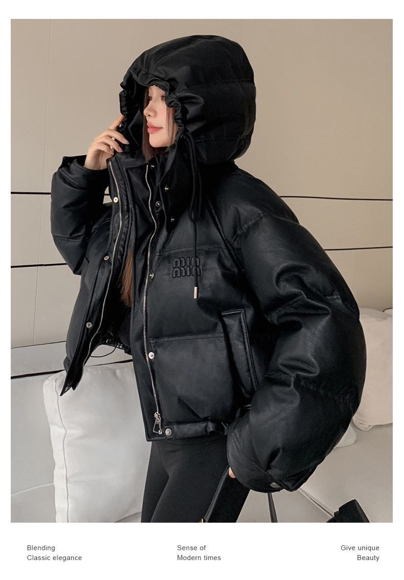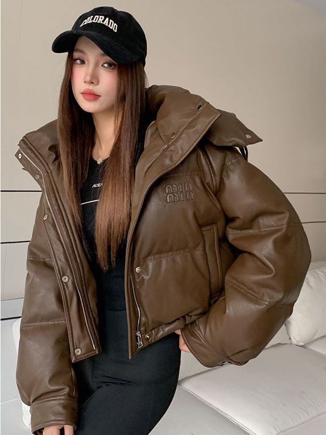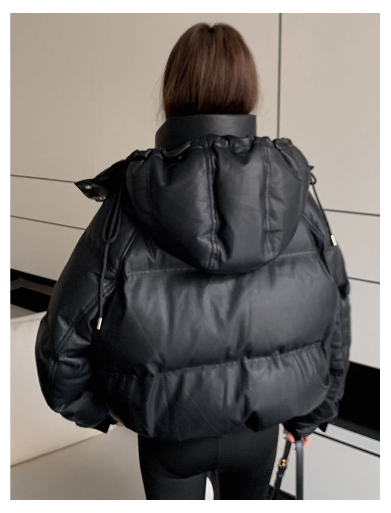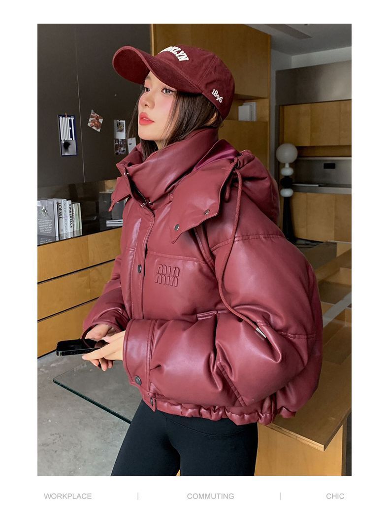 PU皮冬季短款女免洗連帽棉衣棉服2024寬松新款時尚麵包美拉德外套