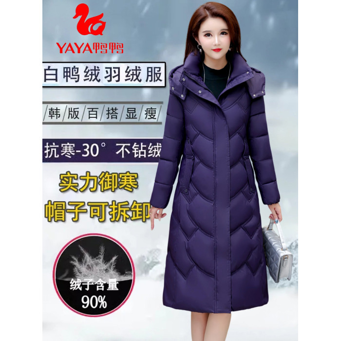 鴨鴨羽絨服女中長款2025冬季時尚過膝修身白鴨絨加厚保暖媽媽外套