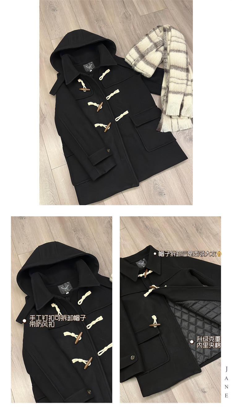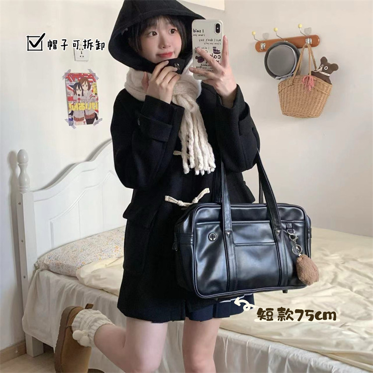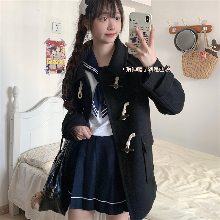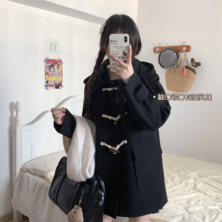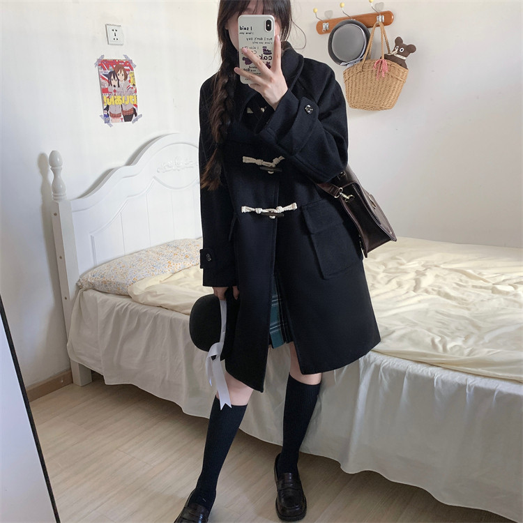 JK黑色牛角釦大衣夾棉加厚冬季日系中長款女冬毛呢外套小個子短款