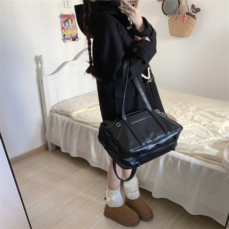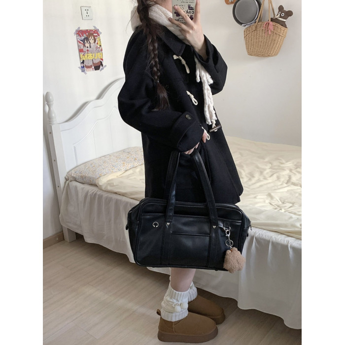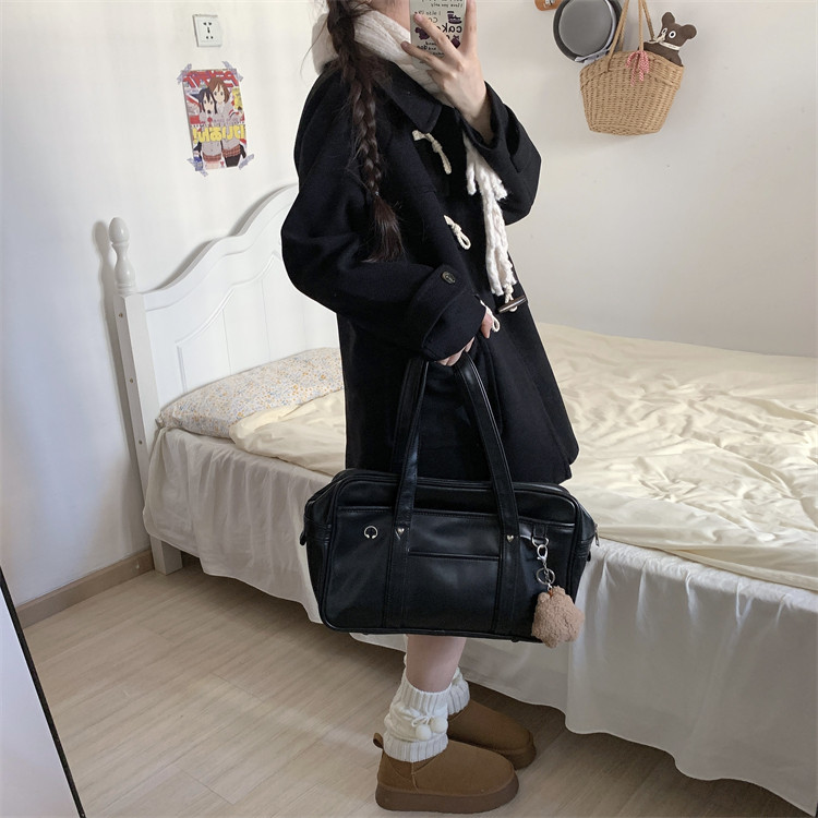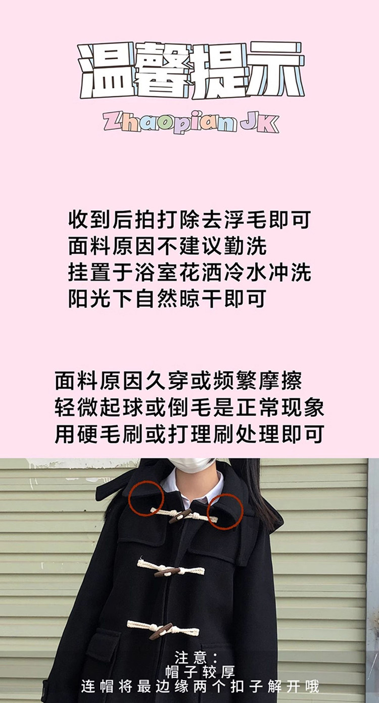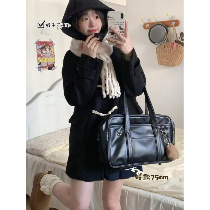 JK黑色牛角釦大衣夾棉加厚冬季日系中長款女冬毛呢外套小個子短款