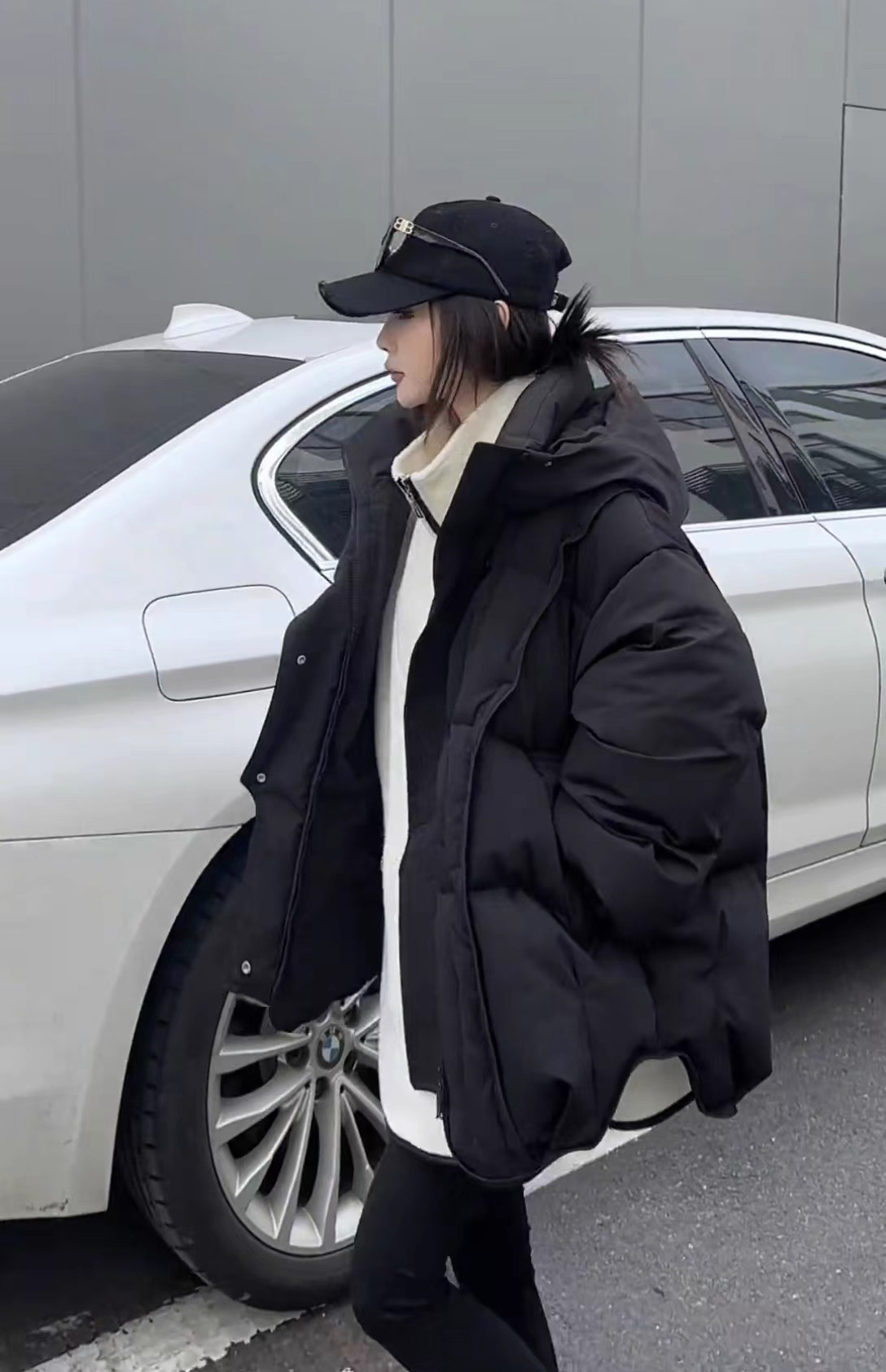 胖mm大碼寬松遮肉洋氣麵包服冬季設計感中長款加厚連帽羽絨棉服女