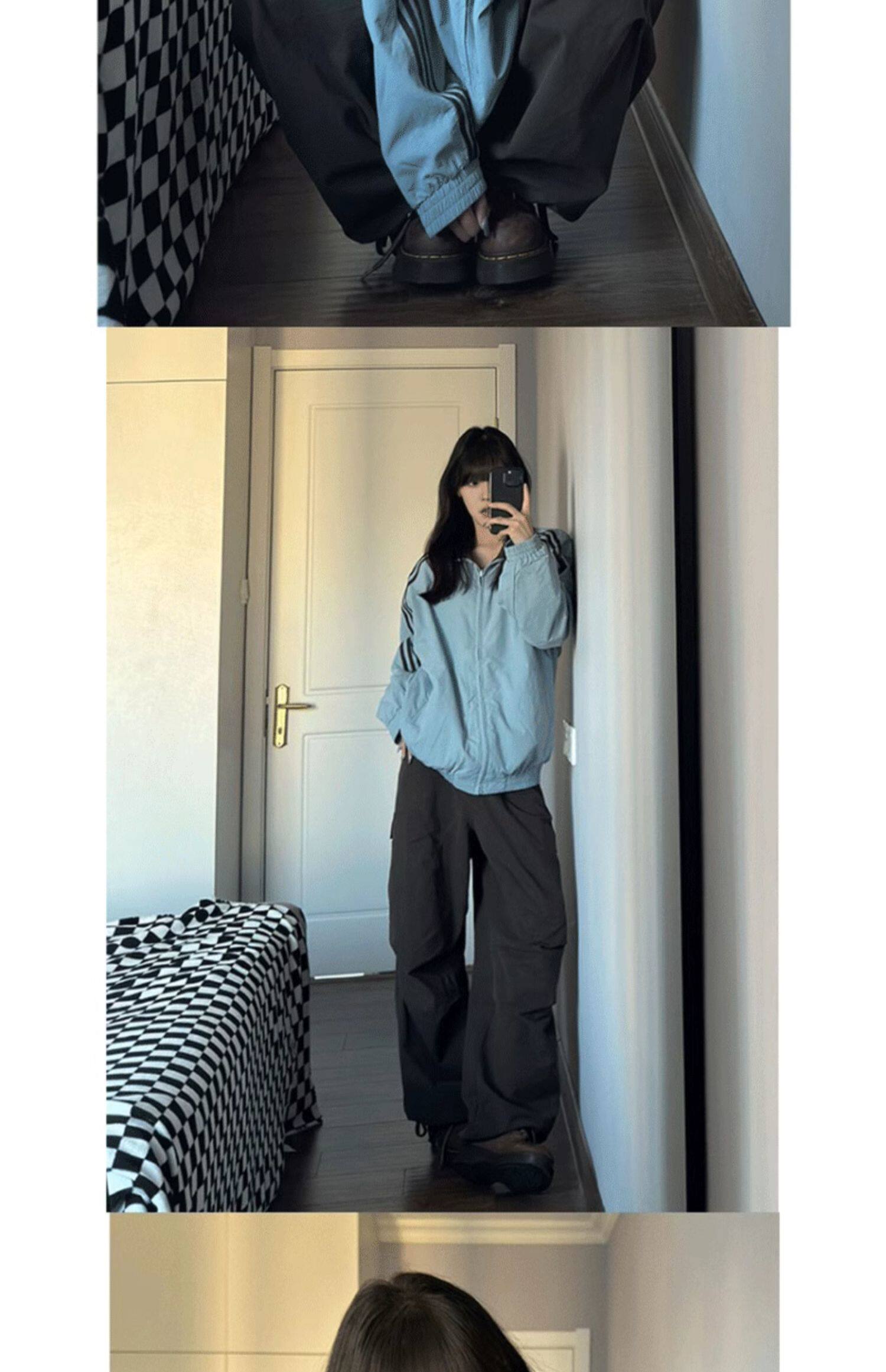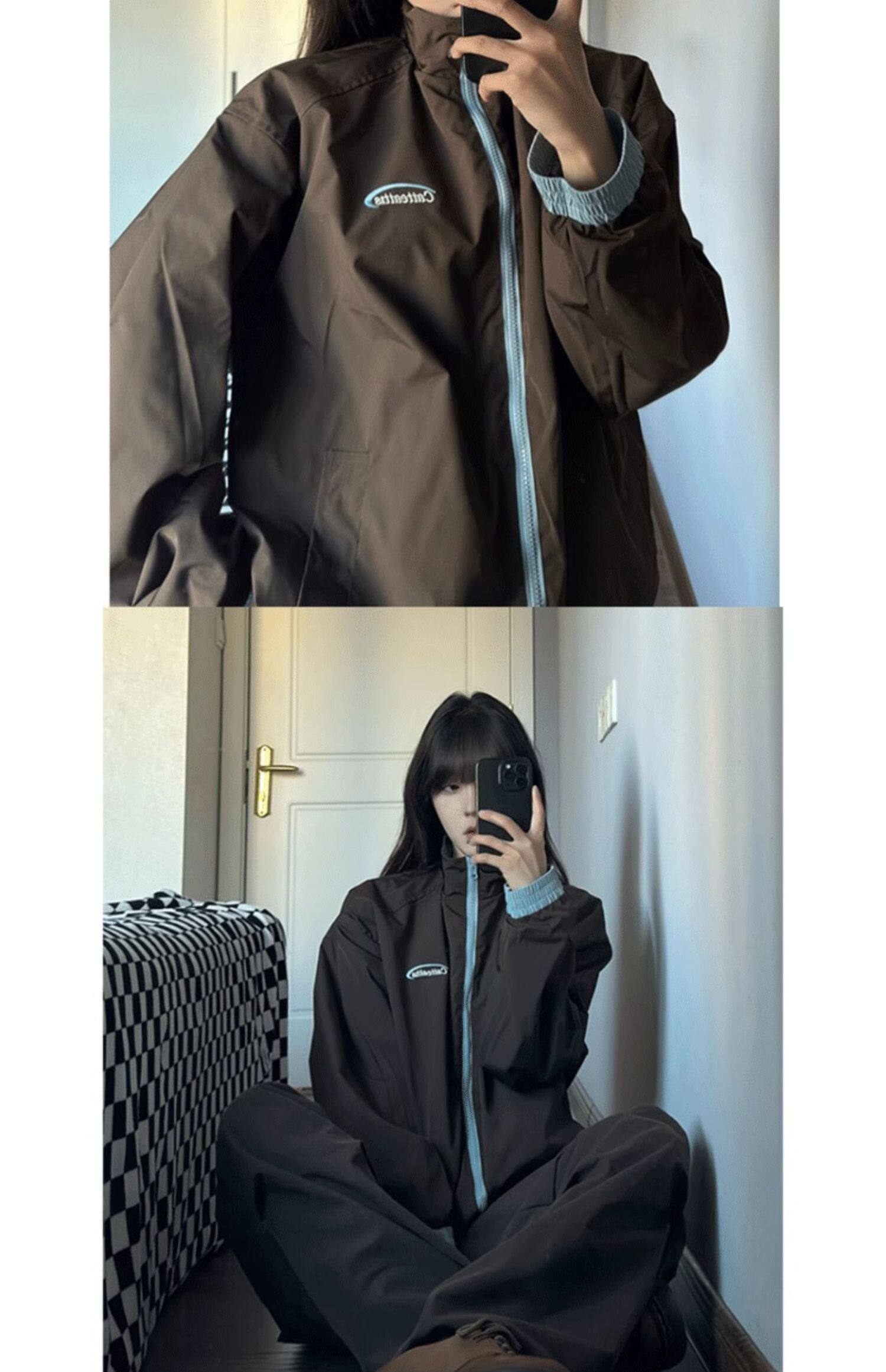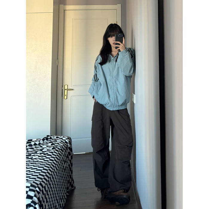 美式復古拼接條紋兩面穿連帽外套女寬松設計感小衆休閒百搭棒球服