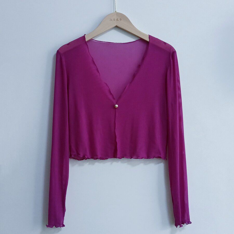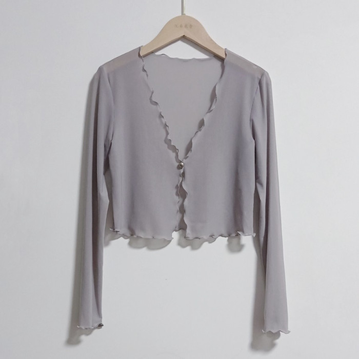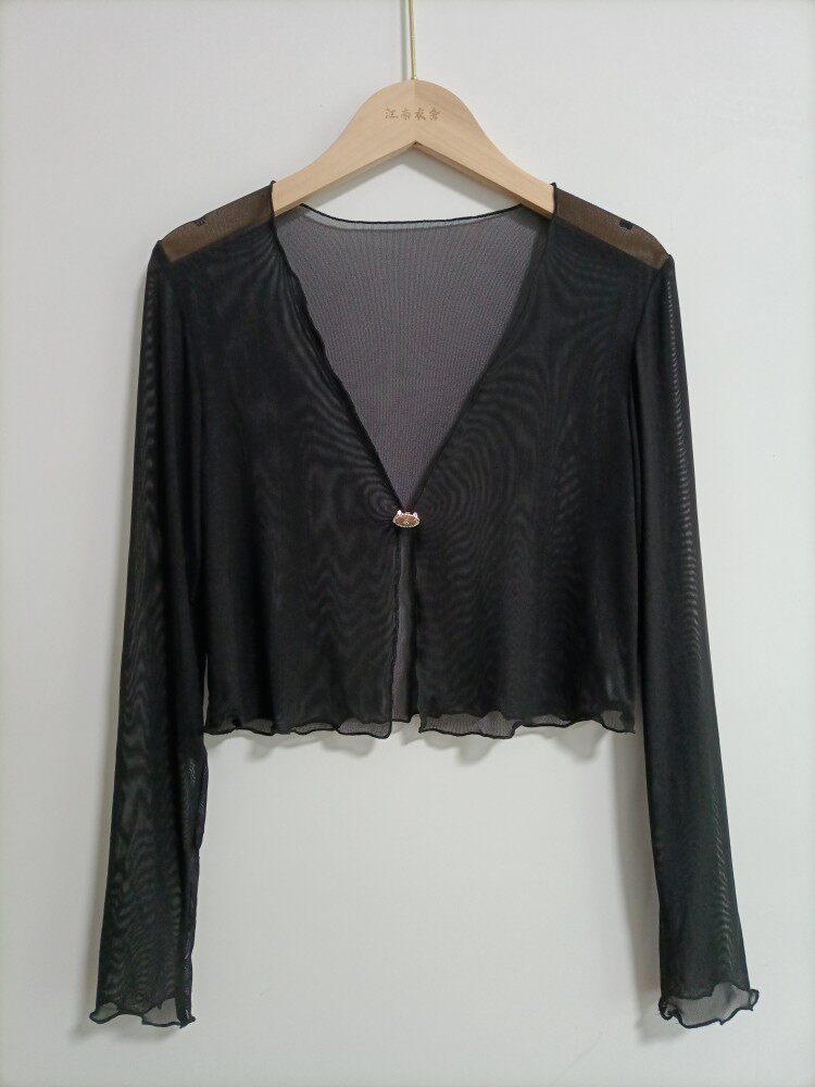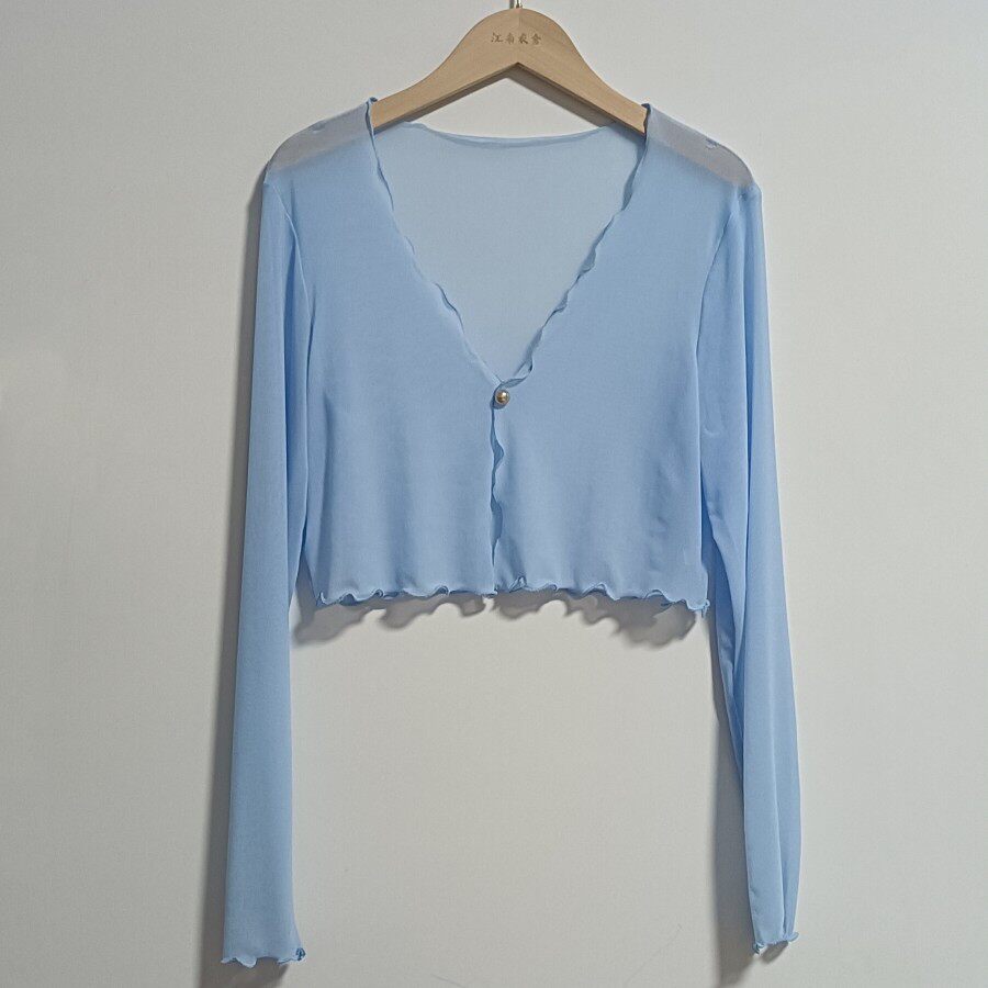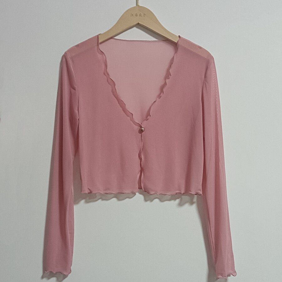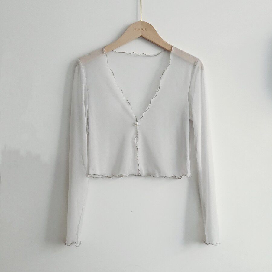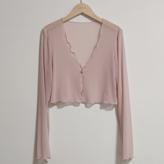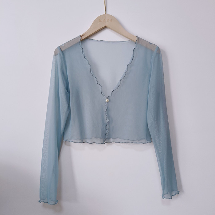 性感半透明夏季長袖冰絲網紗外披上衣小外套短款薄V領開衫空調衫