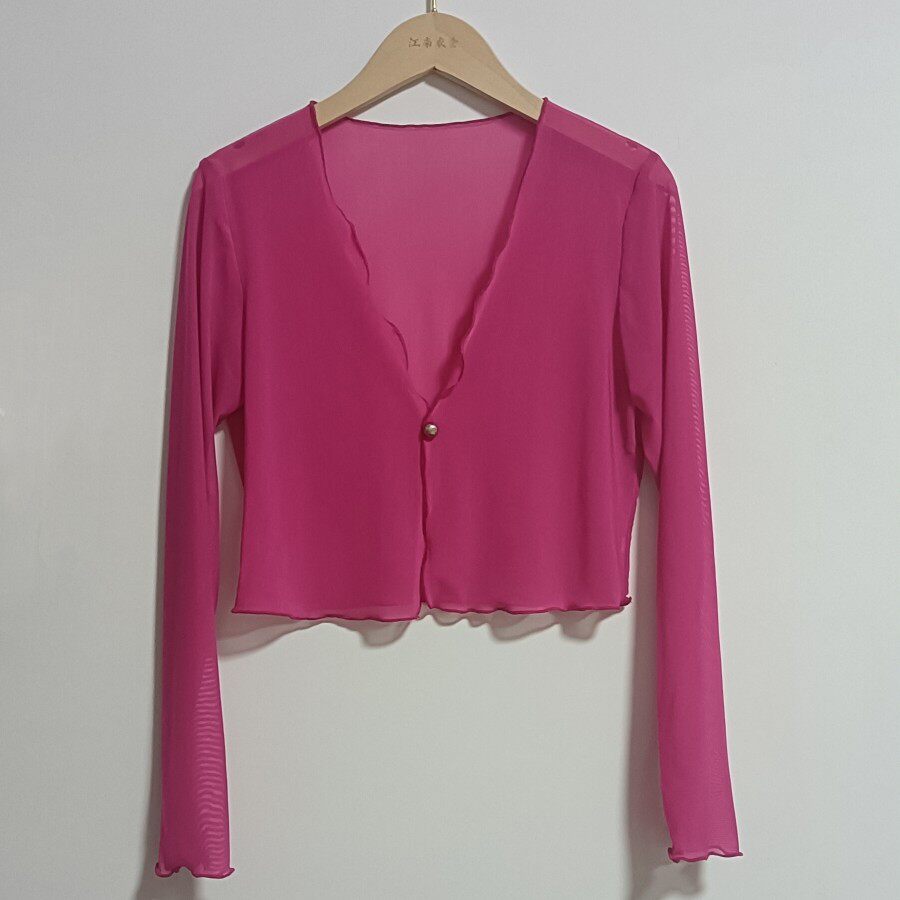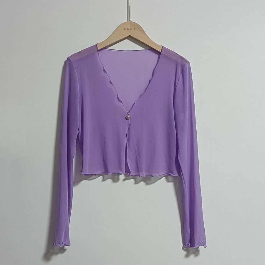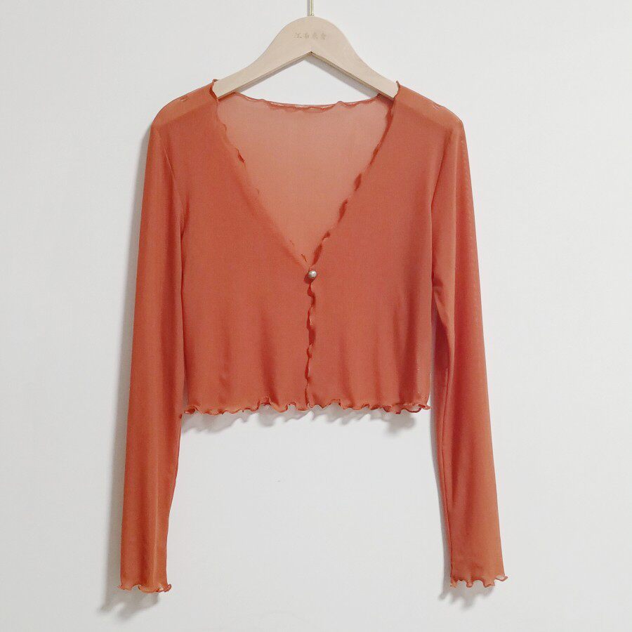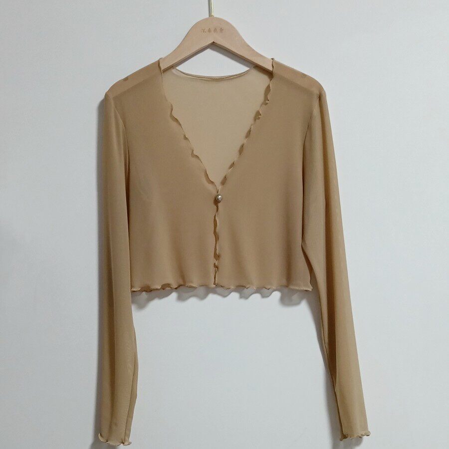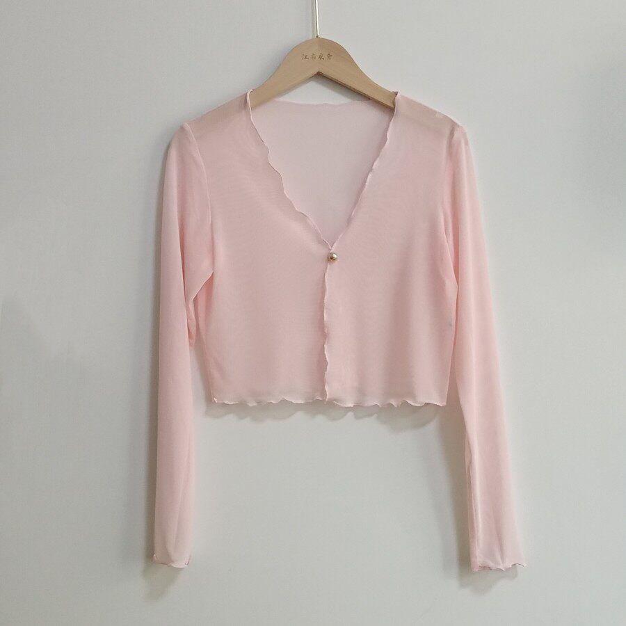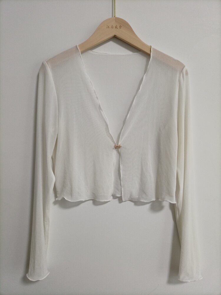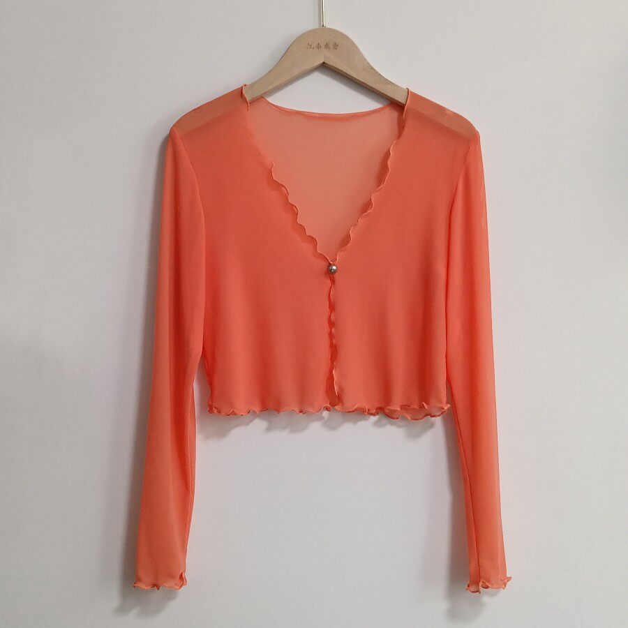 性感半透明夏季長袖冰絲網紗外披上衣小外套短款薄V領開衫空調衫