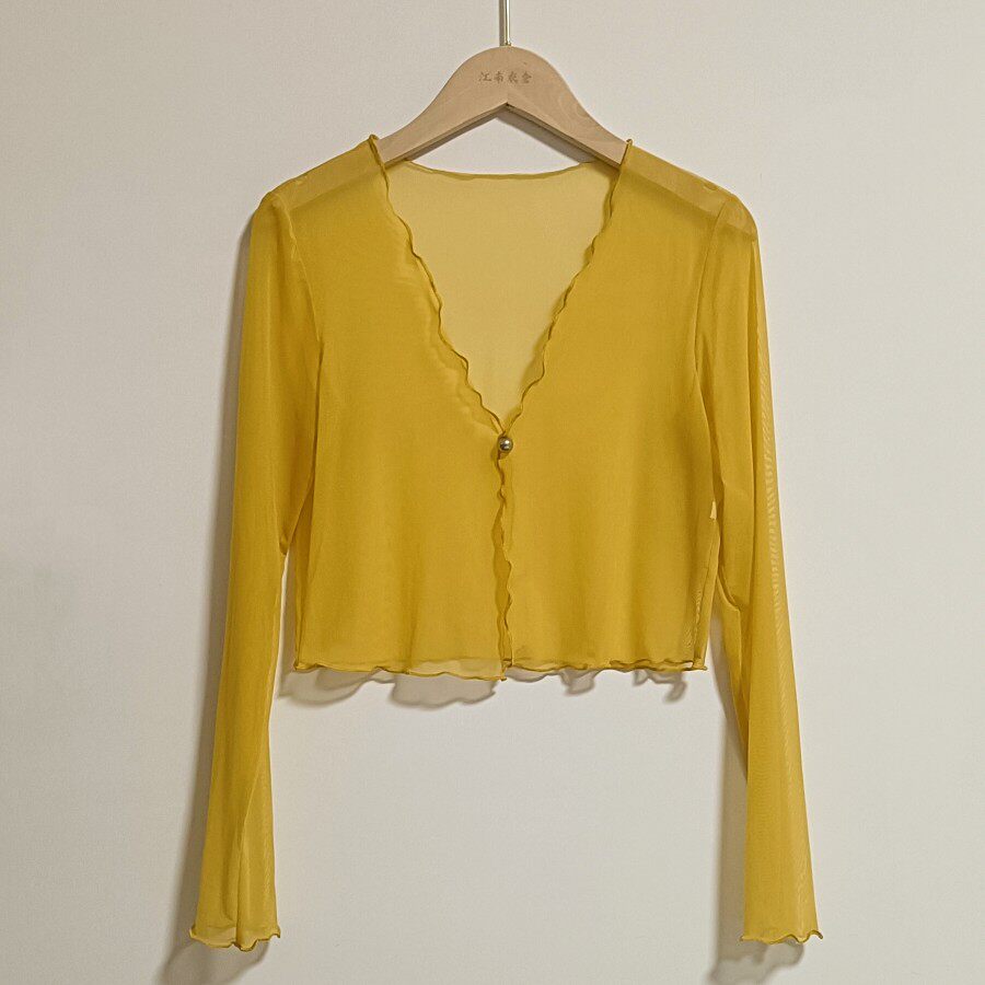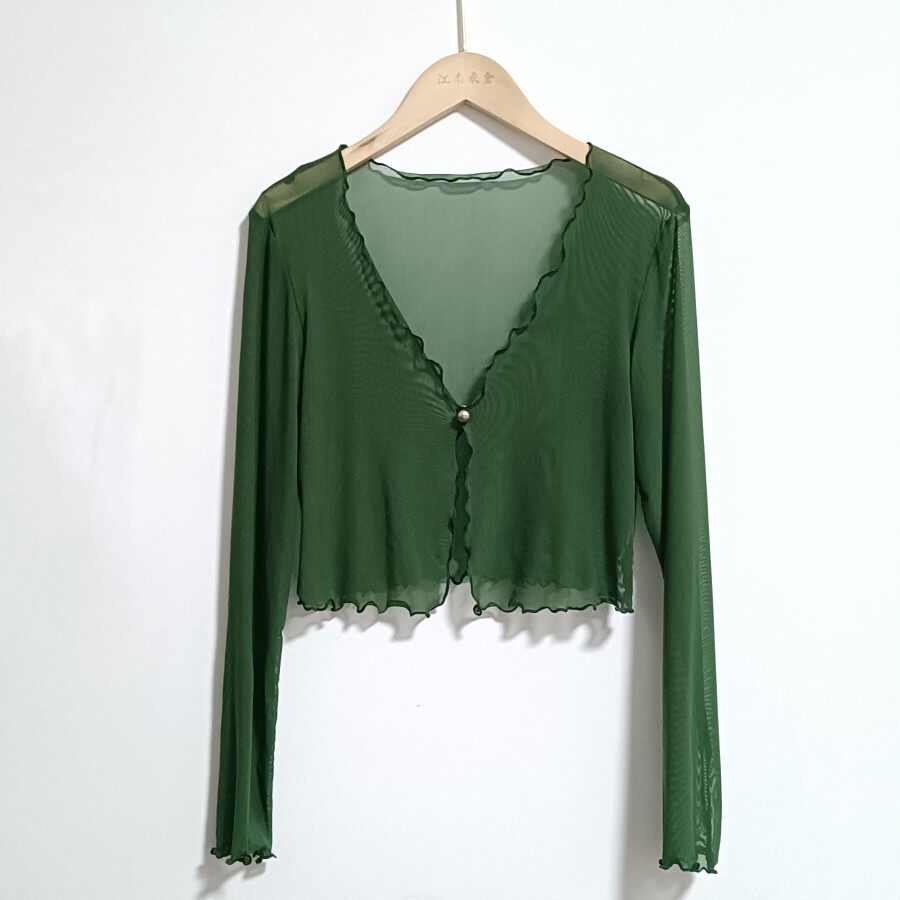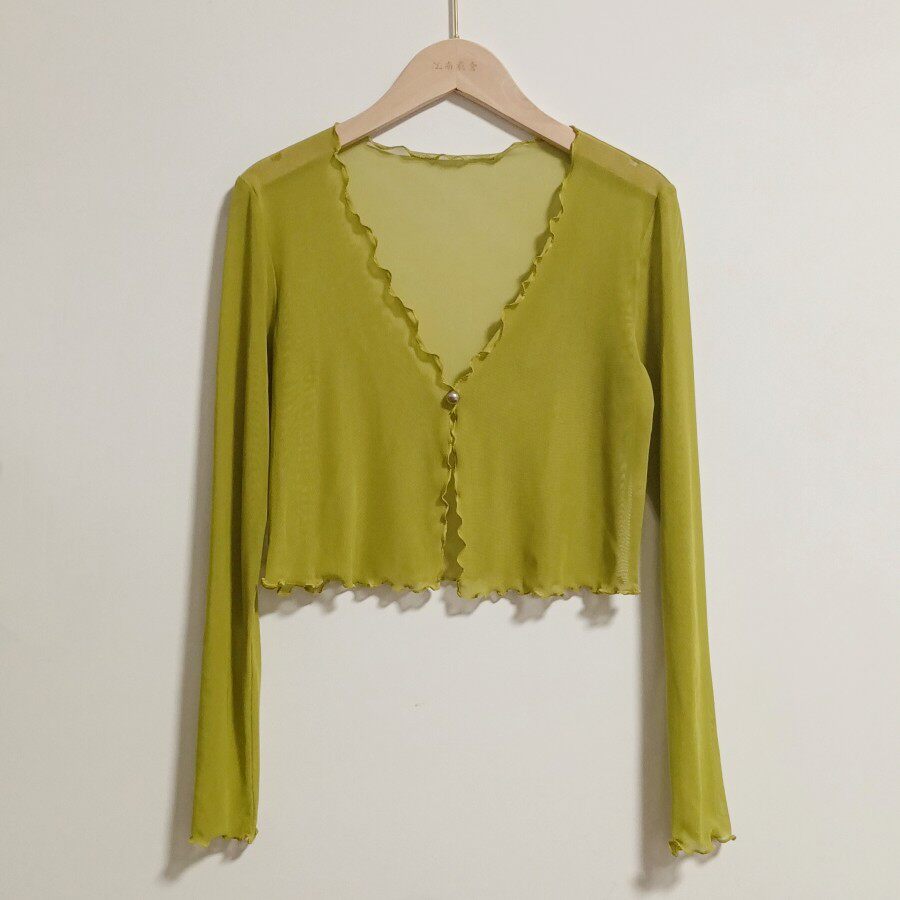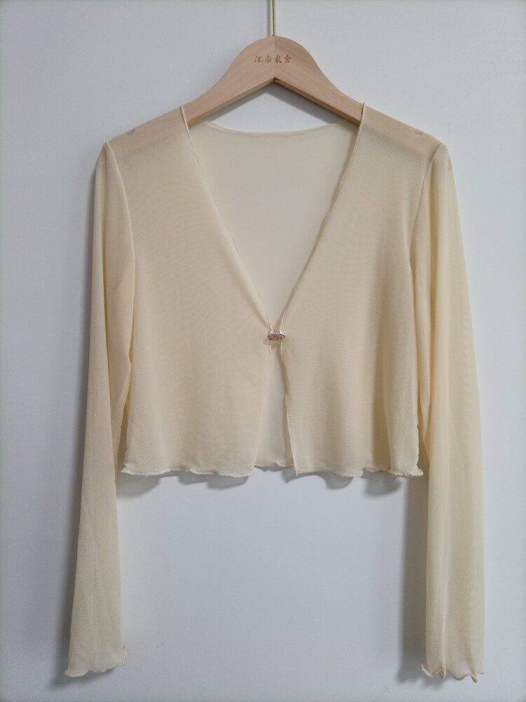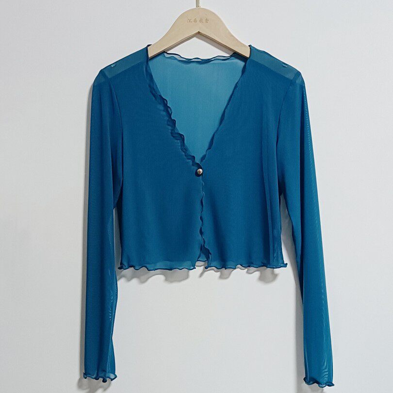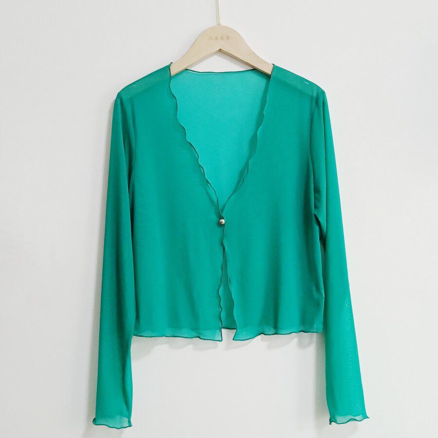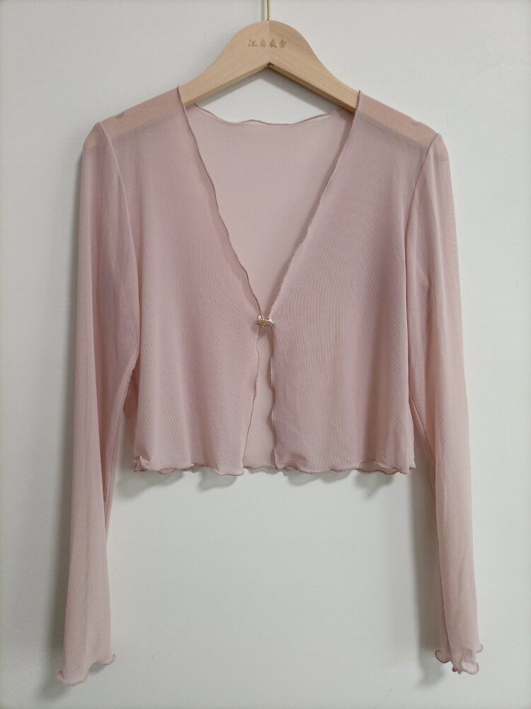 性感半透明夏季長袖冰絲網紗外披上衣小外套短款薄V領開衫空調衫
