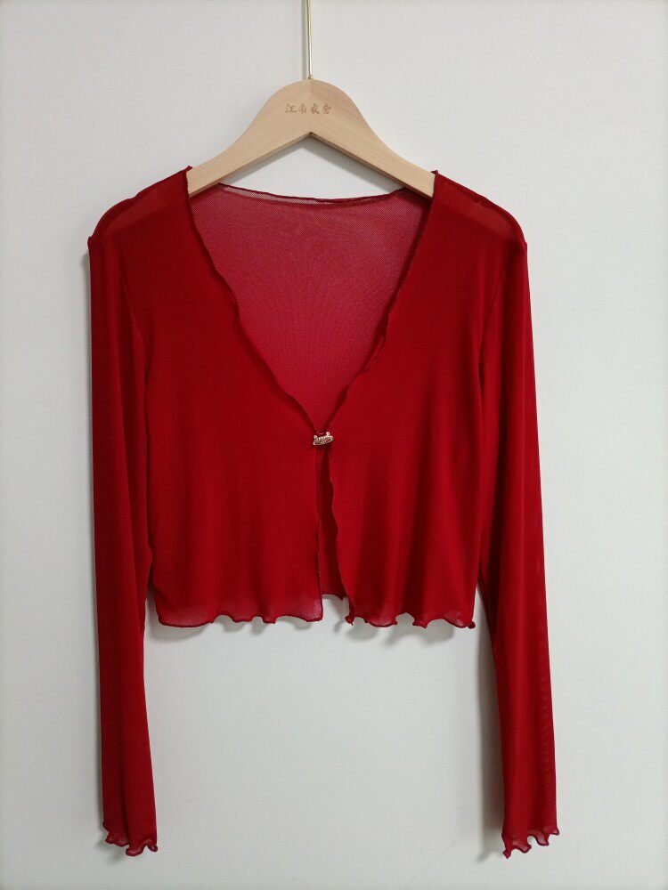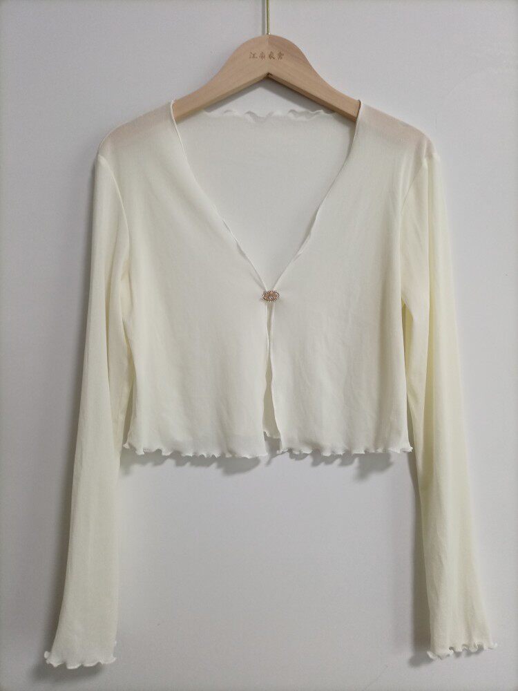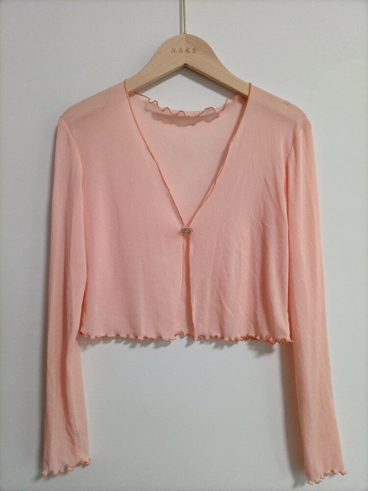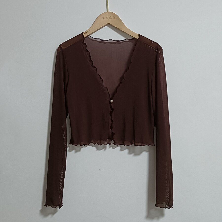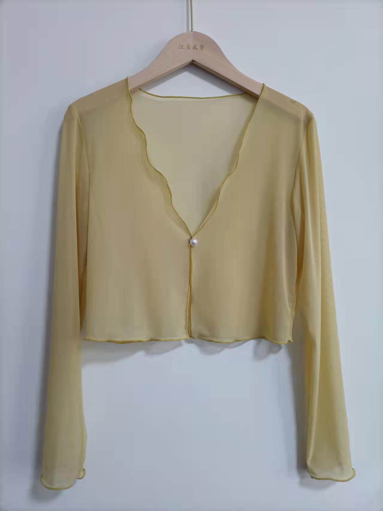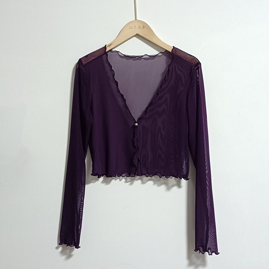 性感半透明夏季長袖冰絲網紗外披上衣小外套短款薄V領開衫空調衫