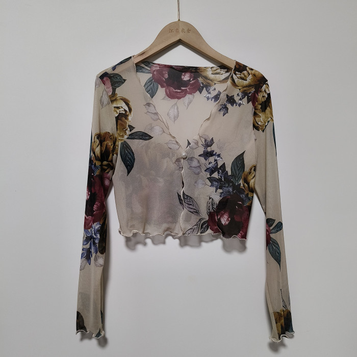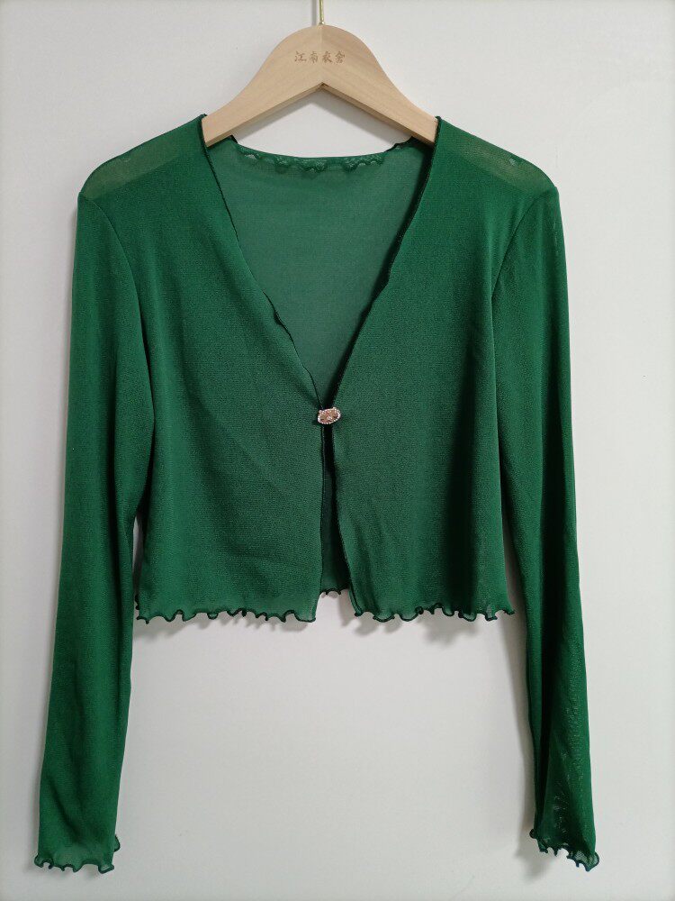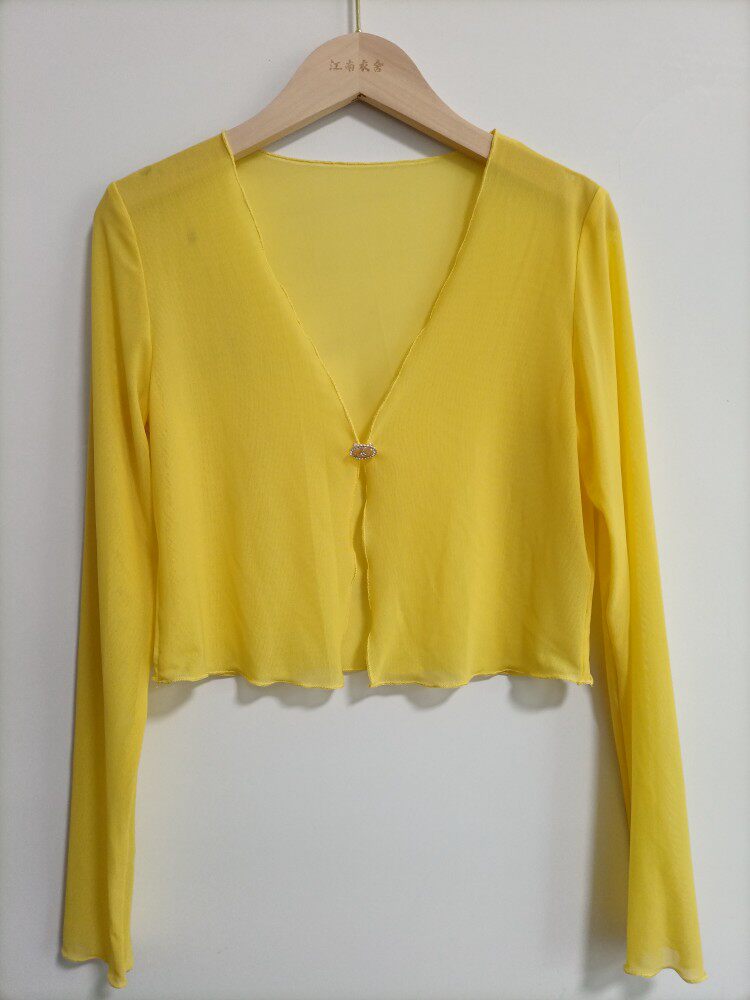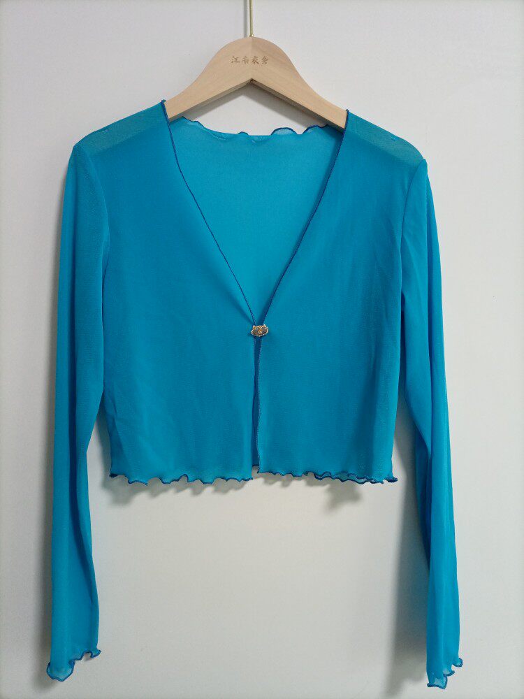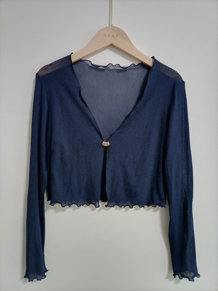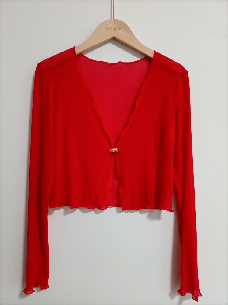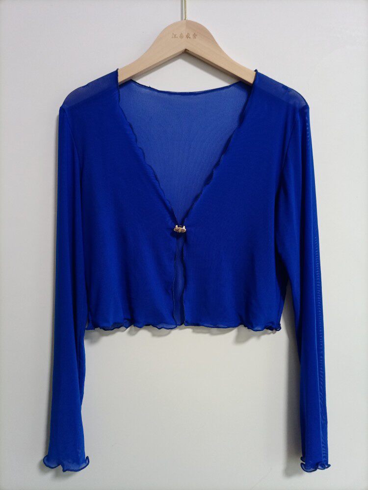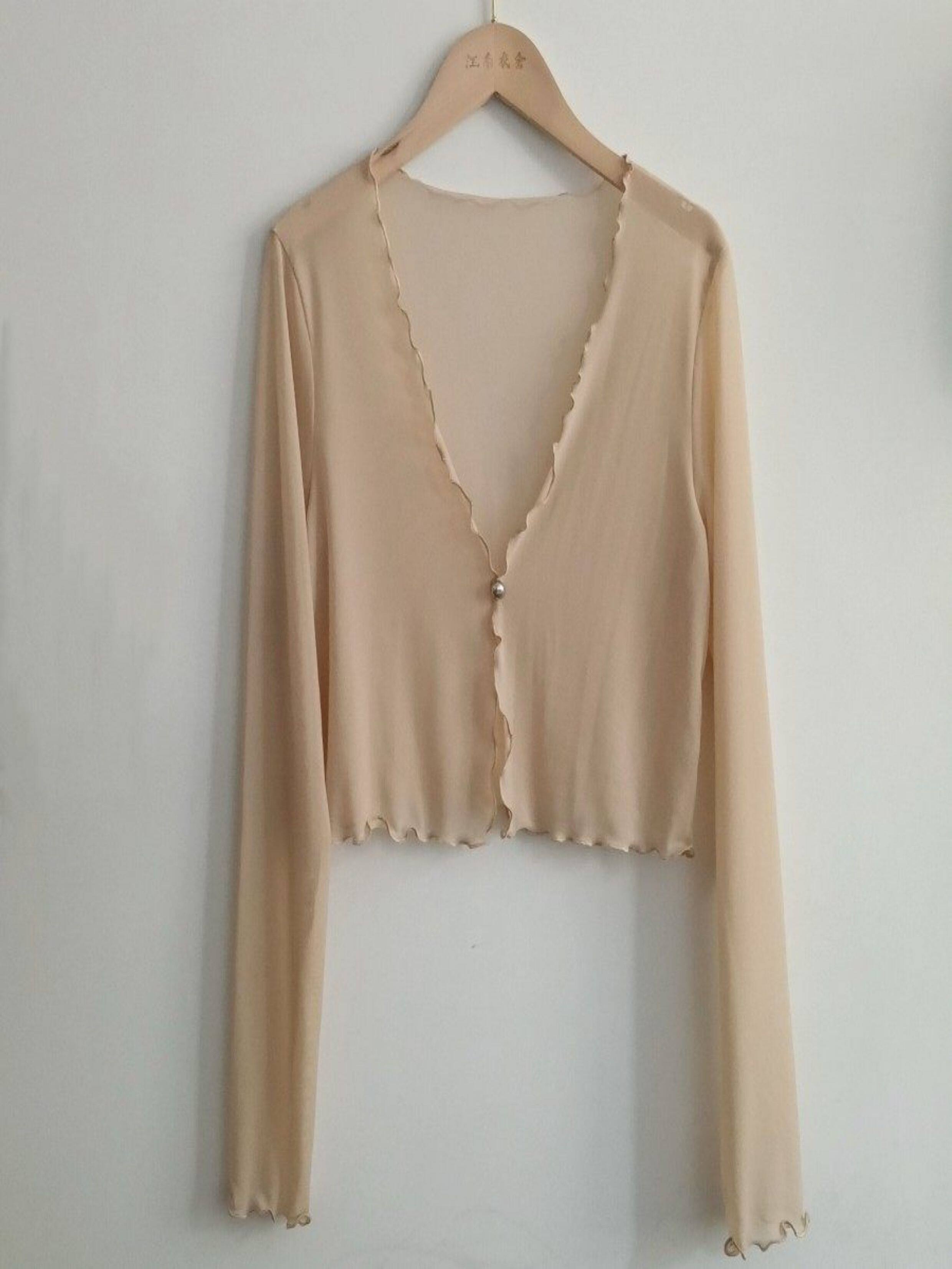 性感半透明夏季長袖冰絲網紗外披上衣小外套短款薄V領開衫空調衫