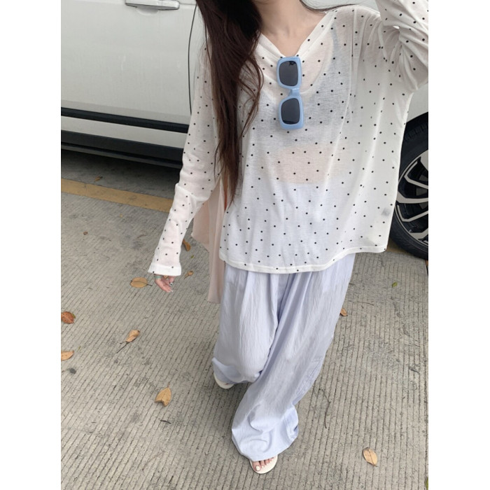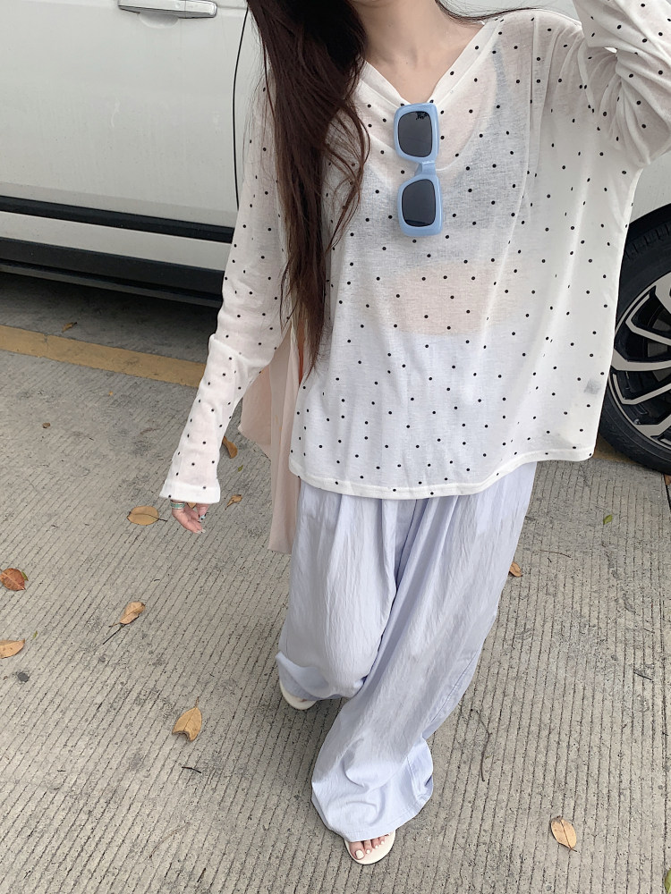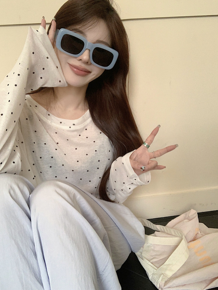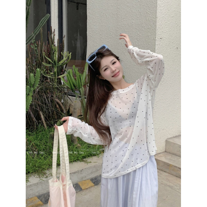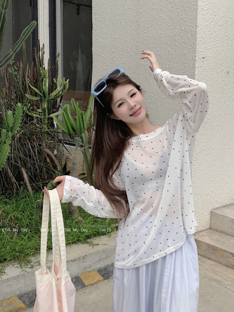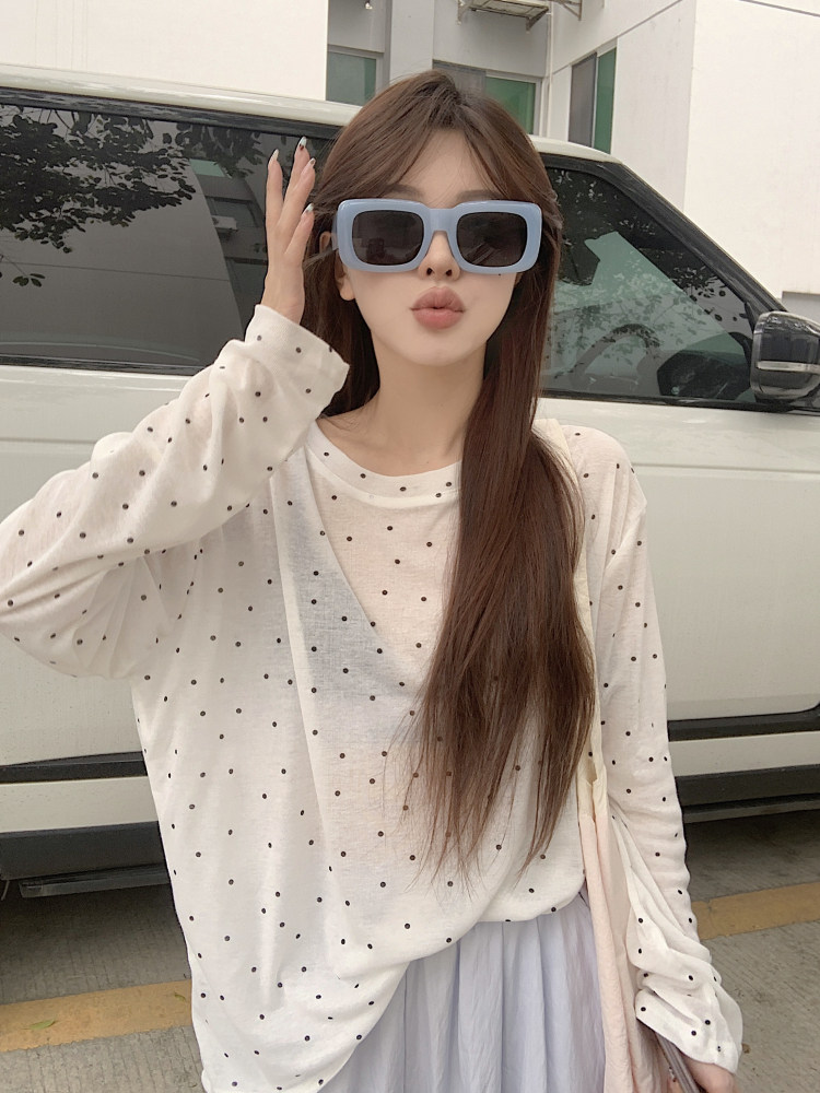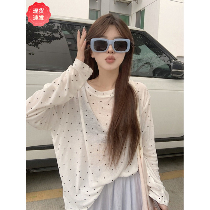 韓版簡約波點防曬罩衫薄款長袖T恤女夏季新款洋氣寬鬆休閒上衣潮