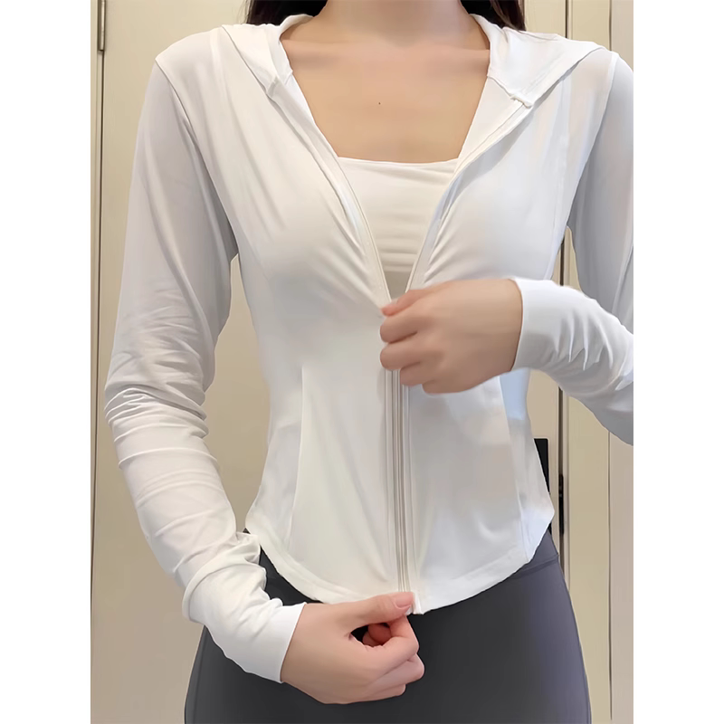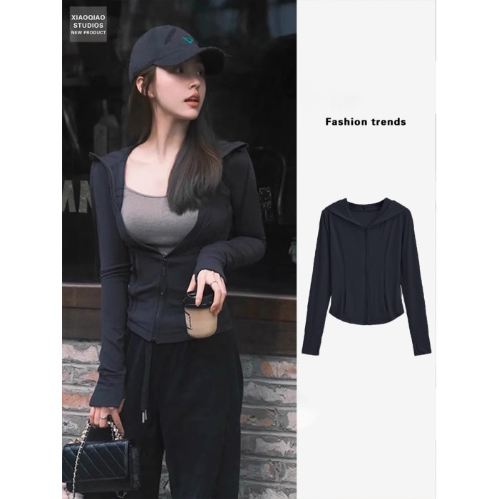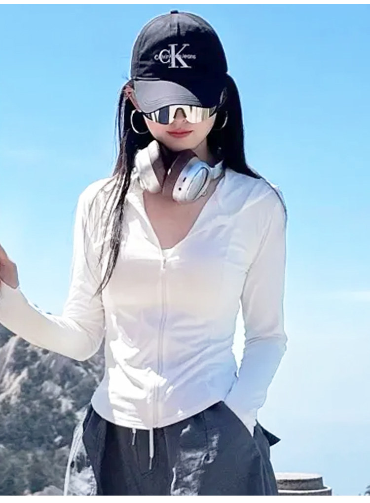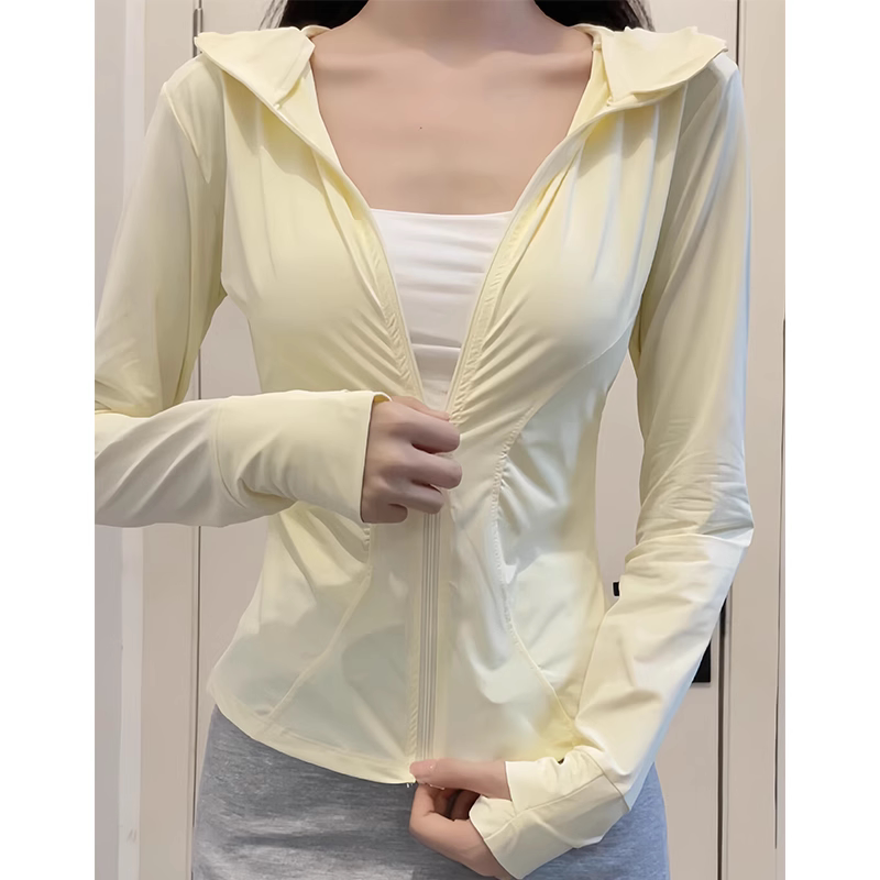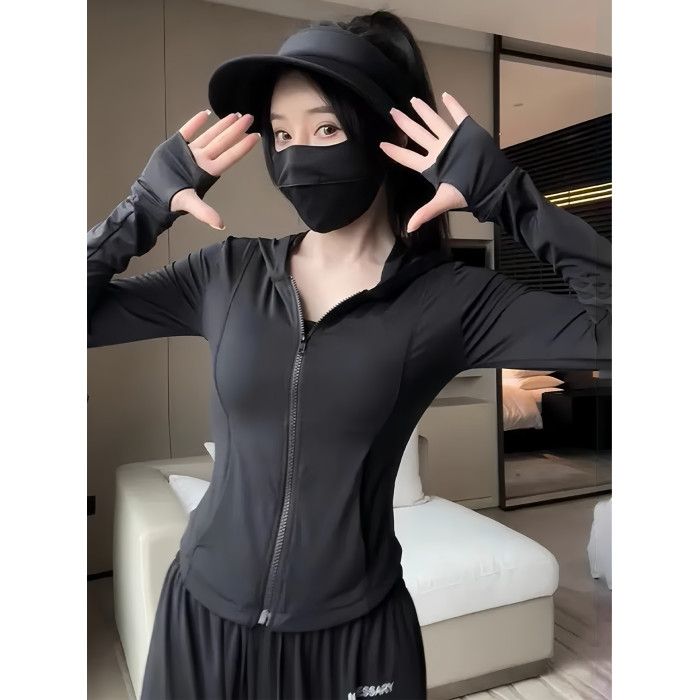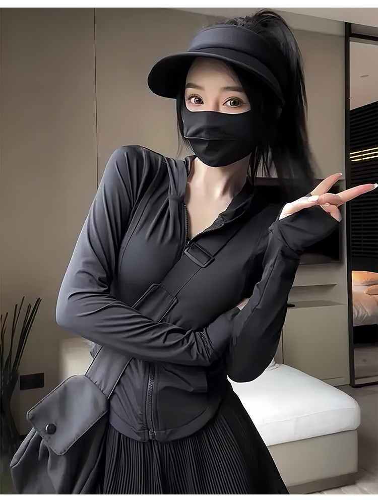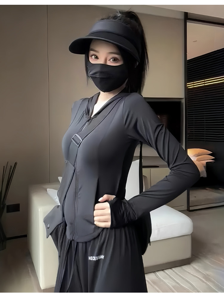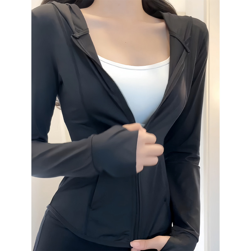 黑色冰絲防曬衣女款夏季透氣防紫外線修身顯瘦連帽運動瑜珈服外套