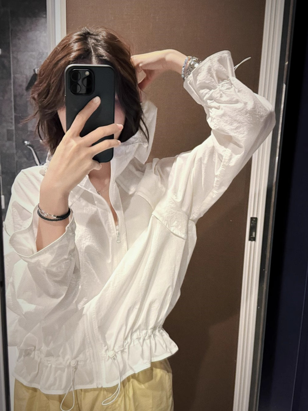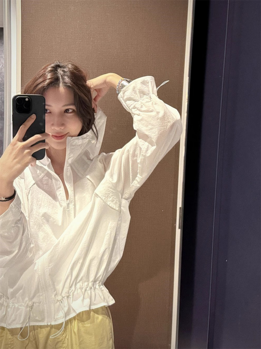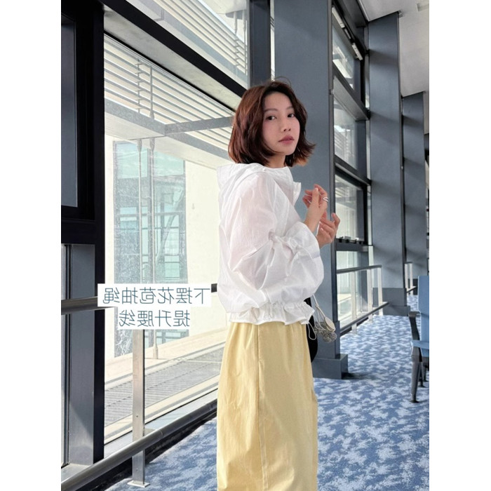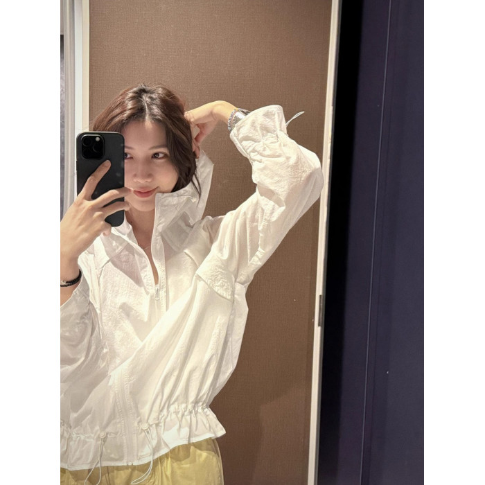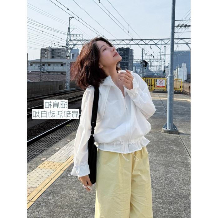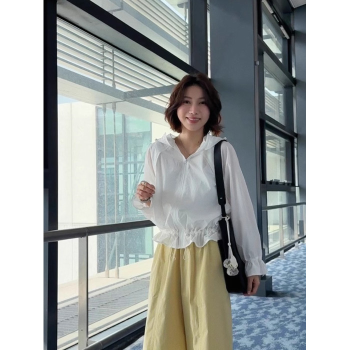 2026夏季休閒運動風抽繩連帽輕薄防曬罩衫時尚花邊長袖襯衫上衣女