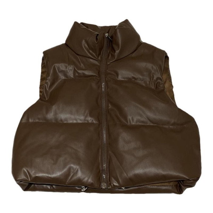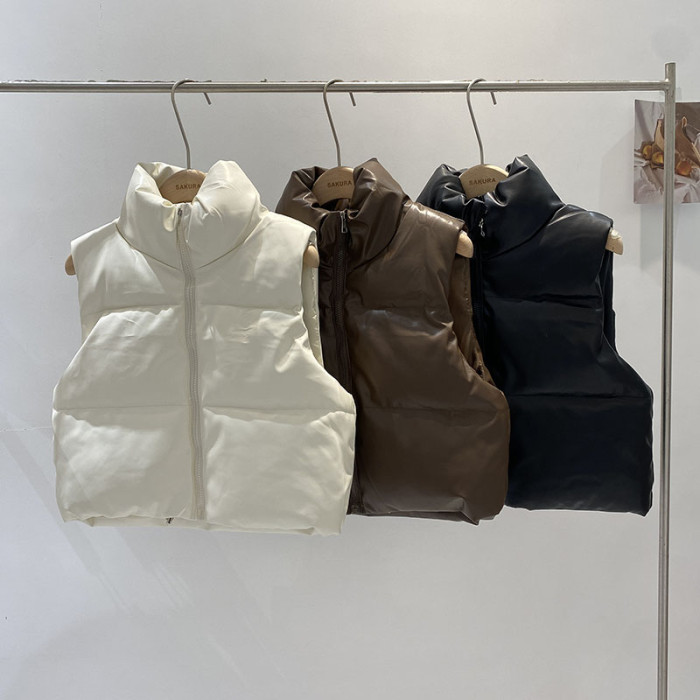 PU皮高領棉服馬甲外套女冬季2024新款韓版保暖立領背心馬夾棉衣潮