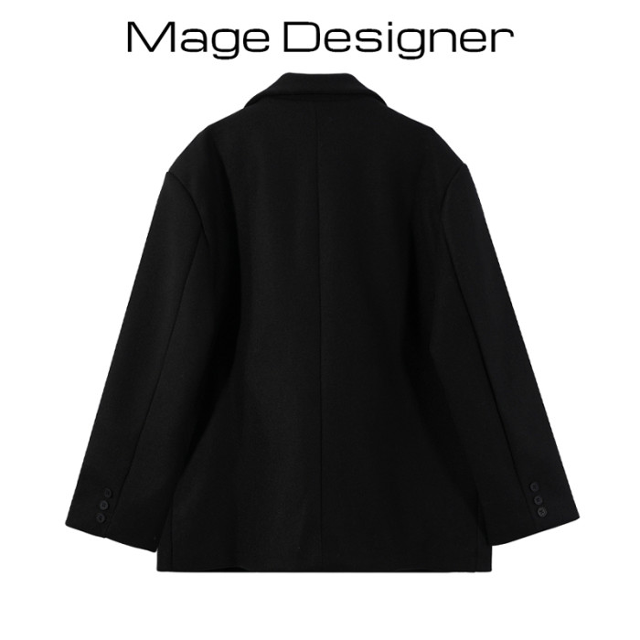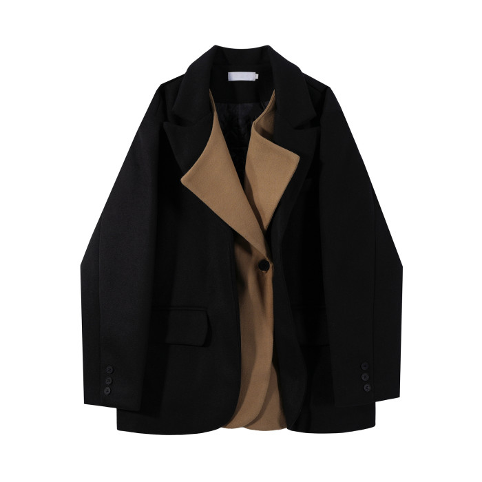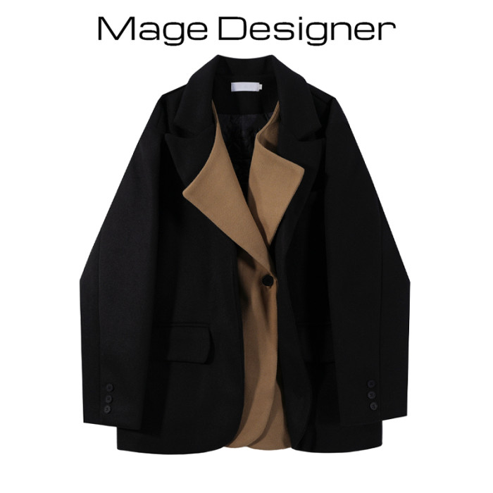 拼色設計感加厚毛呢西裝外套女冬季保暖防風高級感寬松呢子大衣潮