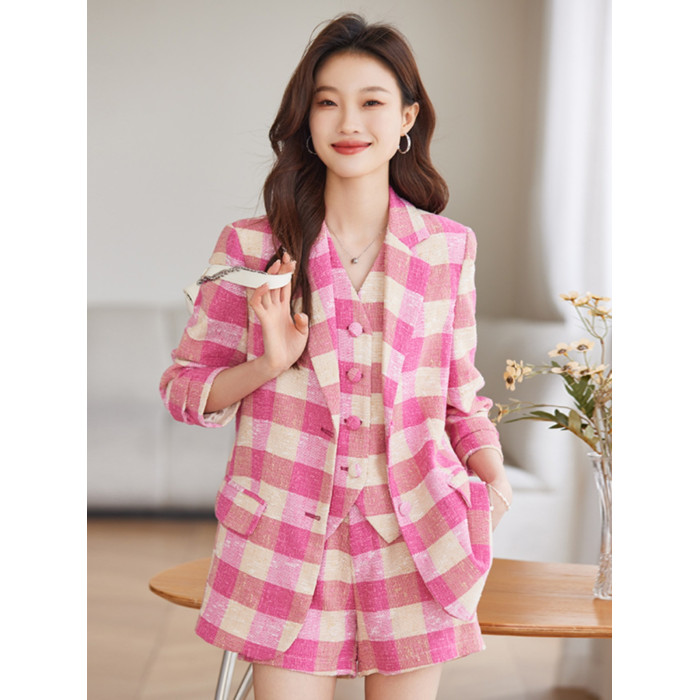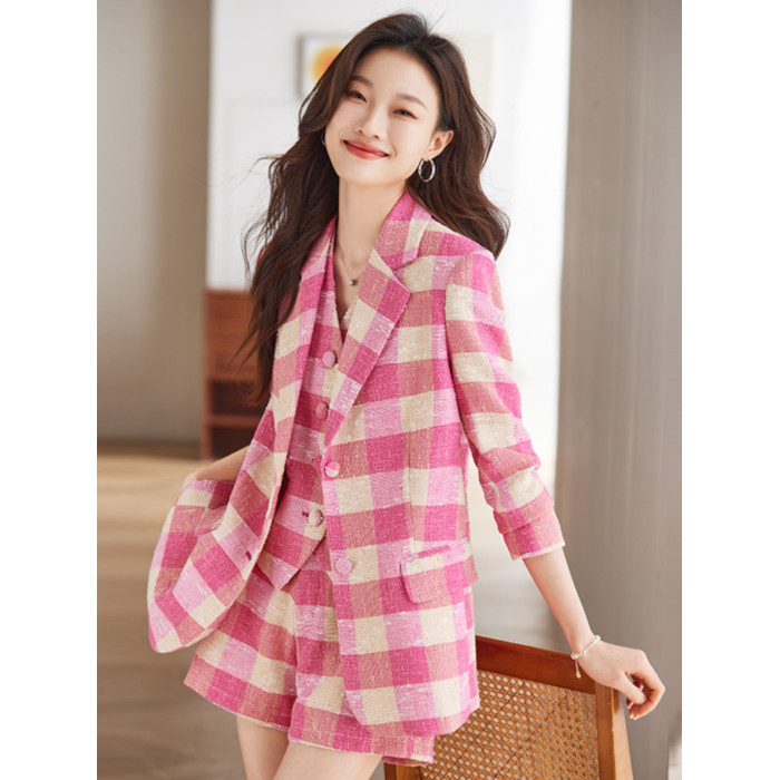西裝外套女今年流行高級感超好看時尚套裝粉色格子西服短褲三件套