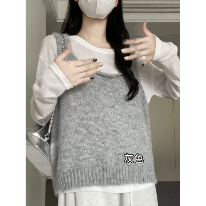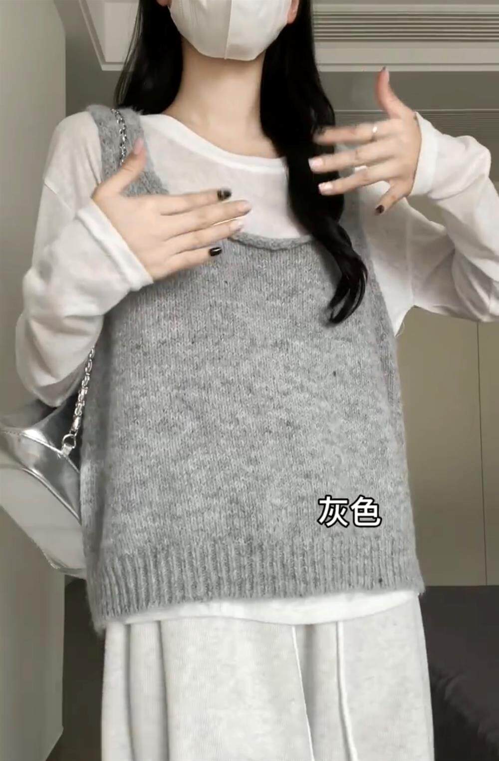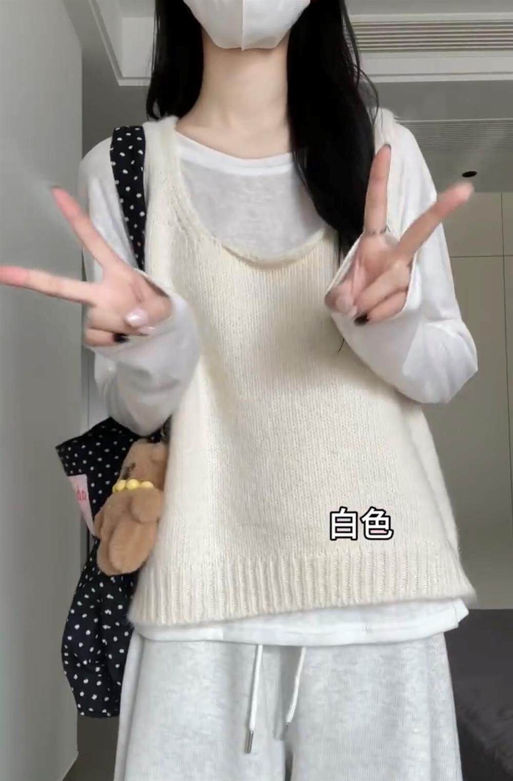韓系春夏新款馬海毛針織背心女u領吊帶無袖上衣寬鬆曡穿粉色馬甲