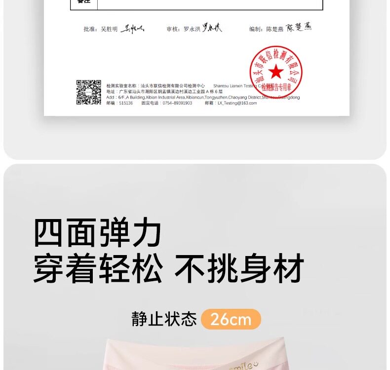 | 襠部材質成分 | 粘膠纖維(粘纖)88.4% 聚氨酯彈性纖維(氨綸)5% 桑蠶絲3.8% 聚醯胺纖維(錦綸)2.8% |