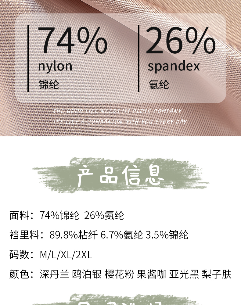 | 襠部材質成分 | 粘膠纖維(粘纖)89.8% 聚氨酯彈性纖維(氨綸)6.7% 聚醯胺纖維(錦綸)3.5% |