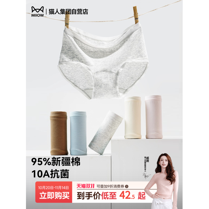 貓人全棉內褲女25新款純棉10A抗菌襠中腰無痕三角褲夏季透氣親膚
