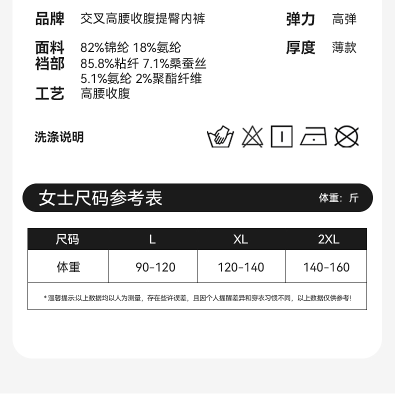 | 襠部材質成分 | 粘膠纖維(粘纖)85.8% 桑蠶絲7.1% 聚氨酯彈性纖維(氨綸)5.1% 聚酯纖維2% |