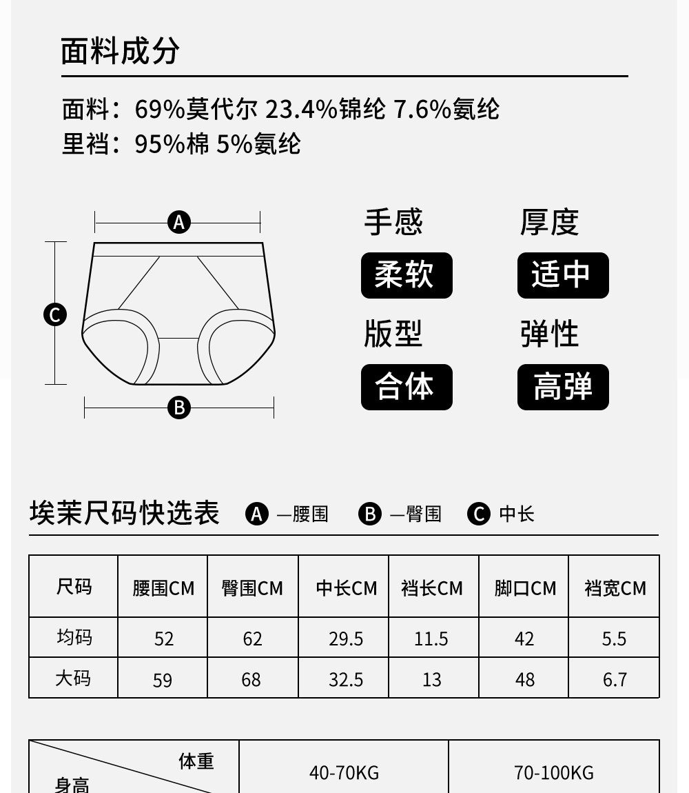 | 材質成分 | 莫代爾纖維(莫代爾)69% 聚醯胺纖維(錦綸)23.4% 聚氨酯彈性纖維(氨綸)7.6% |