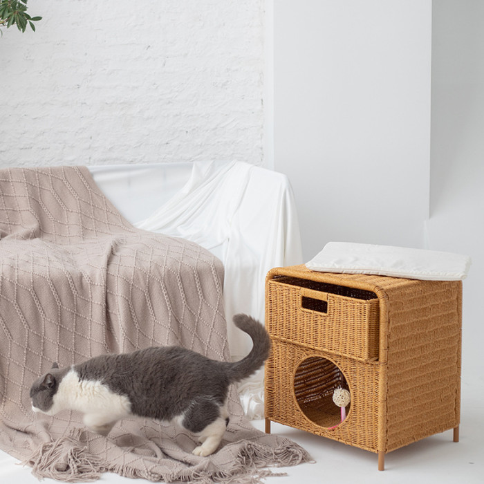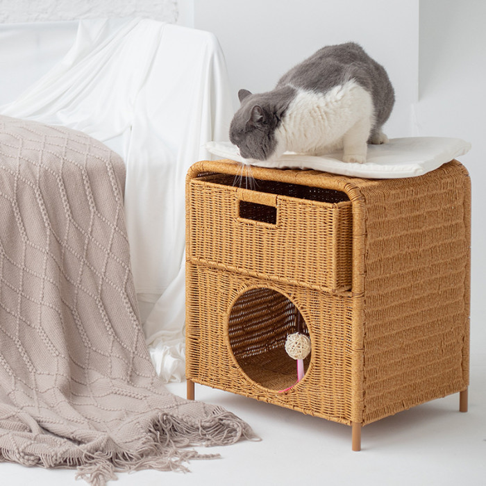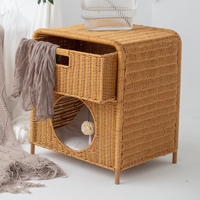 手工編織寵物窩四季通半封閉雙層貓屋半封閉房子藤編床頭櫃貓窩