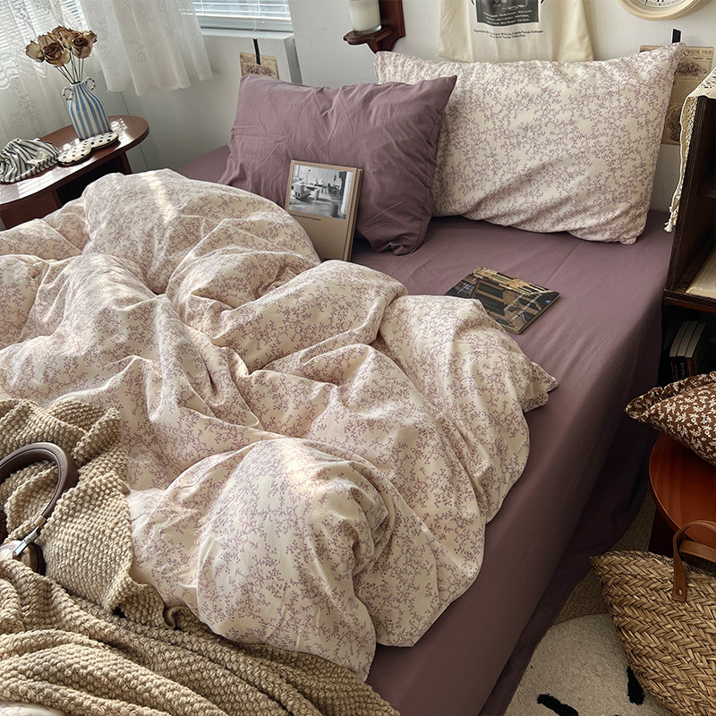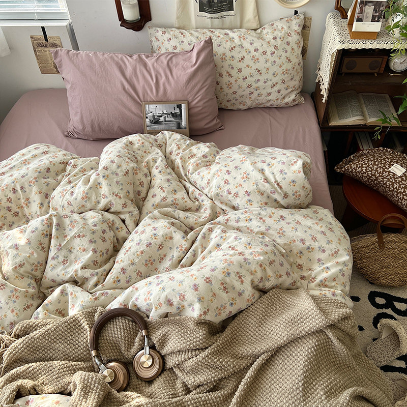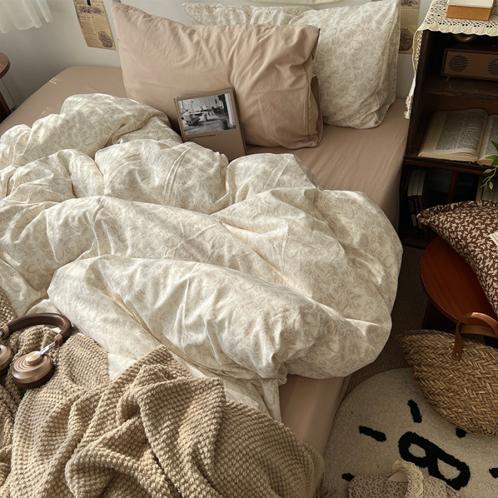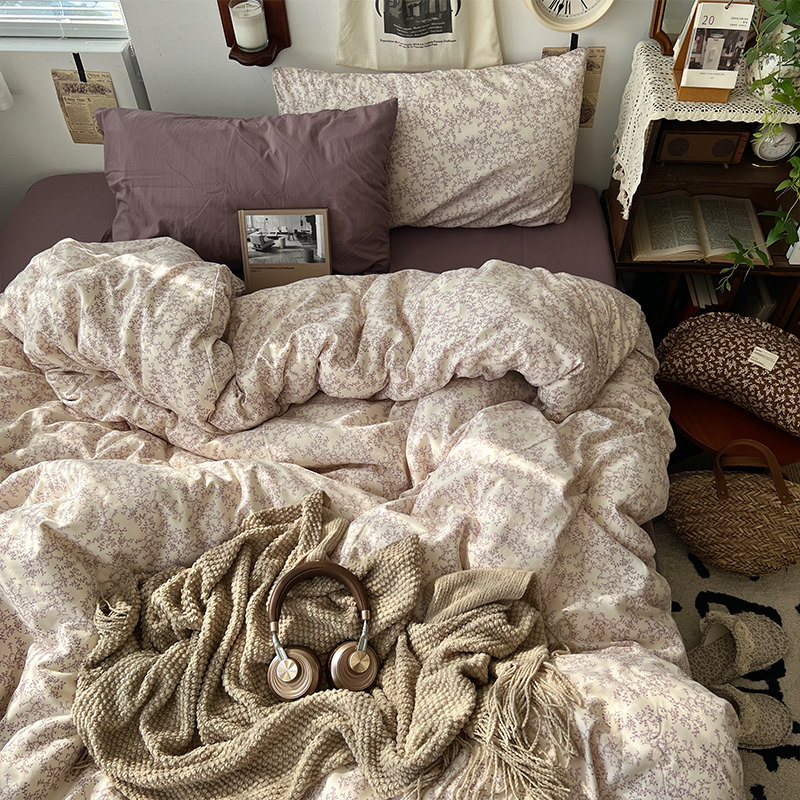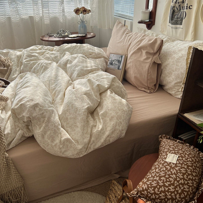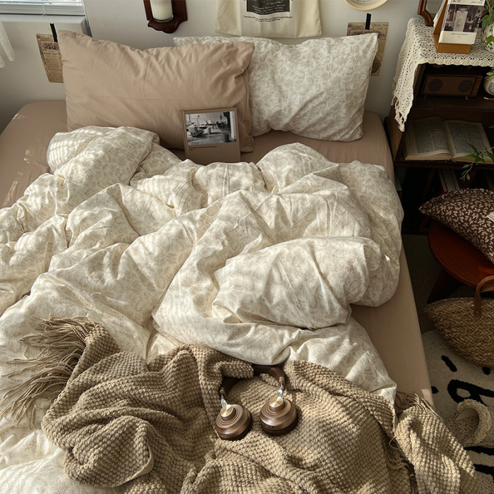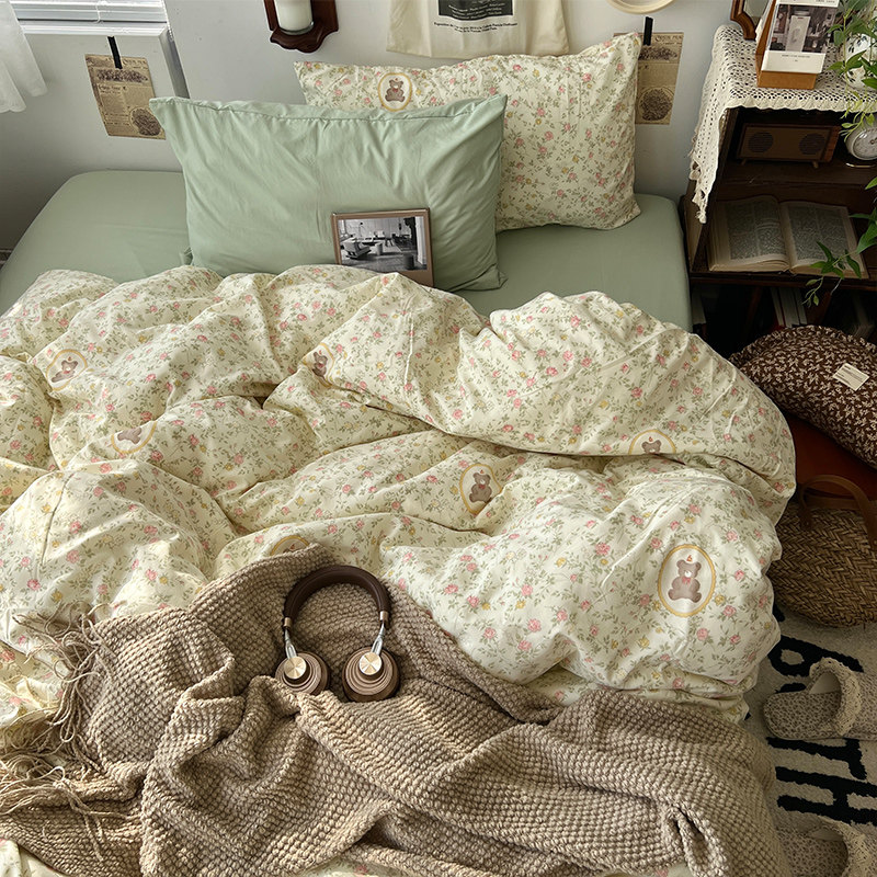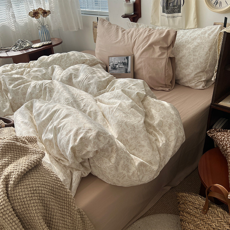法式風ins復古奶茶水墨花小兔四件套水洗棉1.8床單被套學生三件套