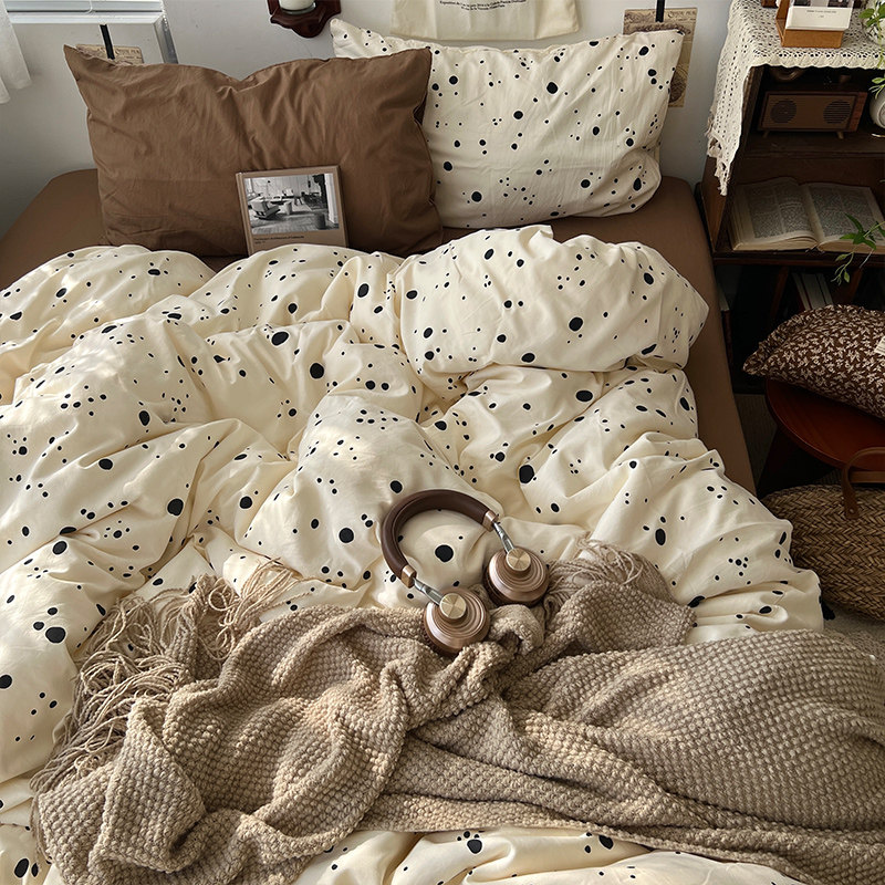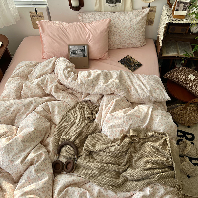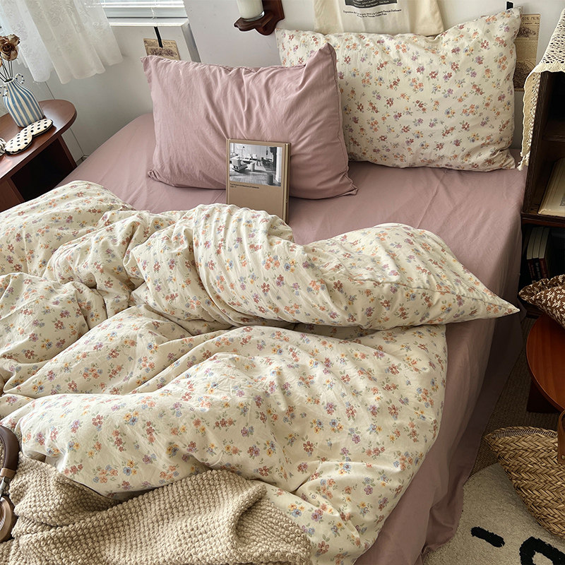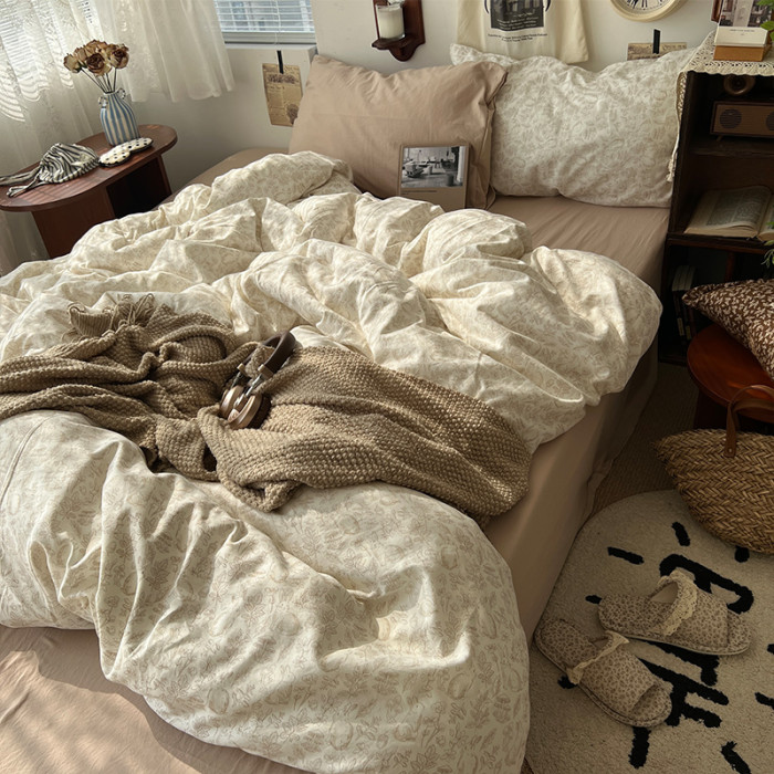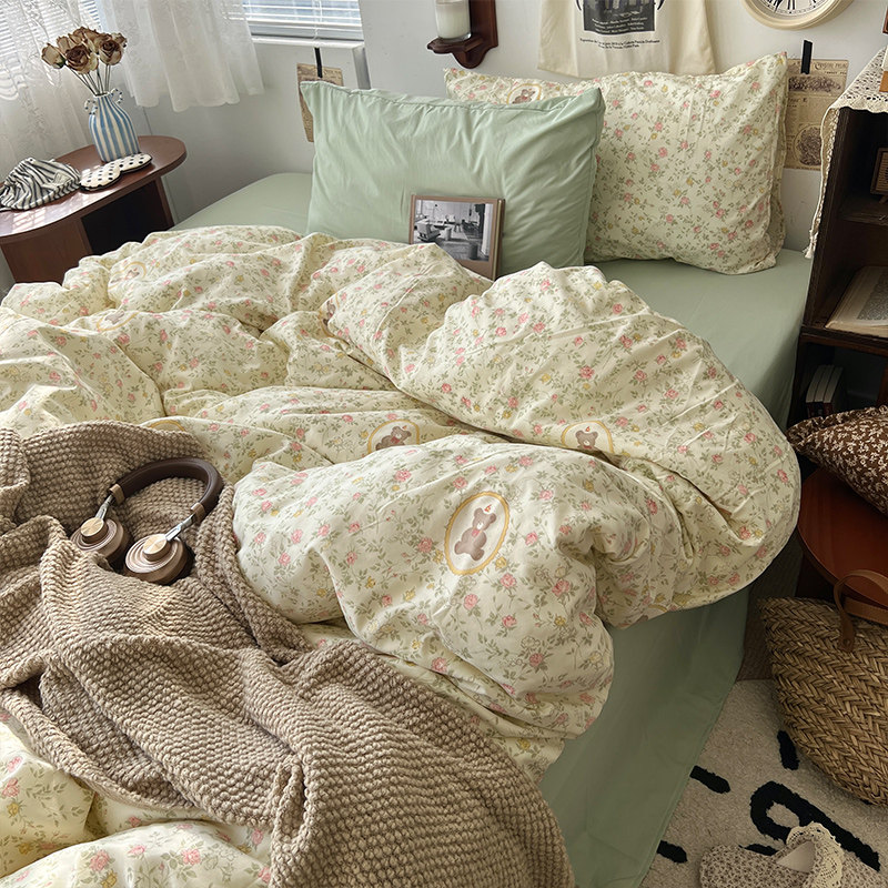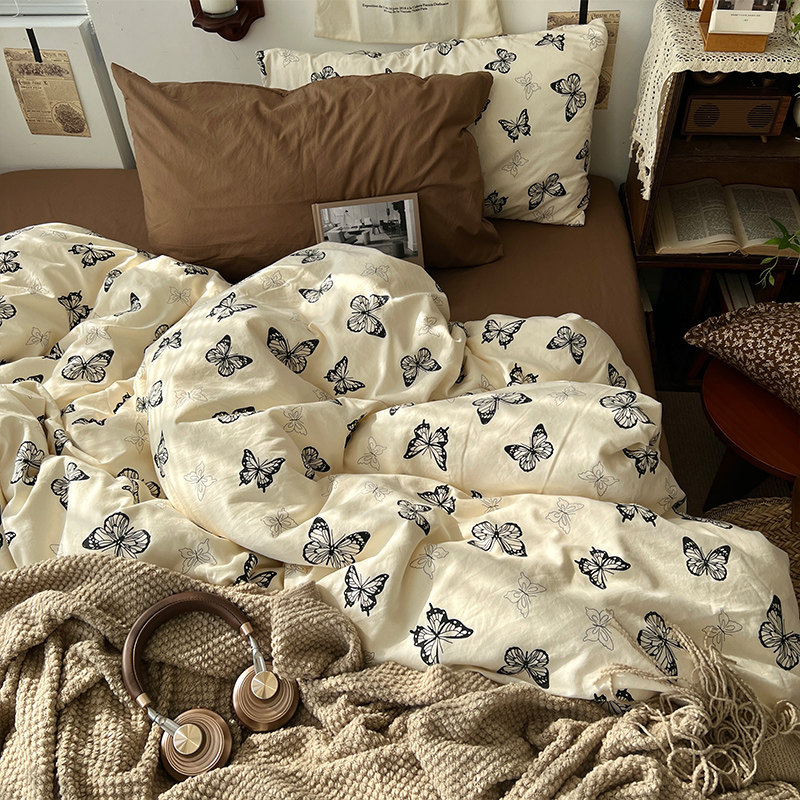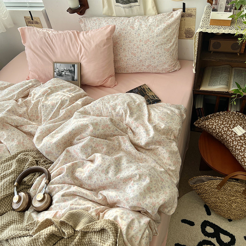 法式風ins復古奶茶水墨花小兔四件套水洗棉1.8床單被套學生三件套