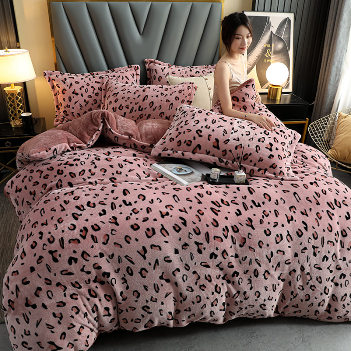 牛奶絨四件套床上用品加厚雙面冬季時尚豹紋珊瑚絨被套床單四件套