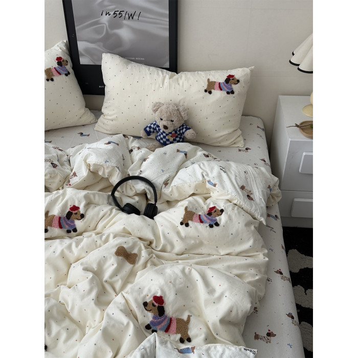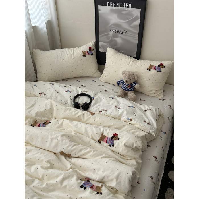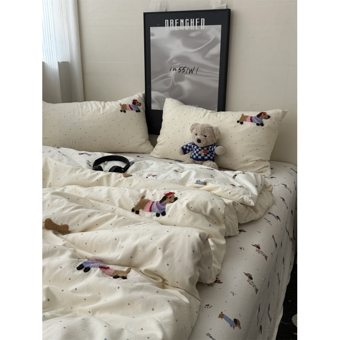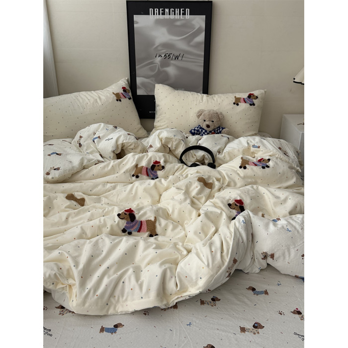 奶油韓系少女心ins卡通臘腸狗毛巾綉水洗棉四件套床單學生三件套