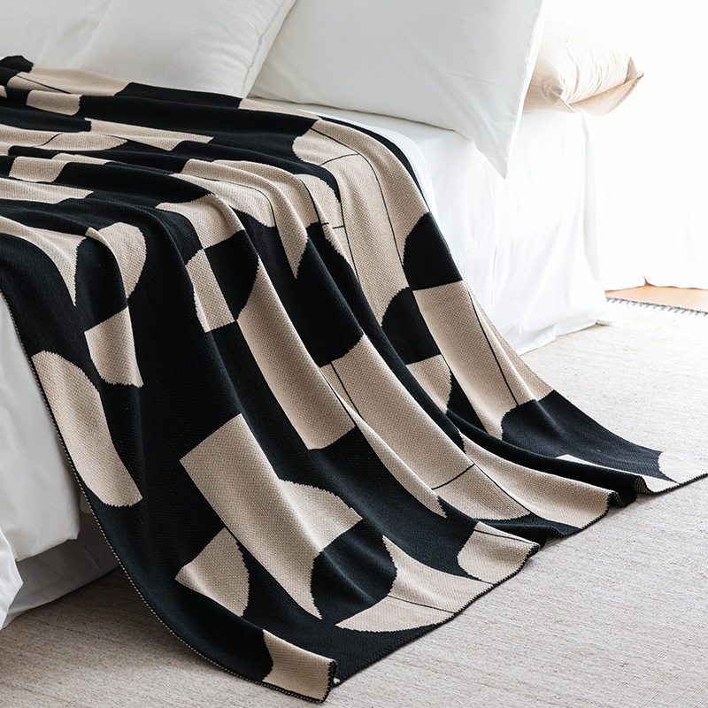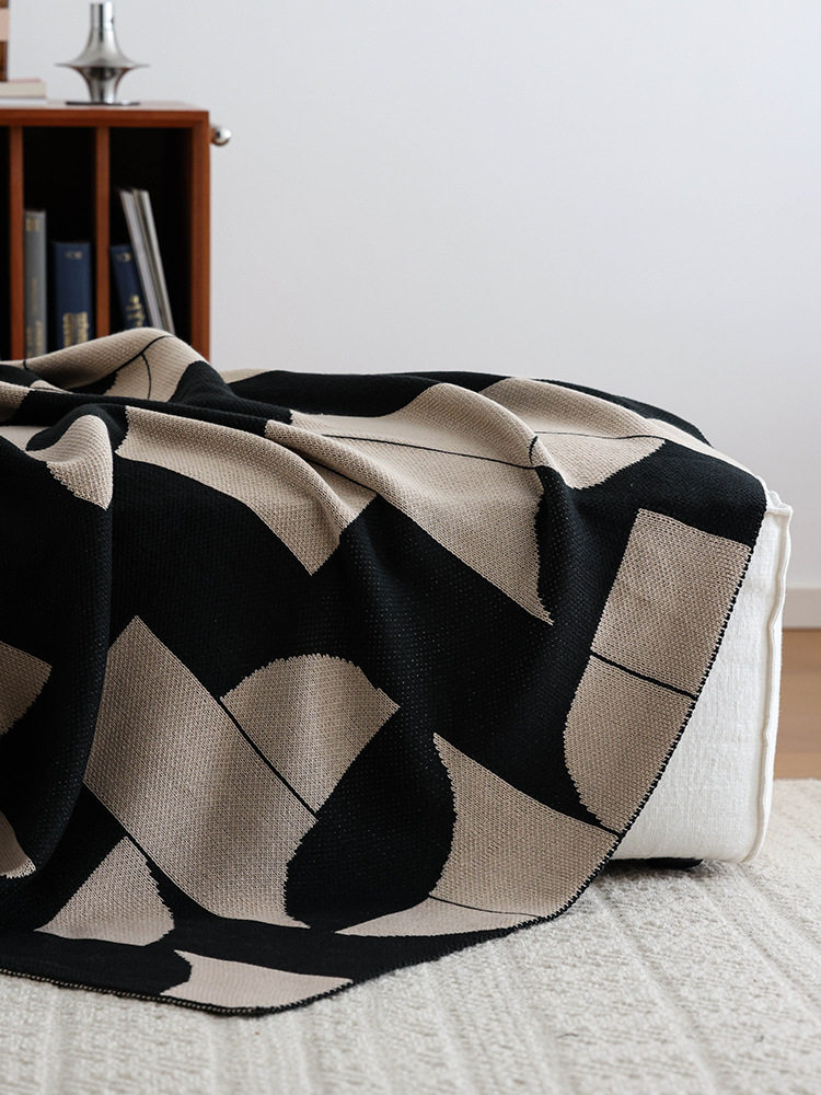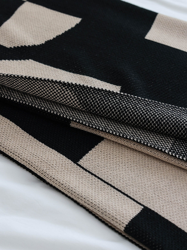 秋冬新款北歐幾何INS風針織半邊絨毛毯沙發裝飾蓋毯午睡絨毯黑咖