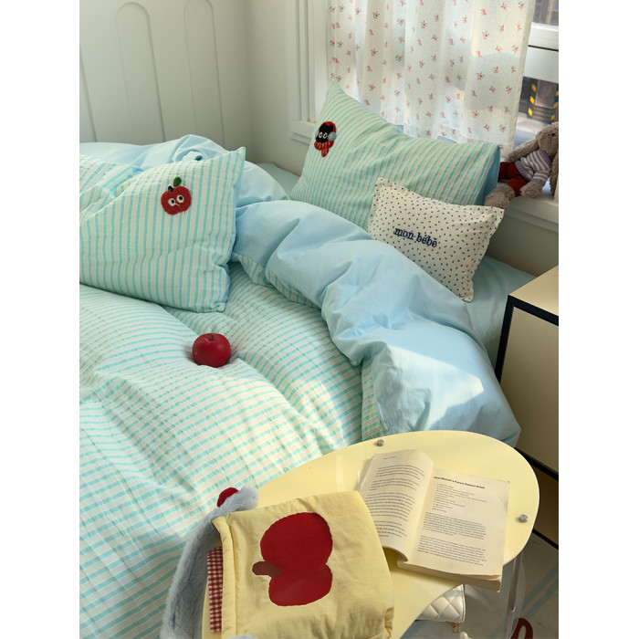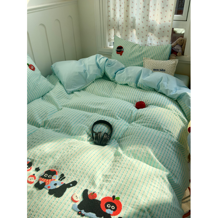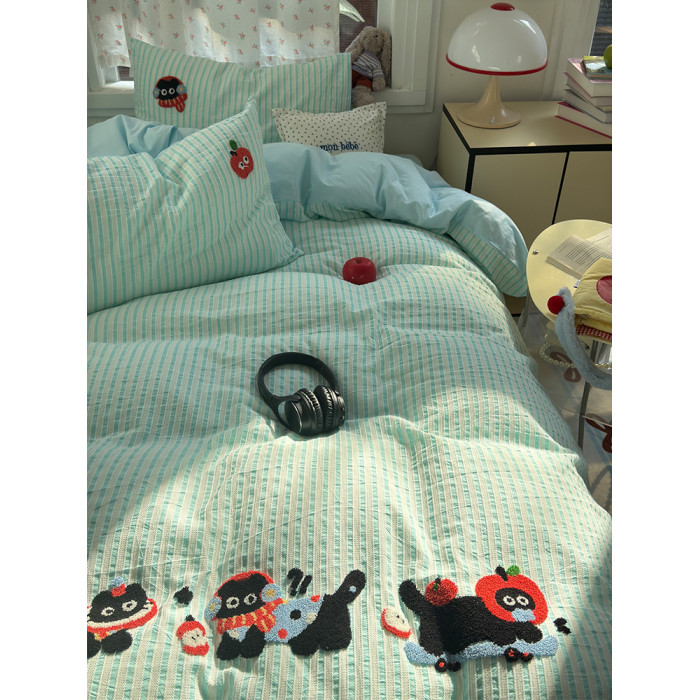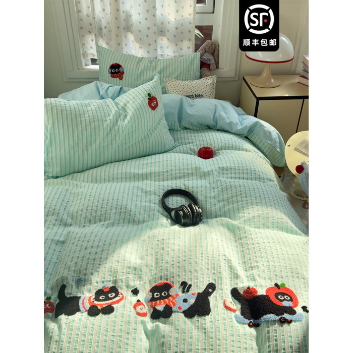 ins提花條紋純棉水洗棉四件套可愛蘋果小貓咪毛巾綉全棉被套床單