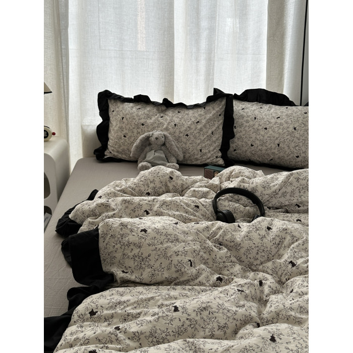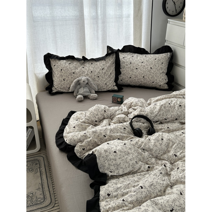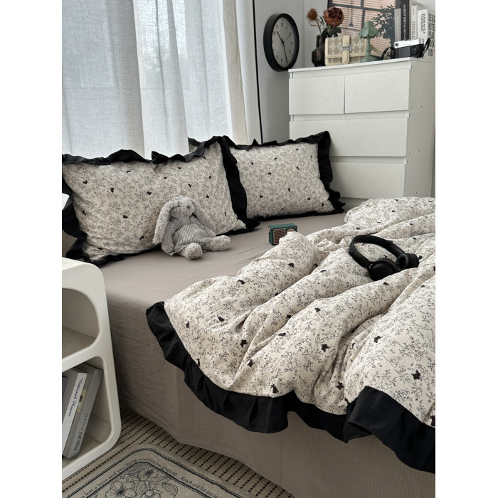 赫本風ins少女心黑色花邊小碎花兔兔水洗棉四件套床單學生三件套