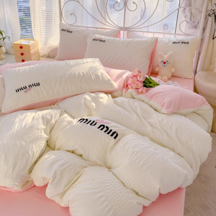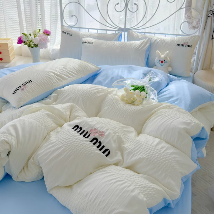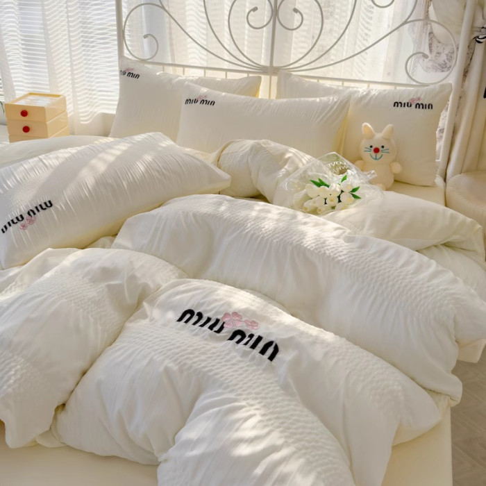 A類母嬰級小清新泡泡紗全棉四件套刺綉被套居家學生宿捨床三件套