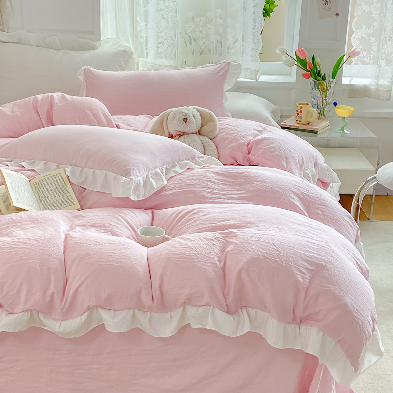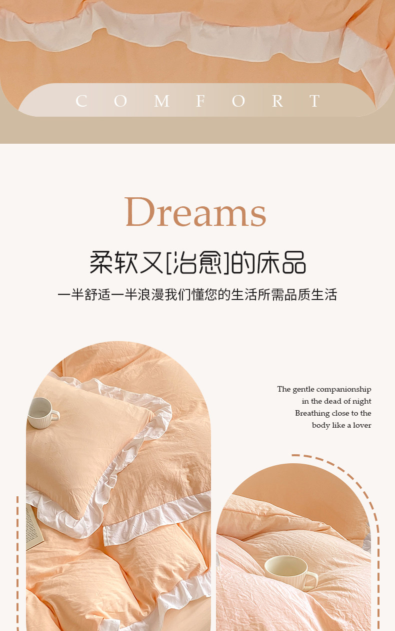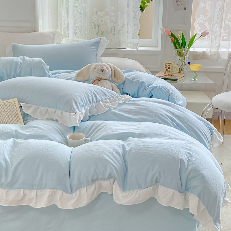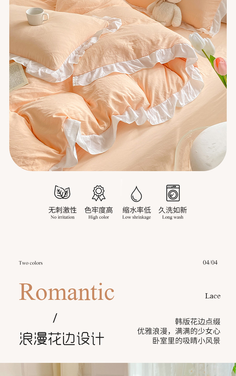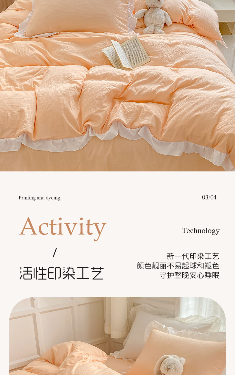公主風水洗棉純色床單被套四件套花邊床上用品大學生宿捨三件套女