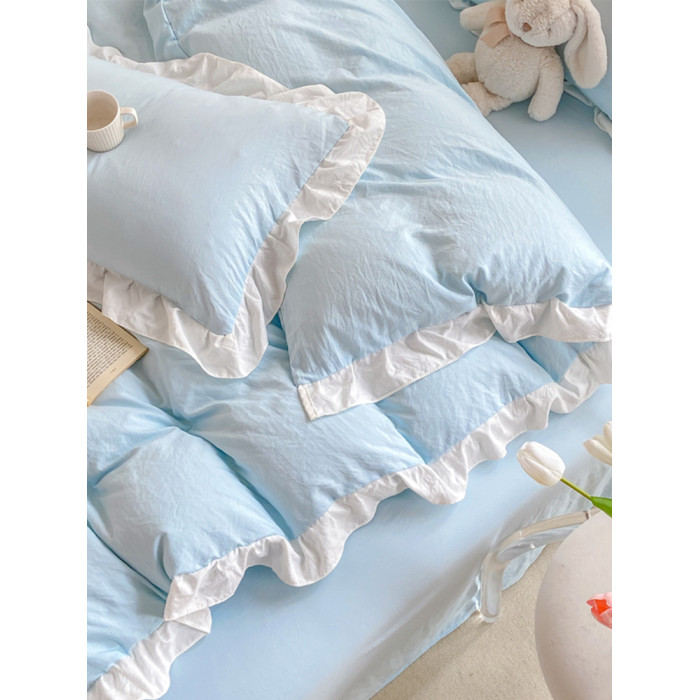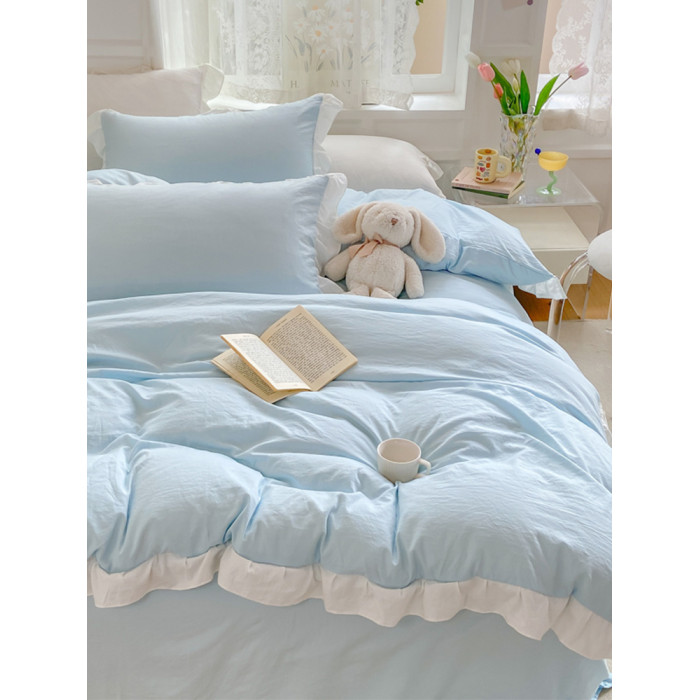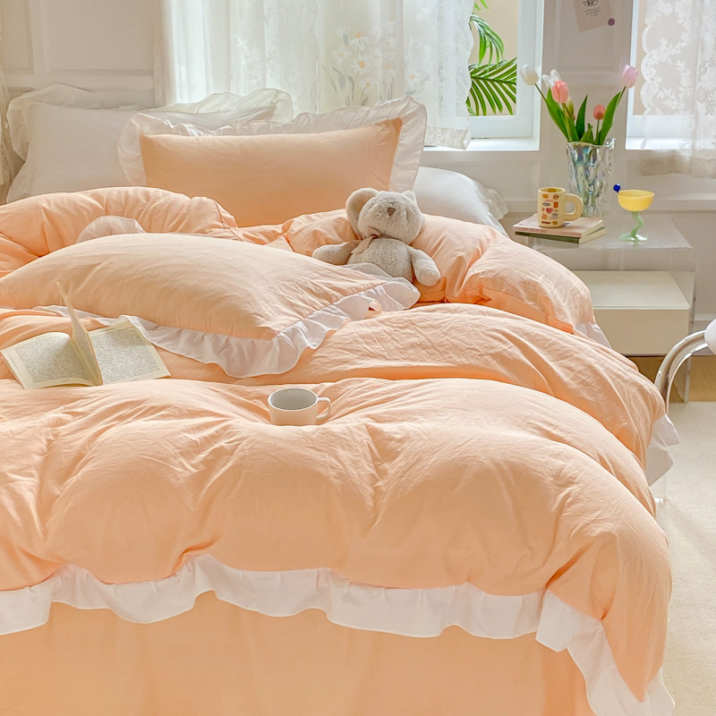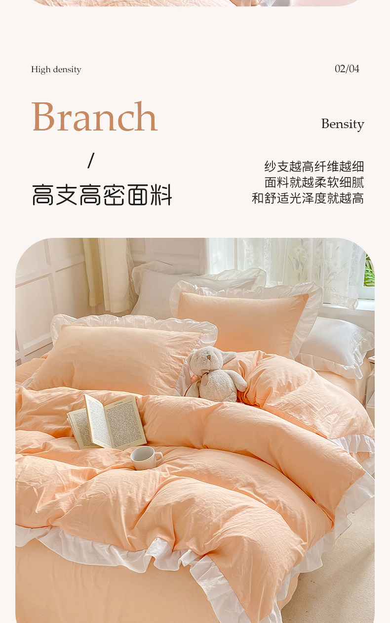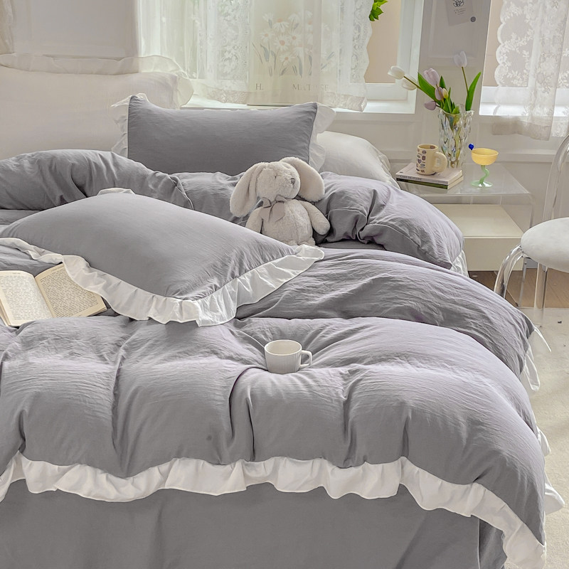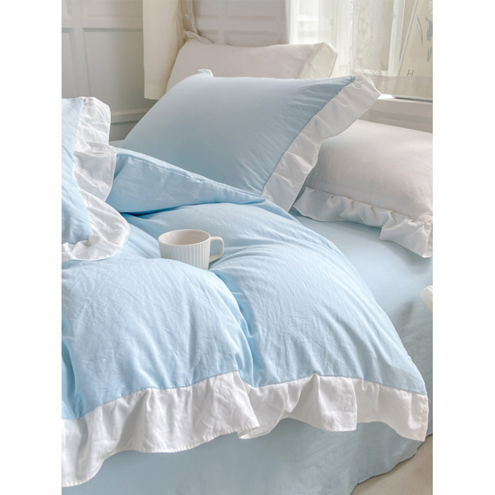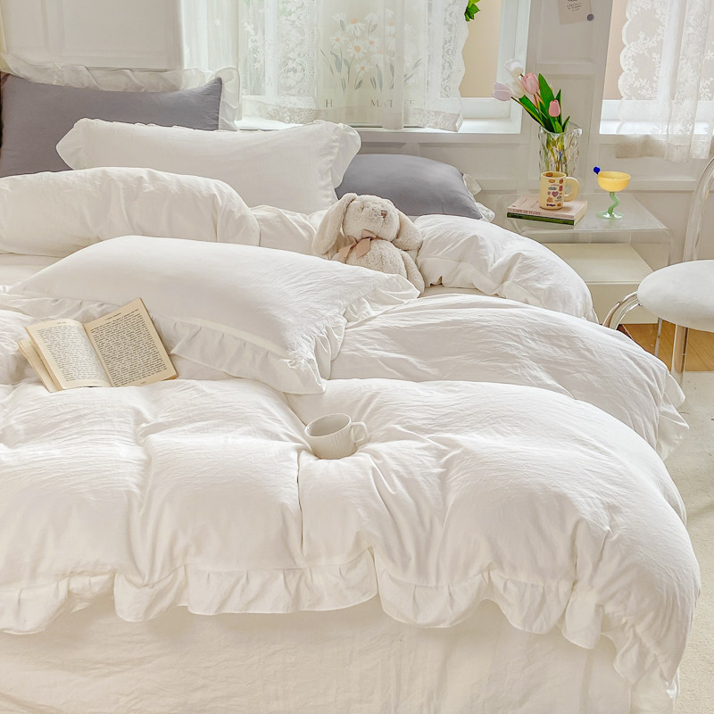 公主風水洗棉純色床單被套四件套花邊床上用品大學生宿捨三件套女