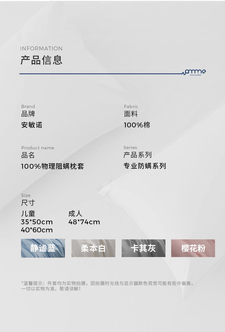 安敏諾防蟎枕套一對裝兒童純棉枕芯套單個除蟎蟲枕頭套48cmx74cm