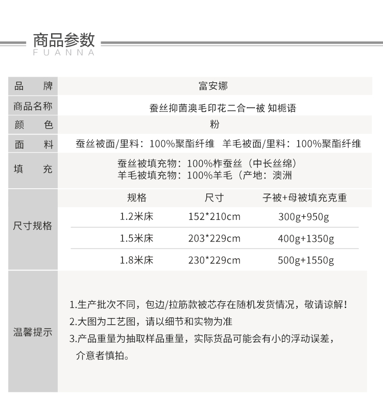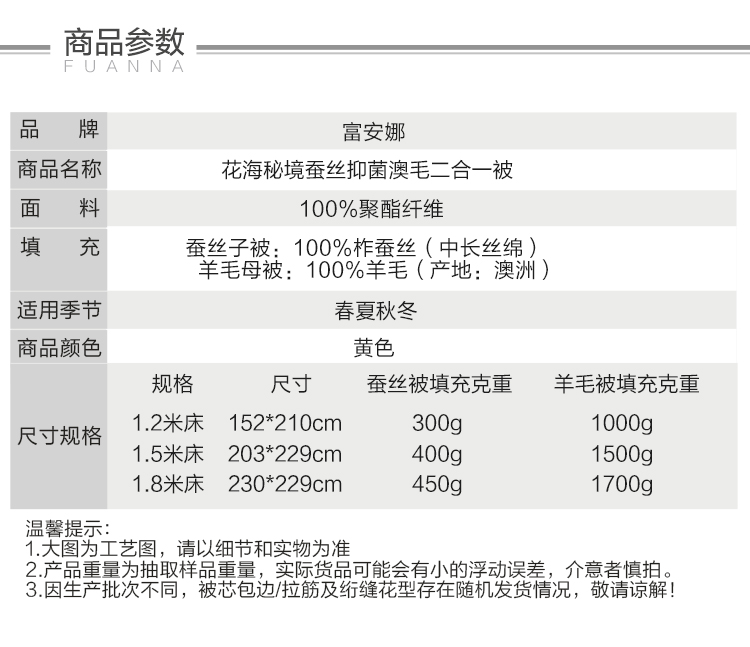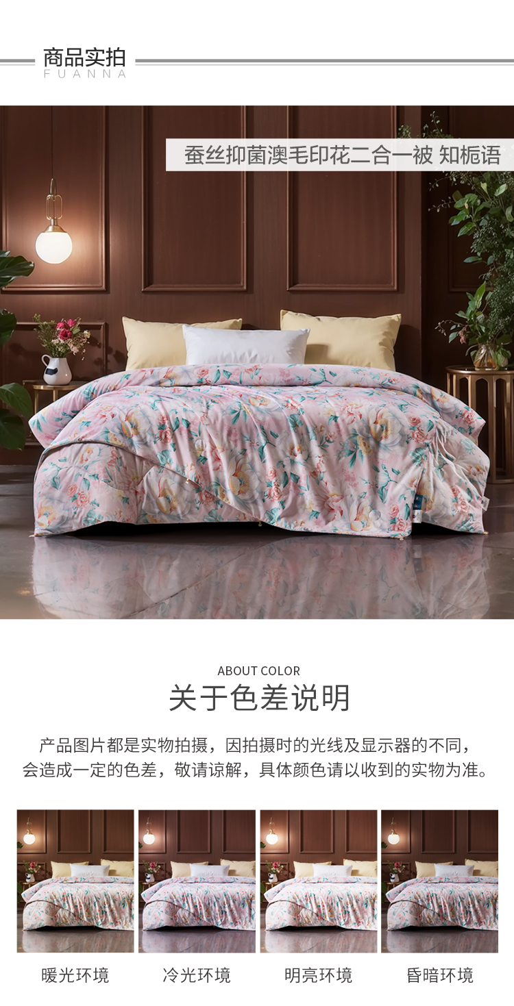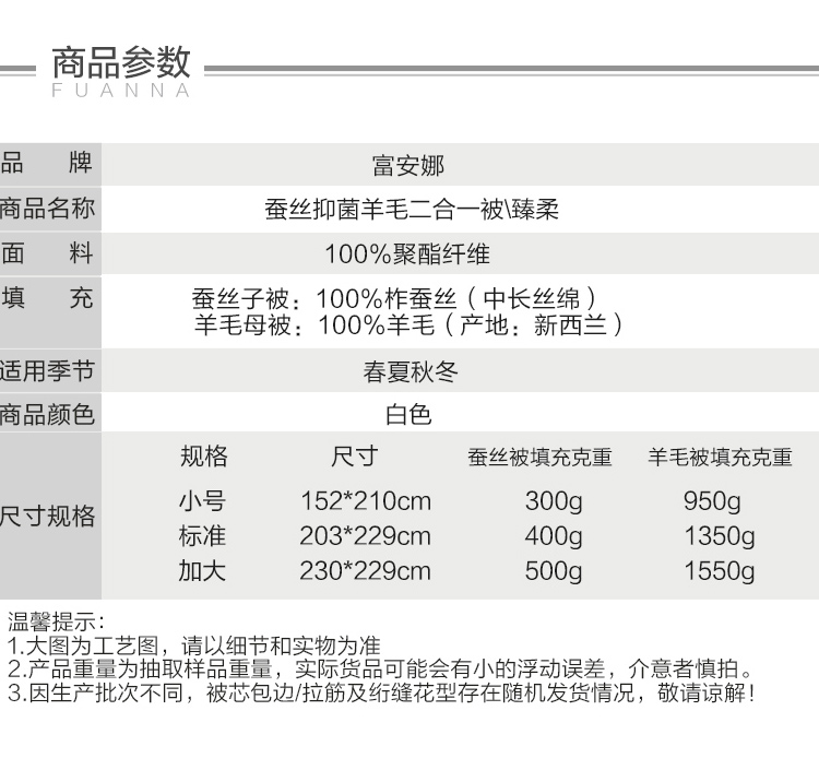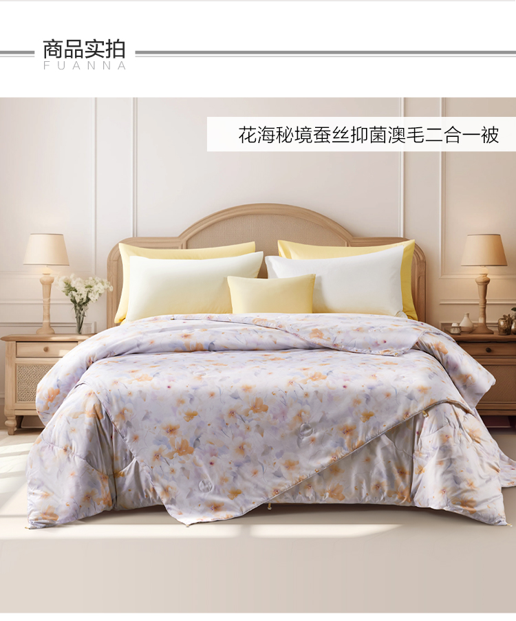 富安娜100%澳洲羊毛冬被蠶絲二合一保暖被子四季通用學生宿舍被芯