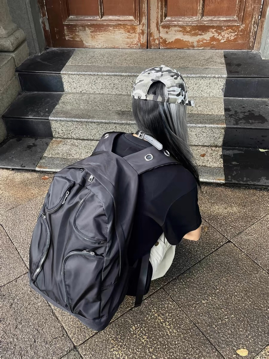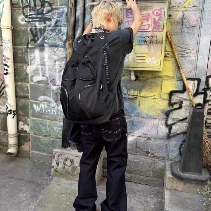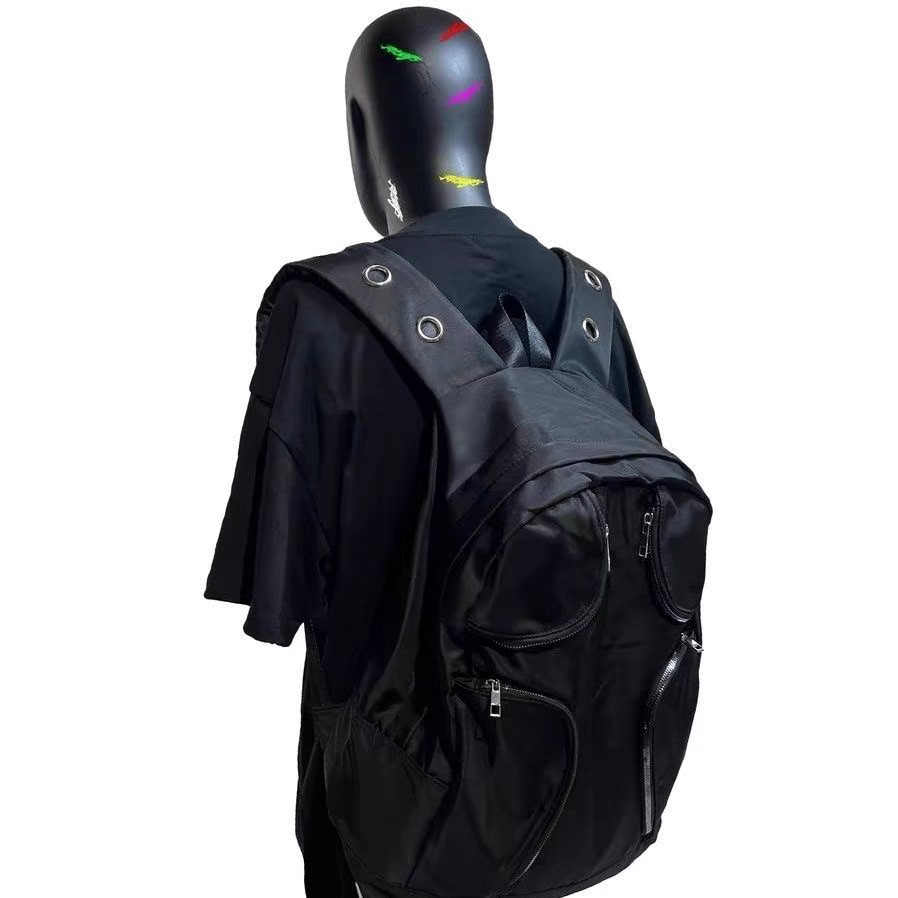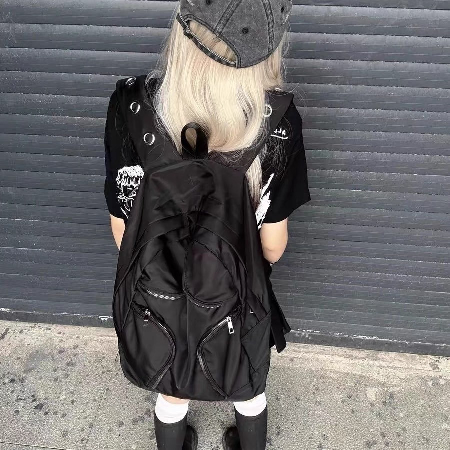 尼龍多口袋戰術大容量雙肩包Y2K千禧黑色異型後後背包女龐克大容量