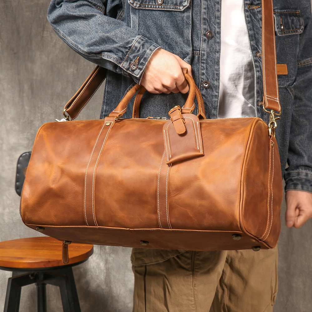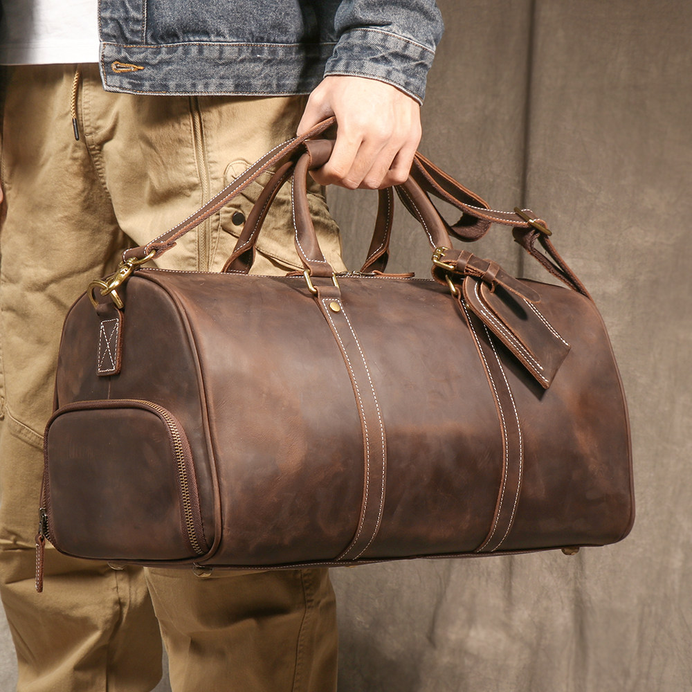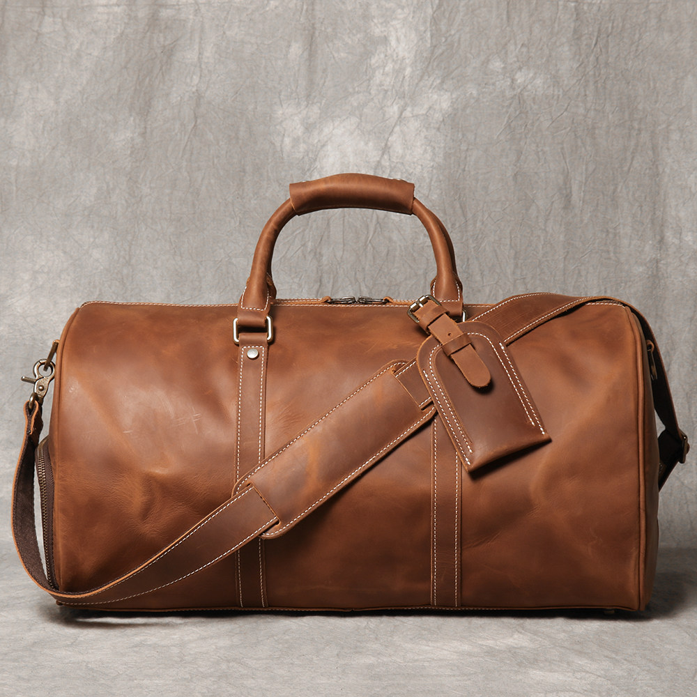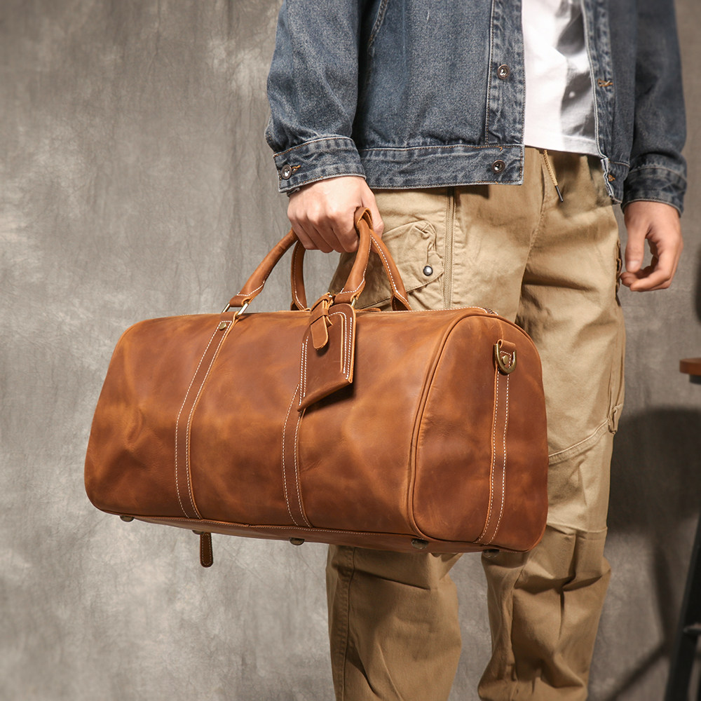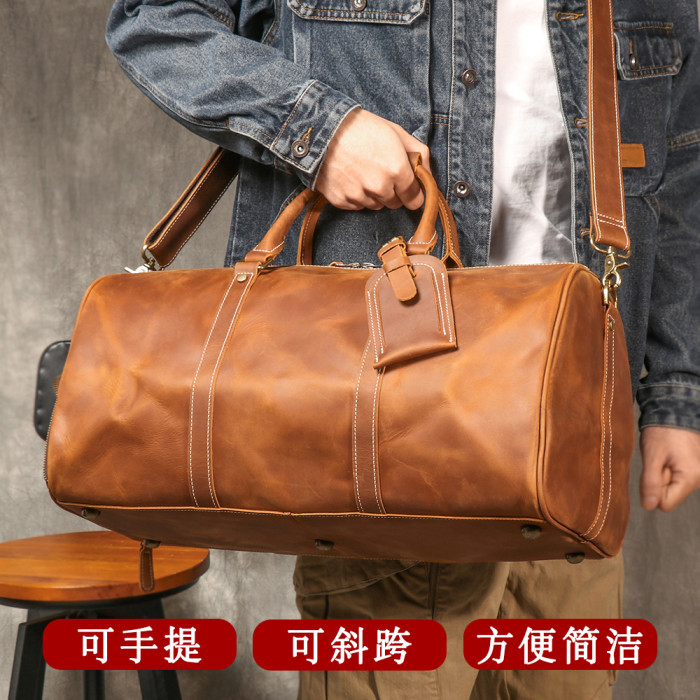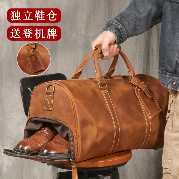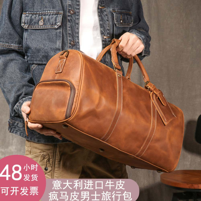 復古男士手提行李袋歐美瘋馬皮出差旅行包頭層牛皮大容量單肩斜背