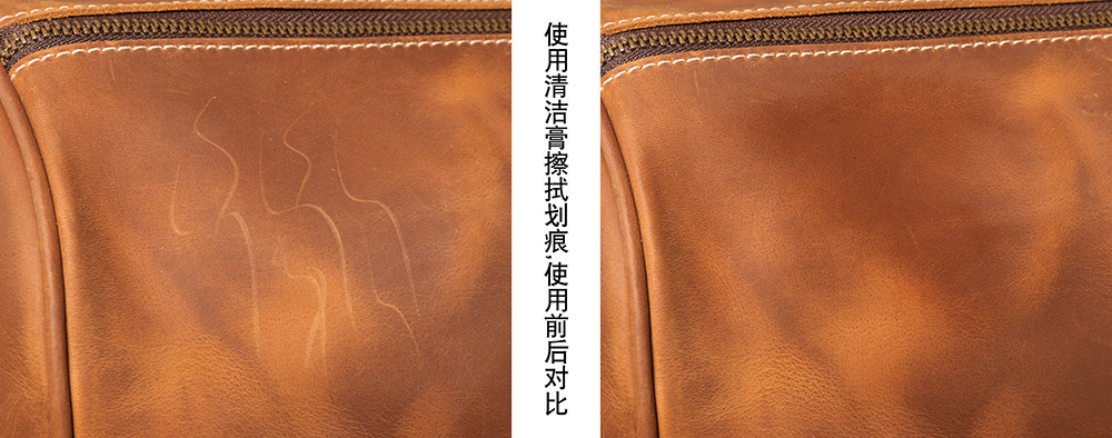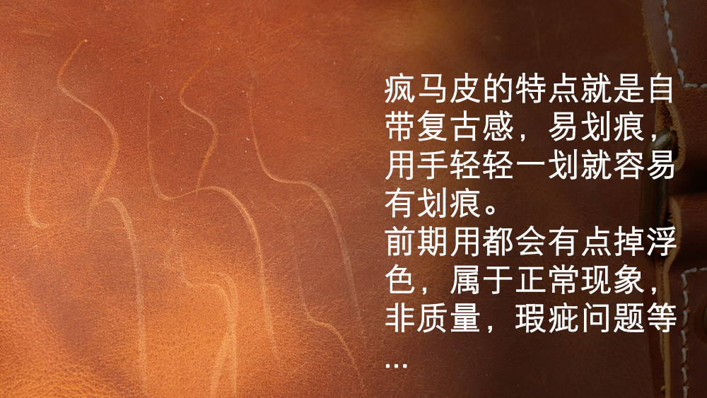 :瘋馬皮的特點就是復古有劃痕,用手輕輕一劃也會有劃痕