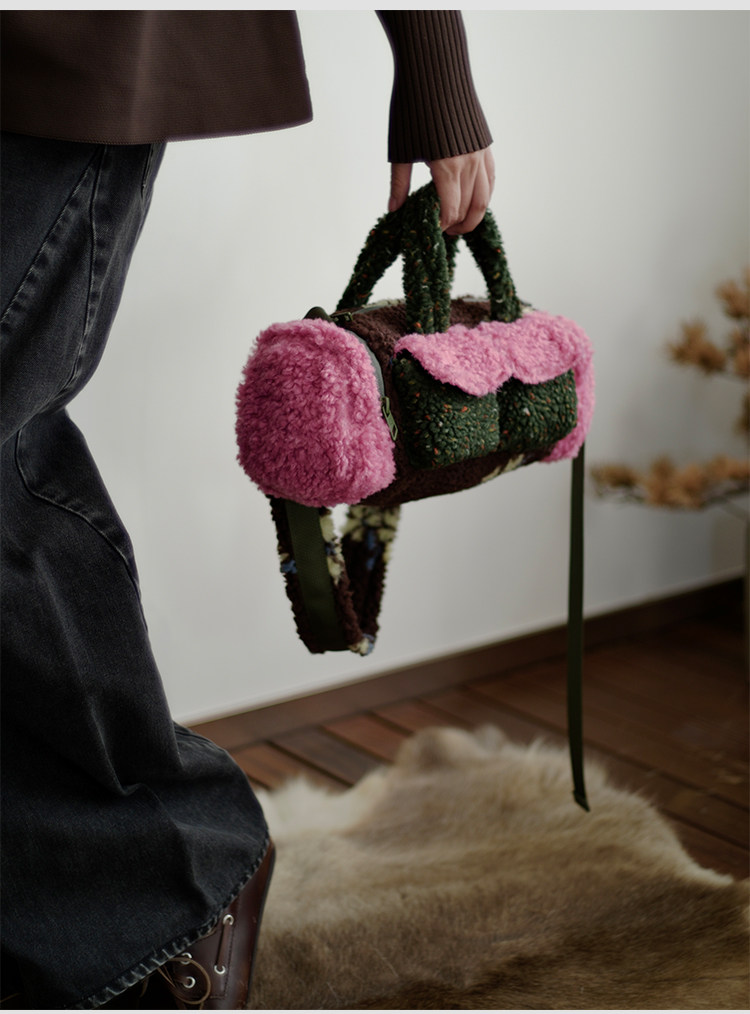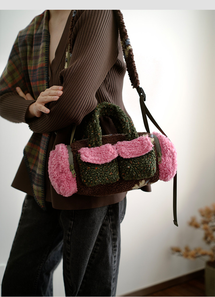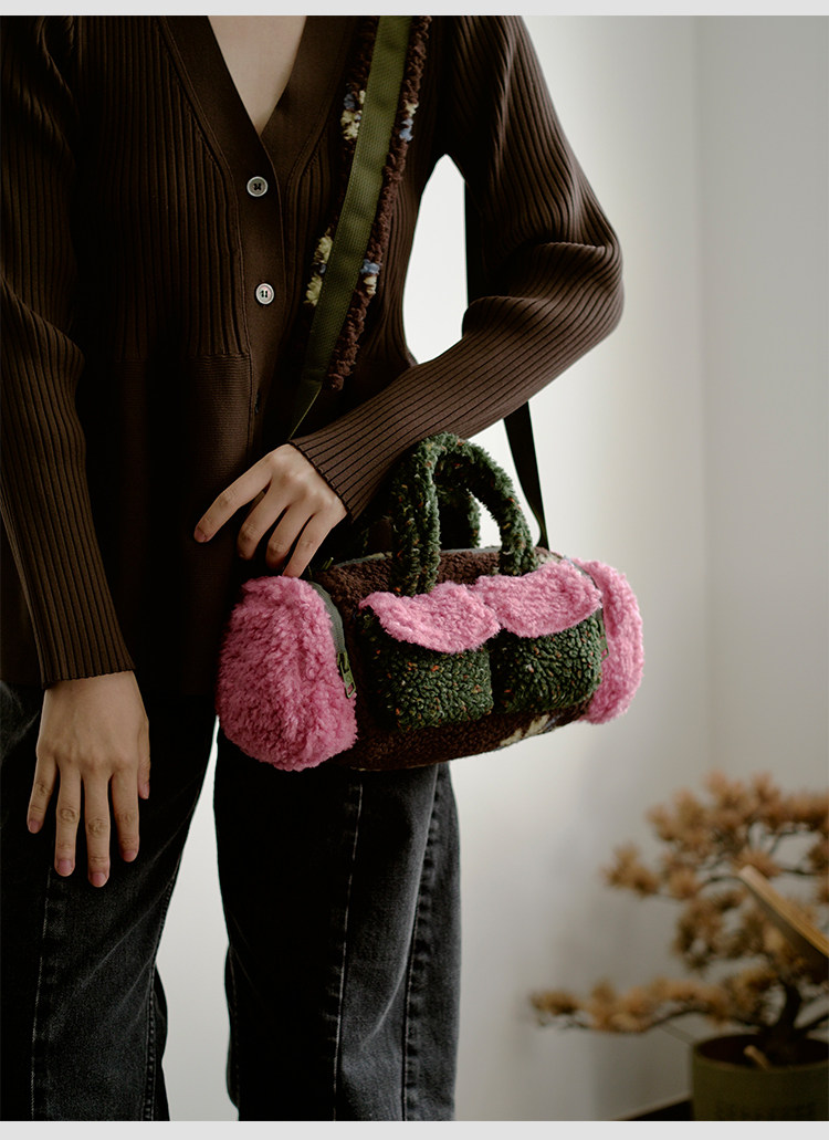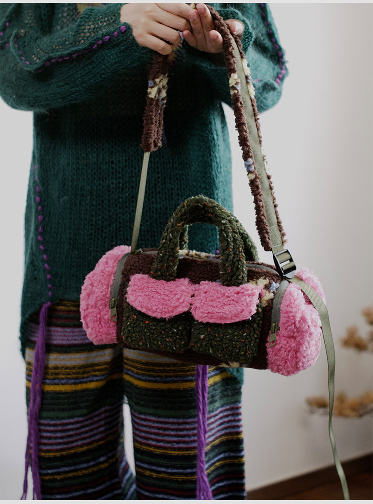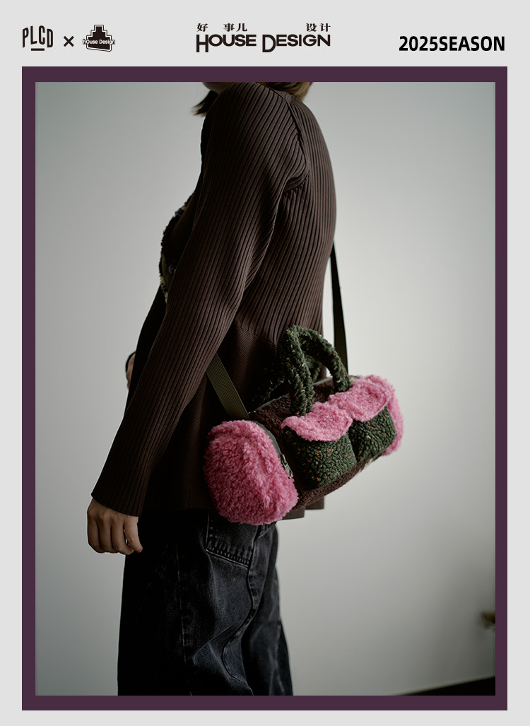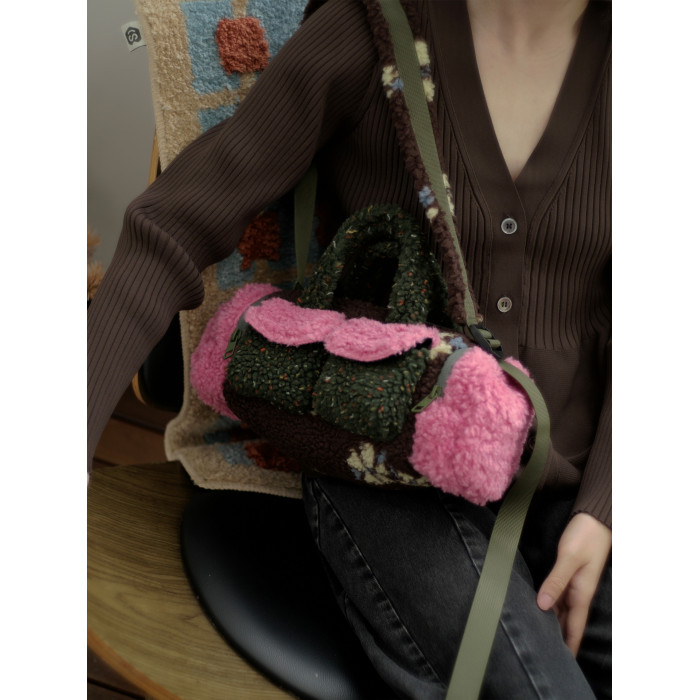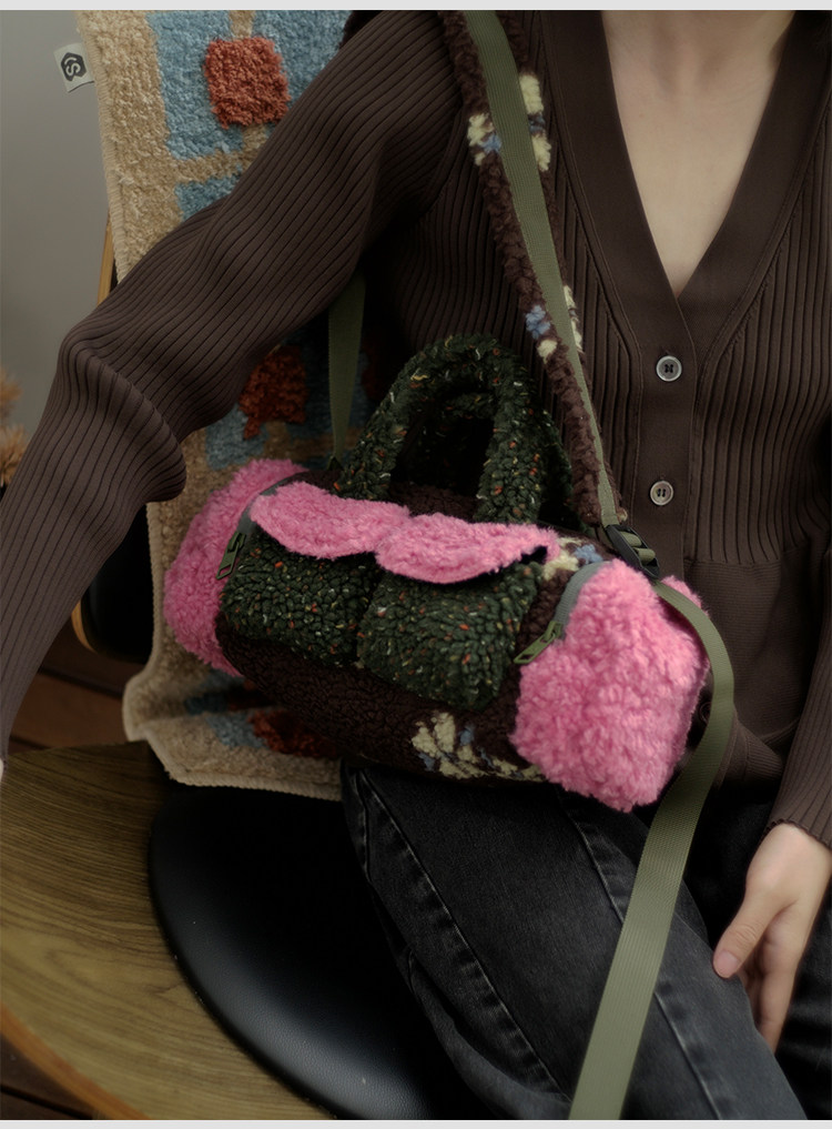 housedesign原創新拼色毛毛斜後後背包2025冬小衆時尚毛絨波士頓包女
