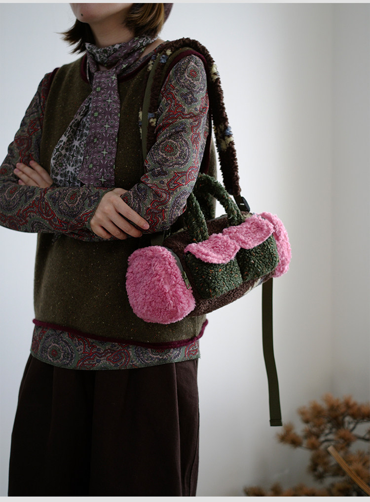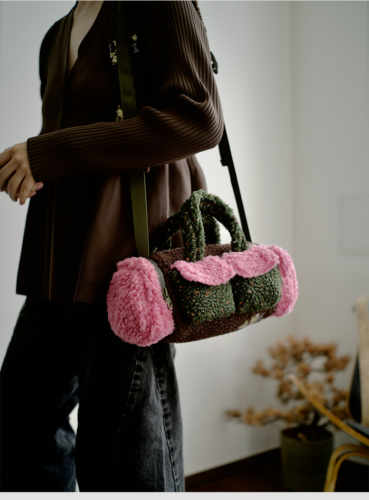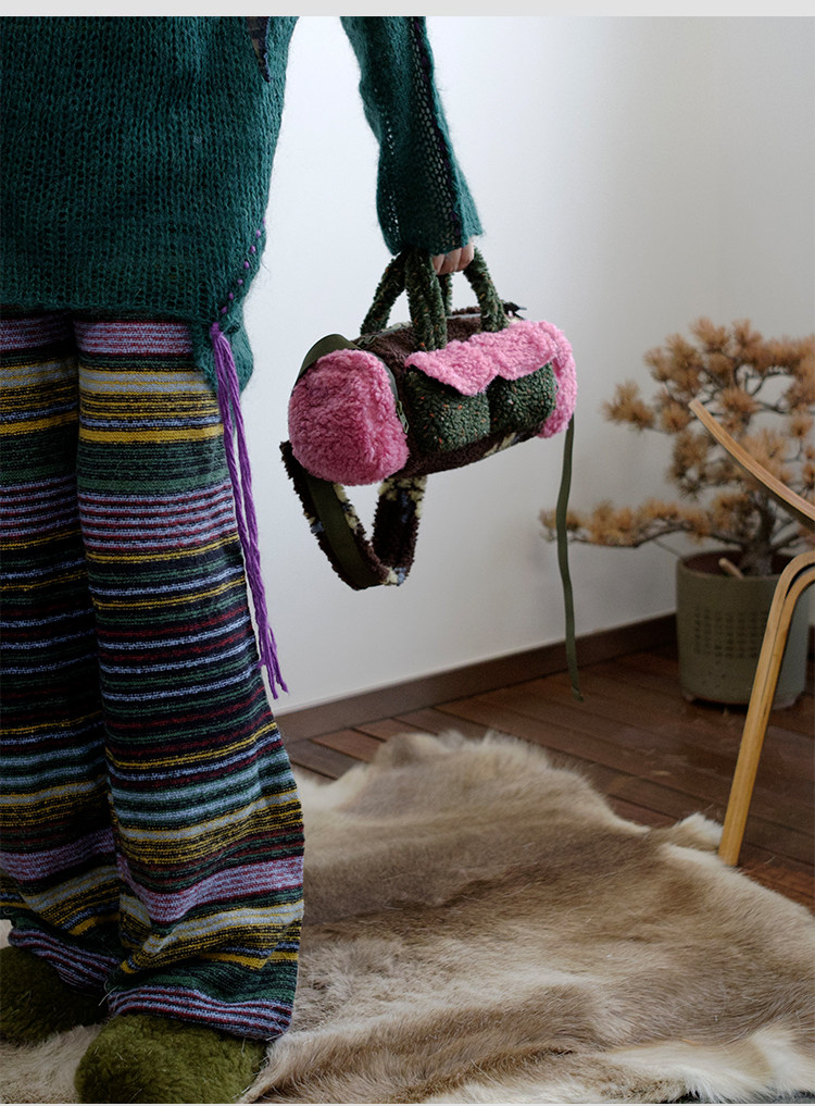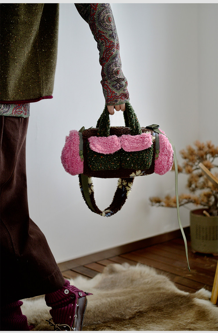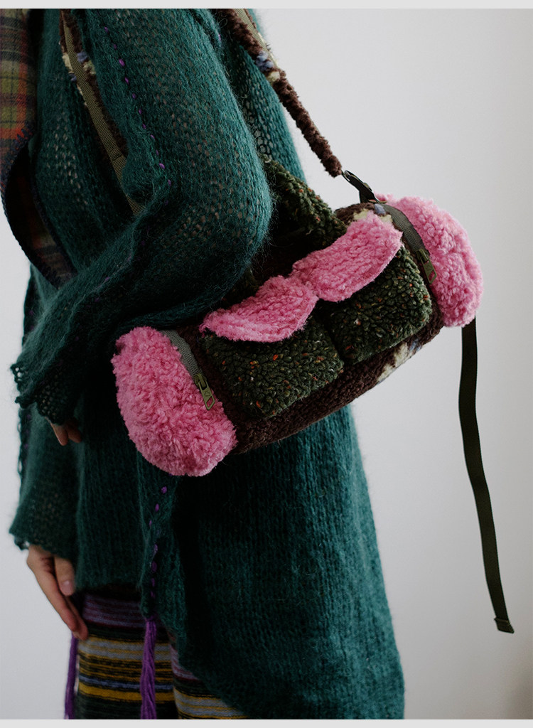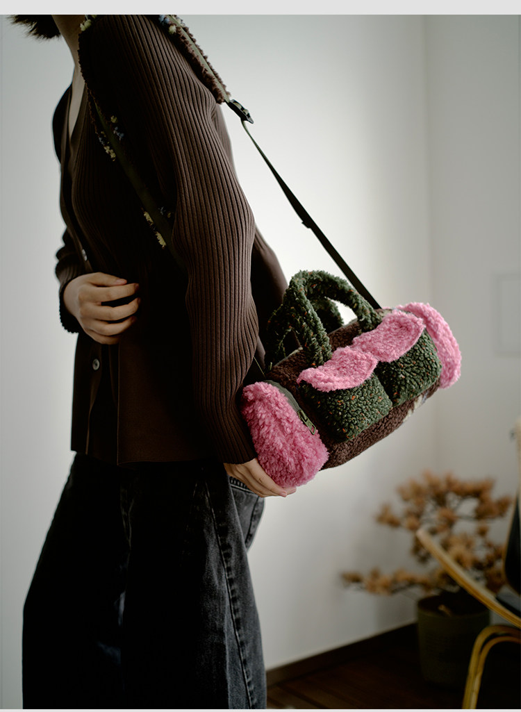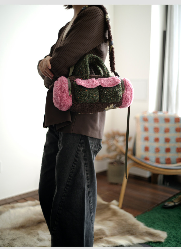 housedesign原創新拼色毛毛斜後後背包2025冬小衆時尚毛絨波士頓包女