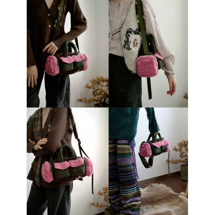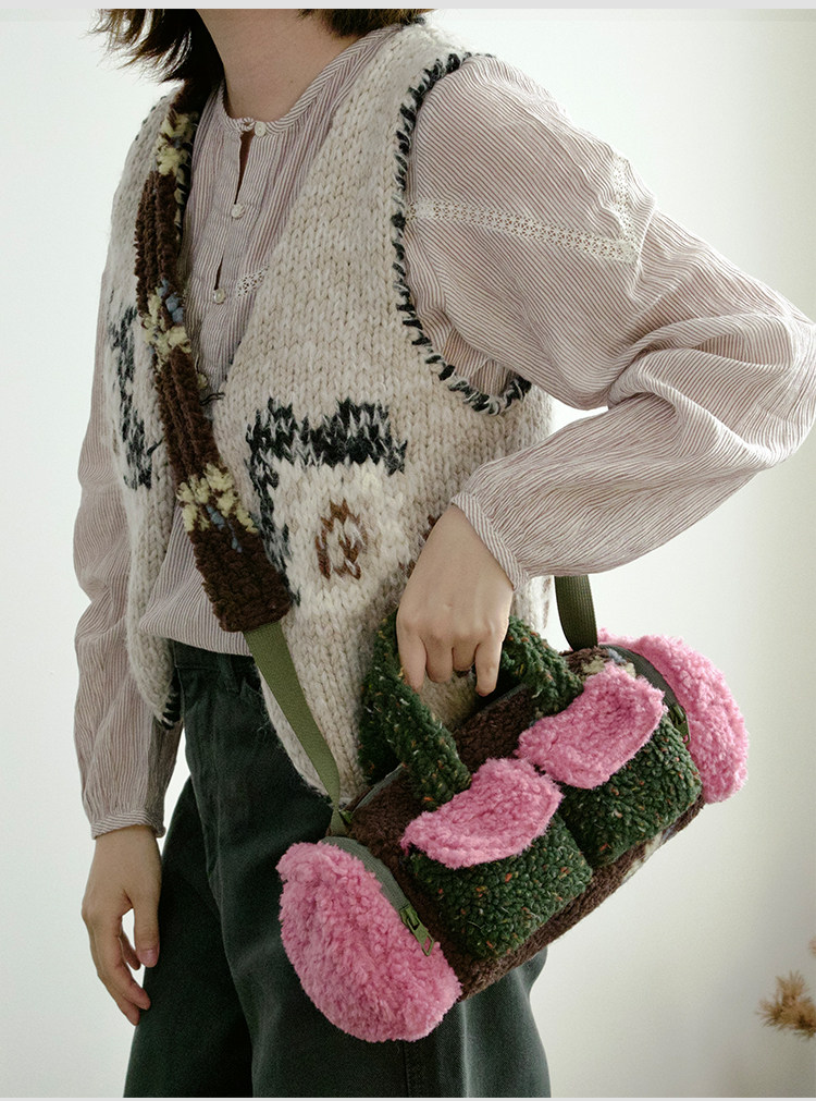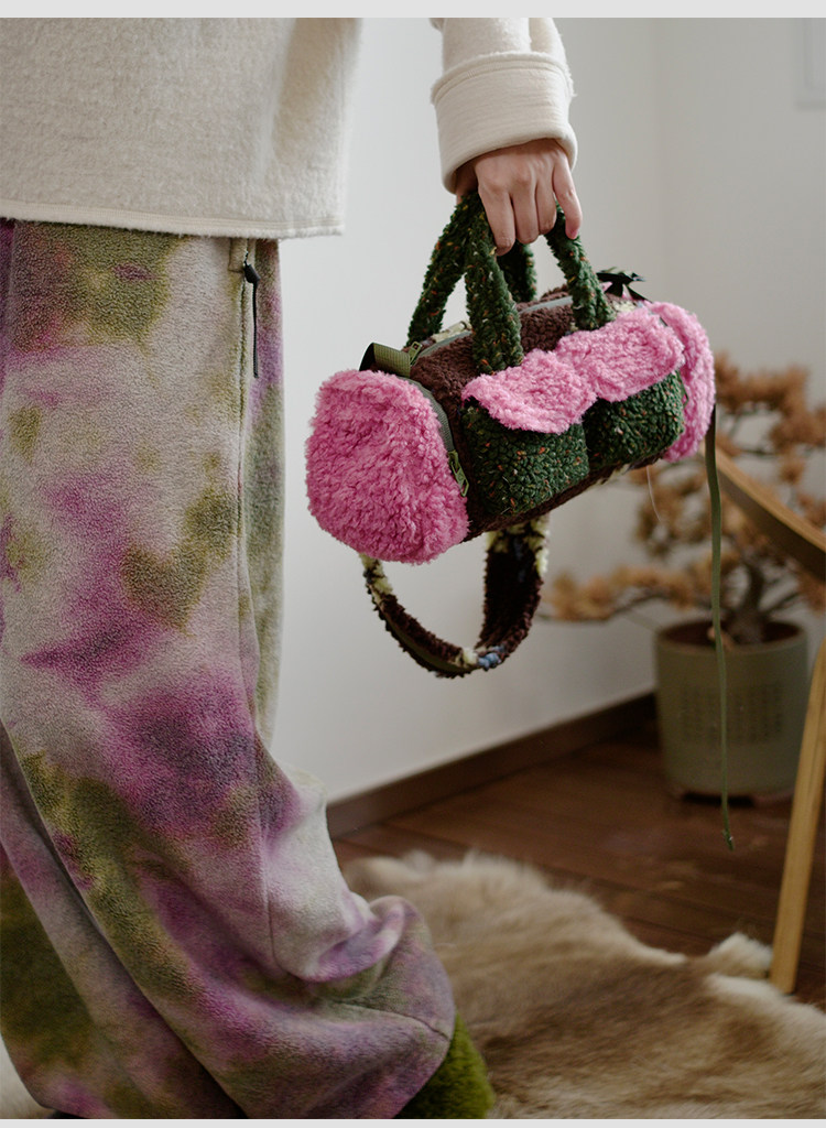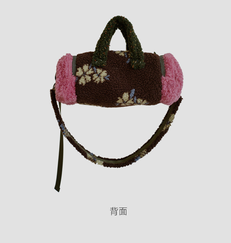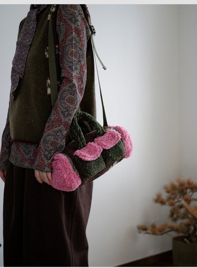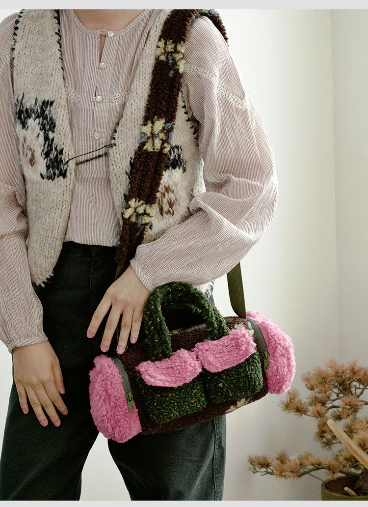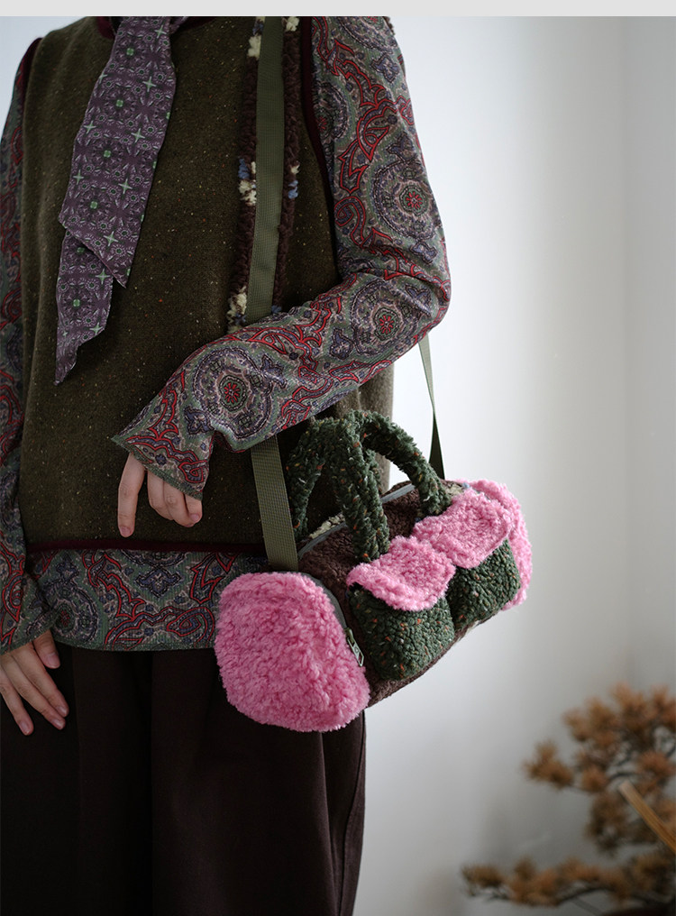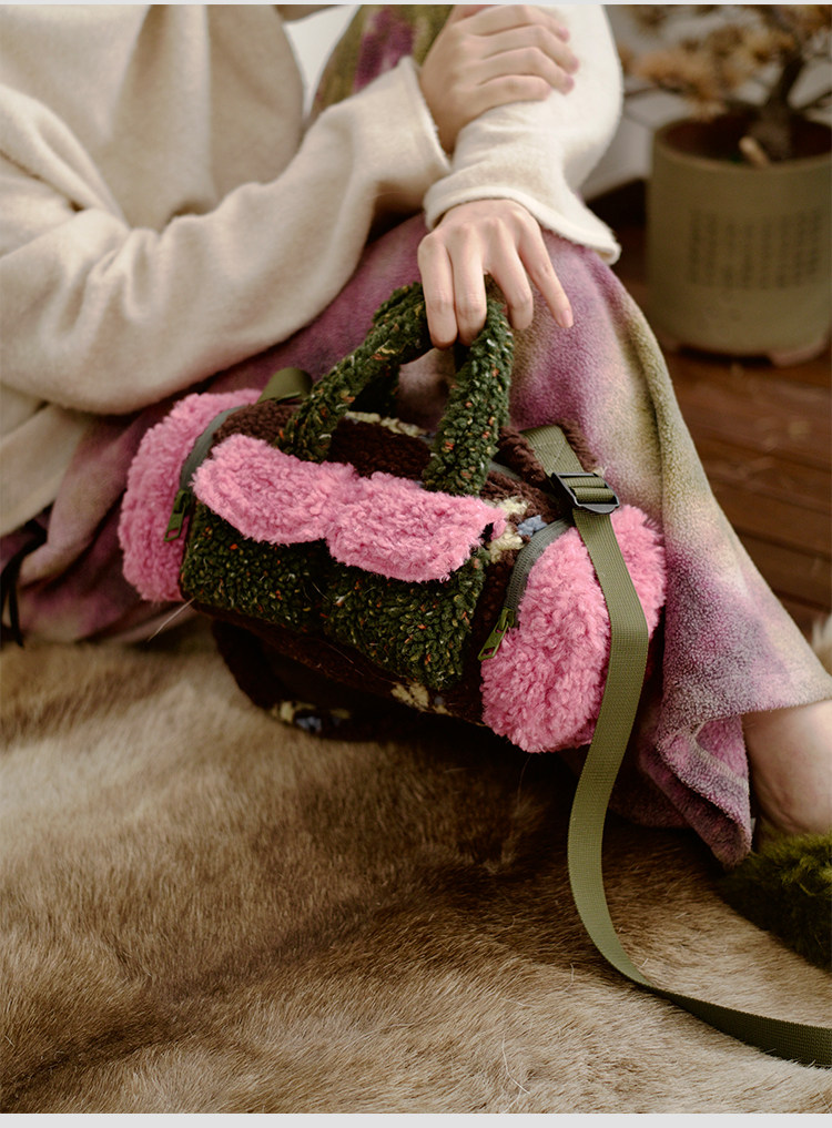 housedesign原創新拼色毛毛斜後後背包2025冬小衆時尚毛絨波士頓包女