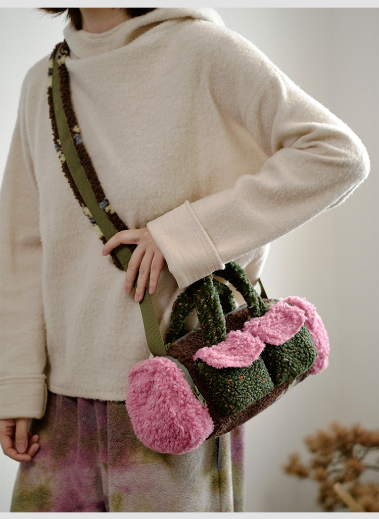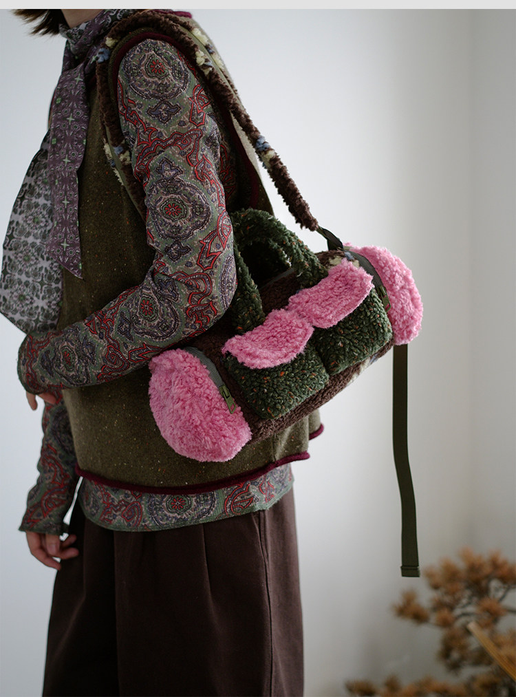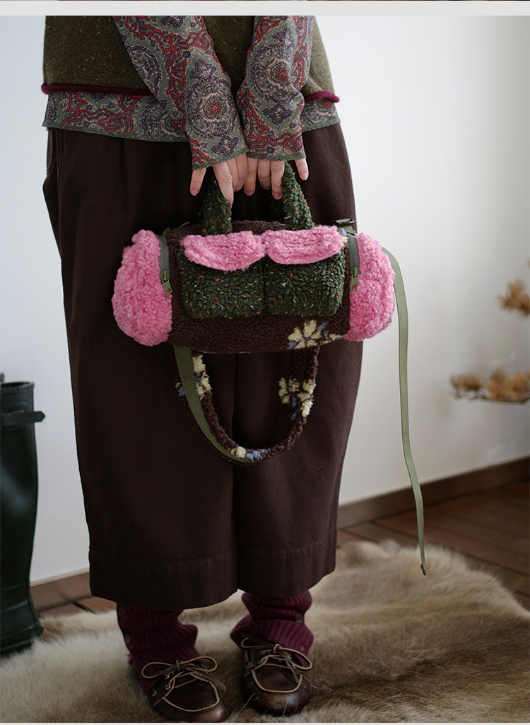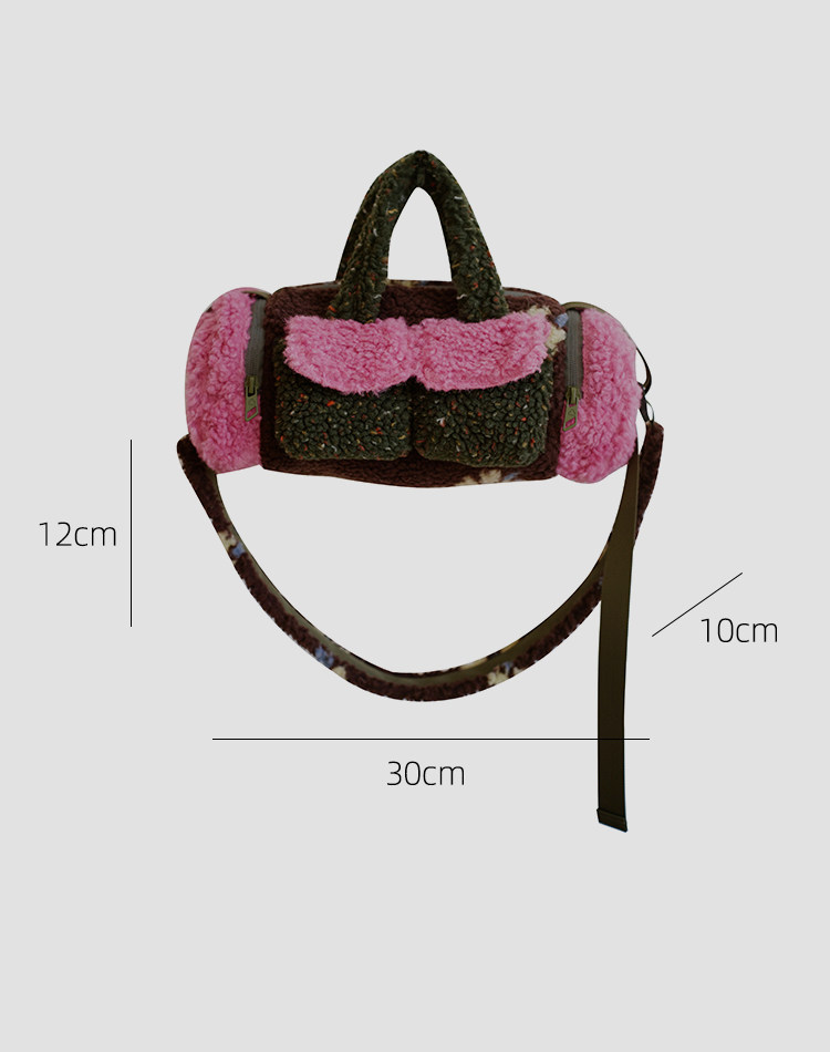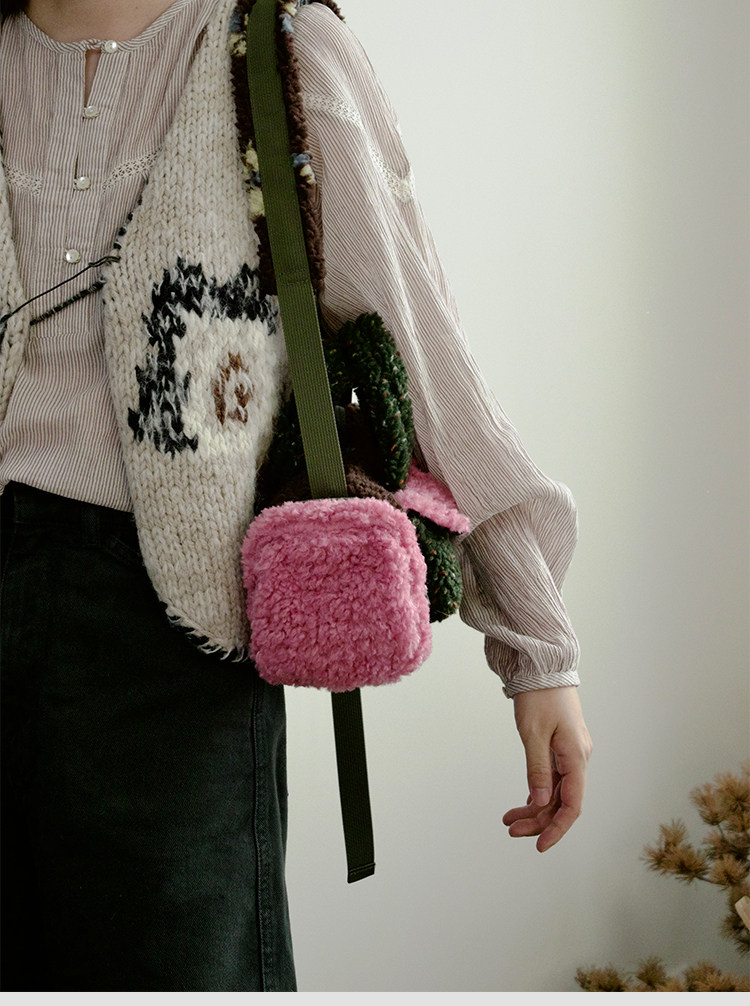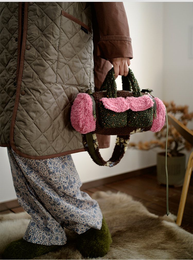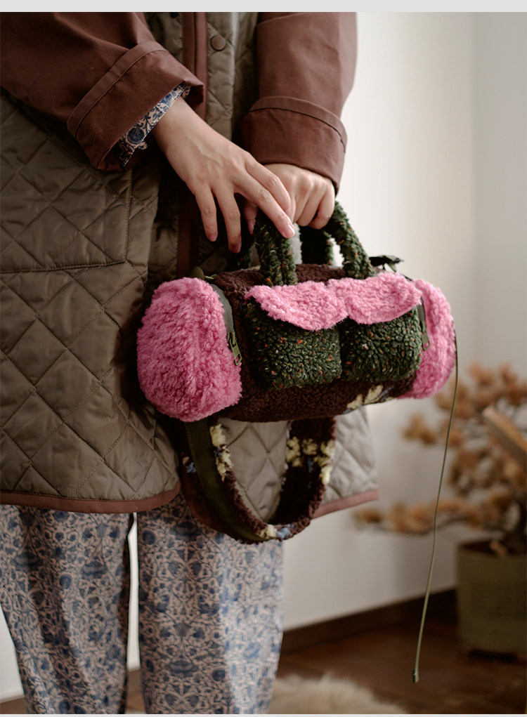 housedesign原創新拼色毛毛斜後後背包2025冬小衆時尚毛絨波士頓包女