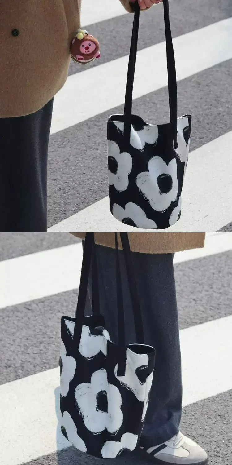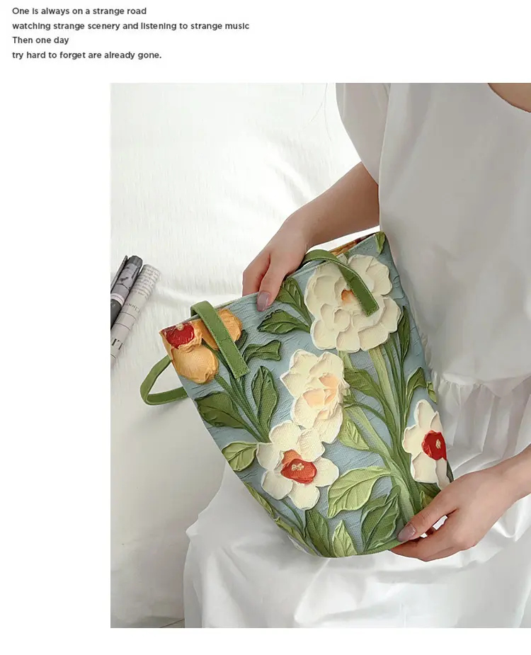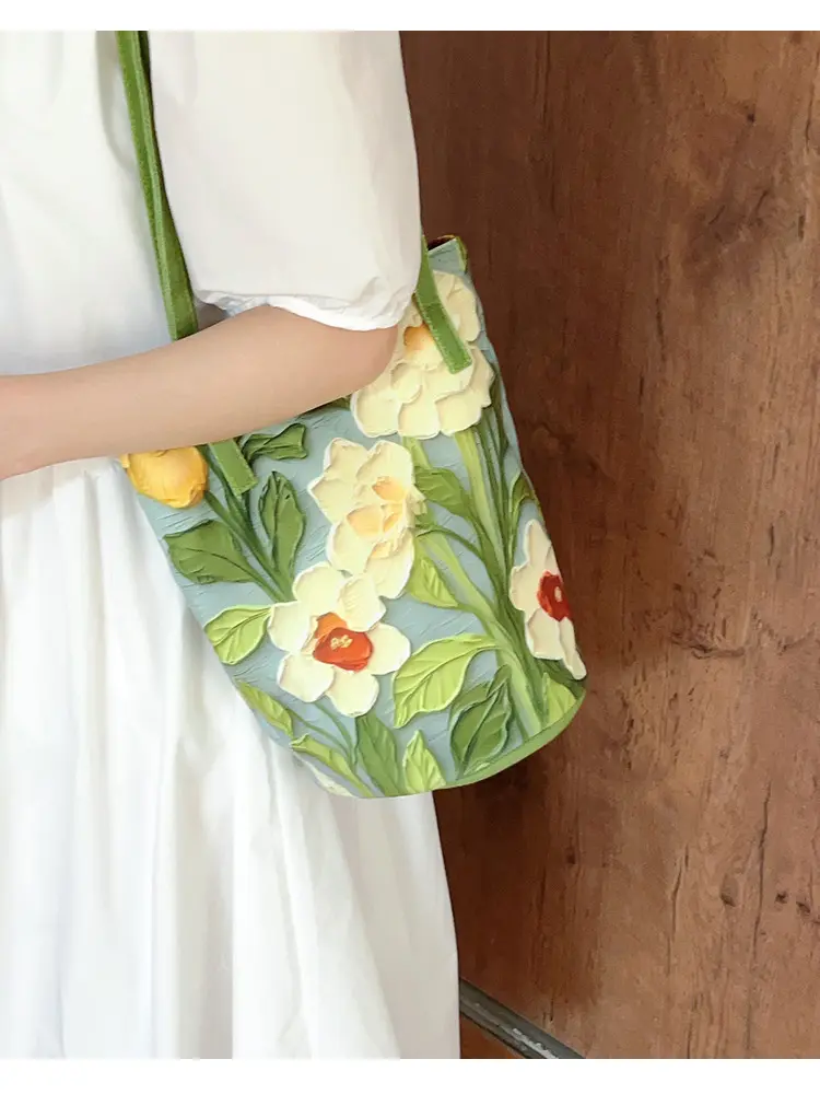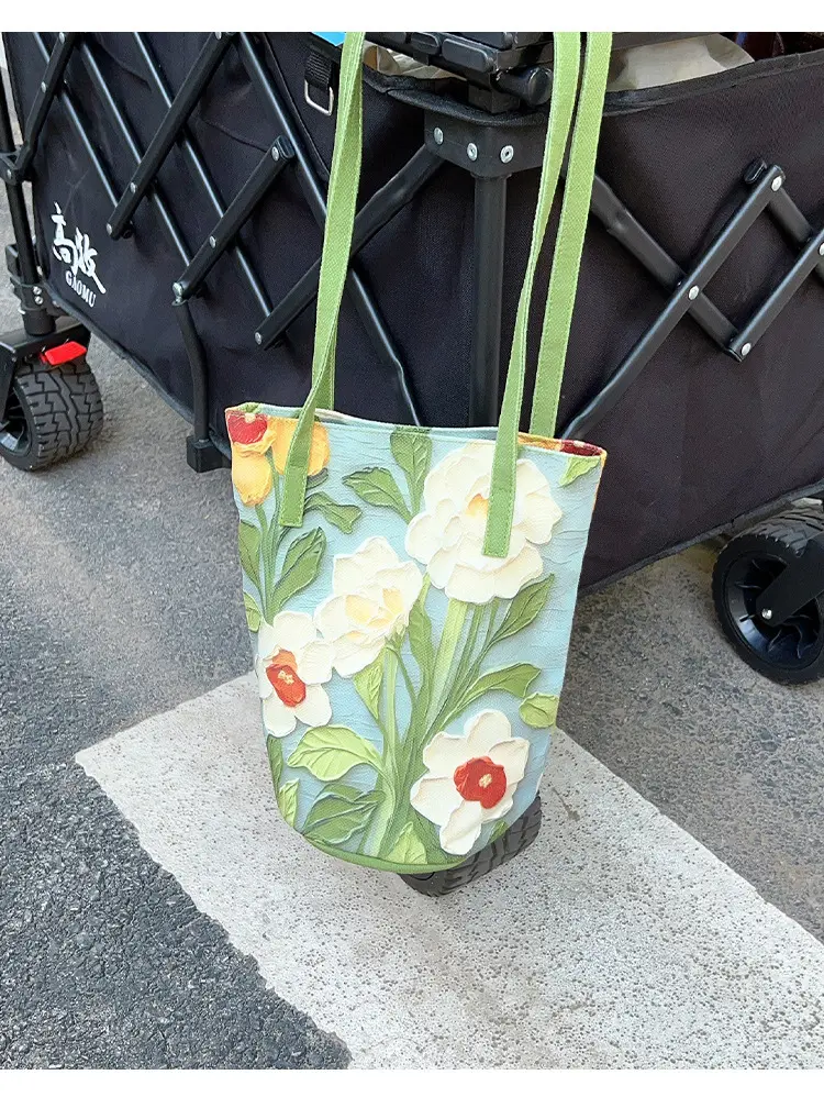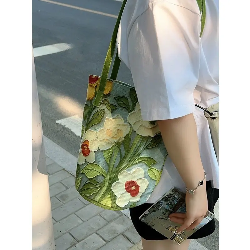 2024新外出手拎包油畫花卉小衆高級感單肩布包女大容量通勤水桶包