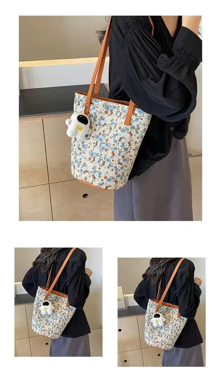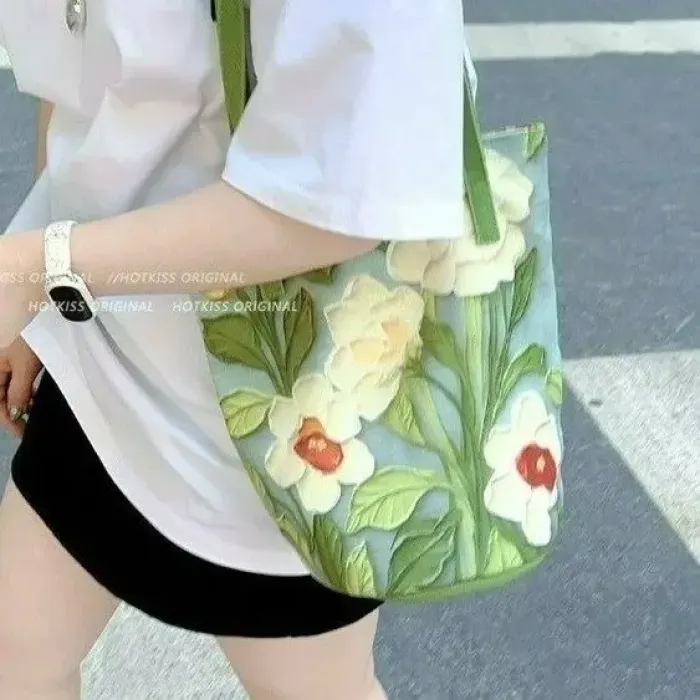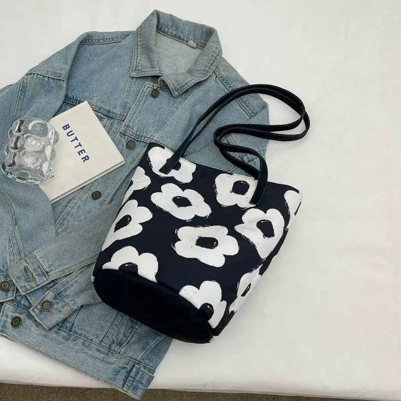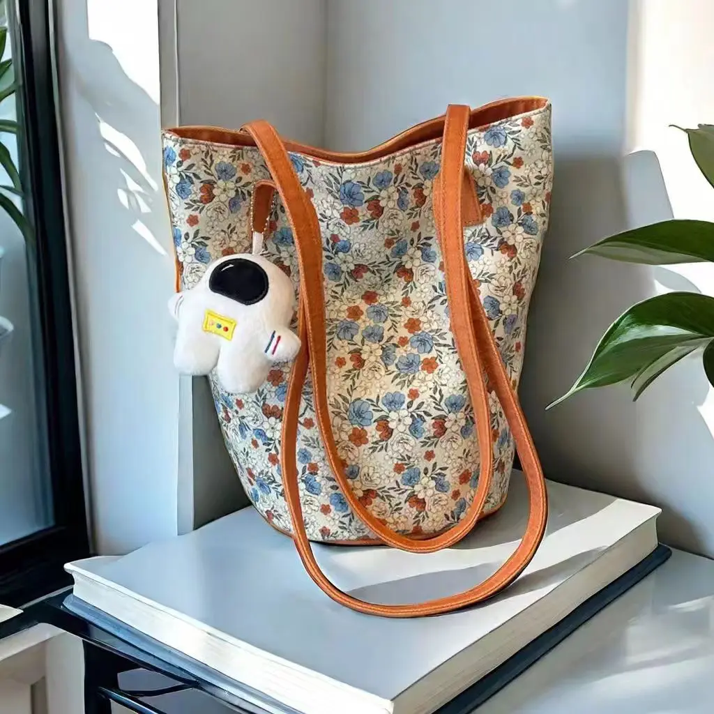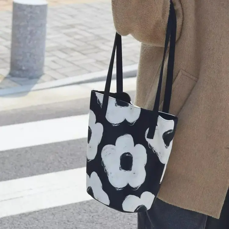 2024新外出手拎包油畫花卉小衆高級感單肩布包女大容量通勤水桶包
