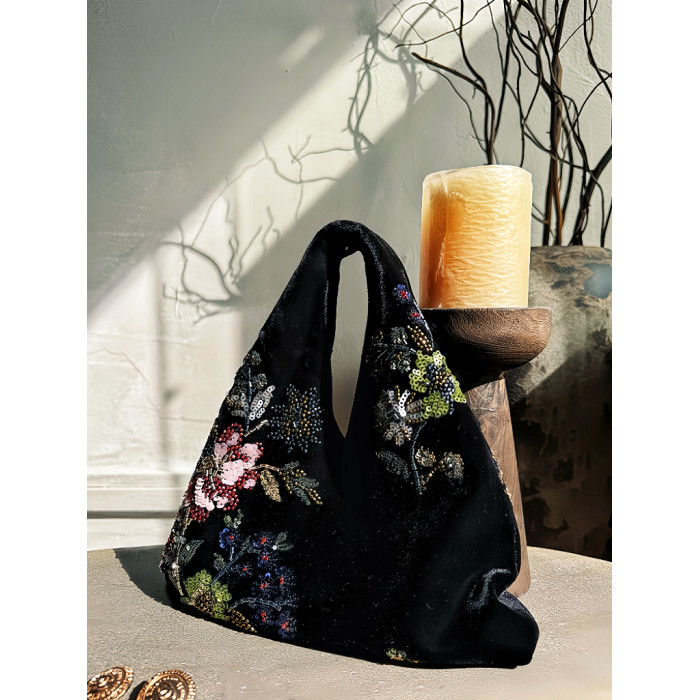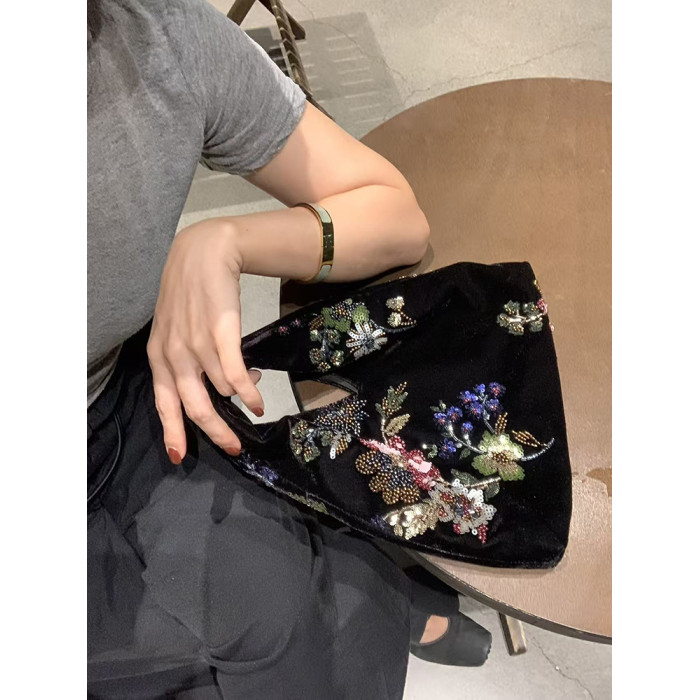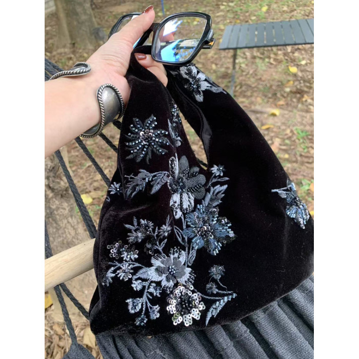 新中式亮片絲絨手提包女士2026年春季新款復古釘珠刺綉百搭手拎包